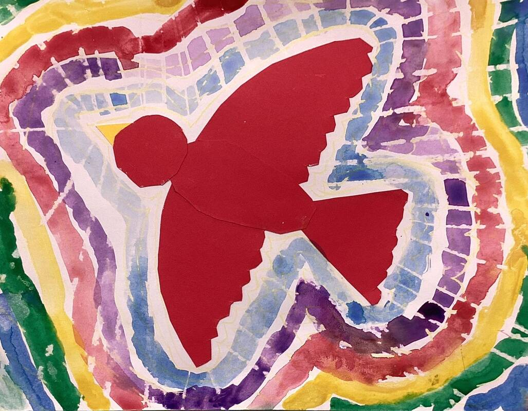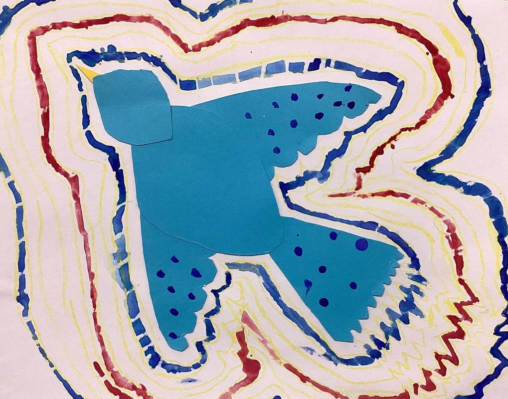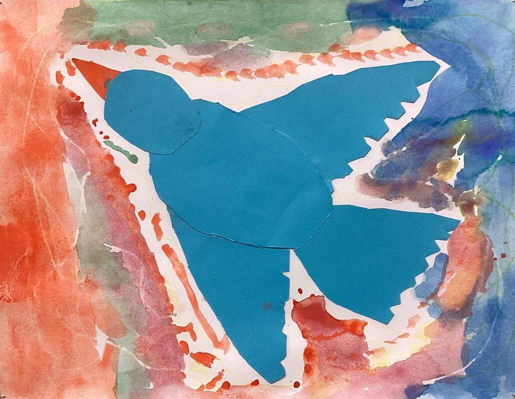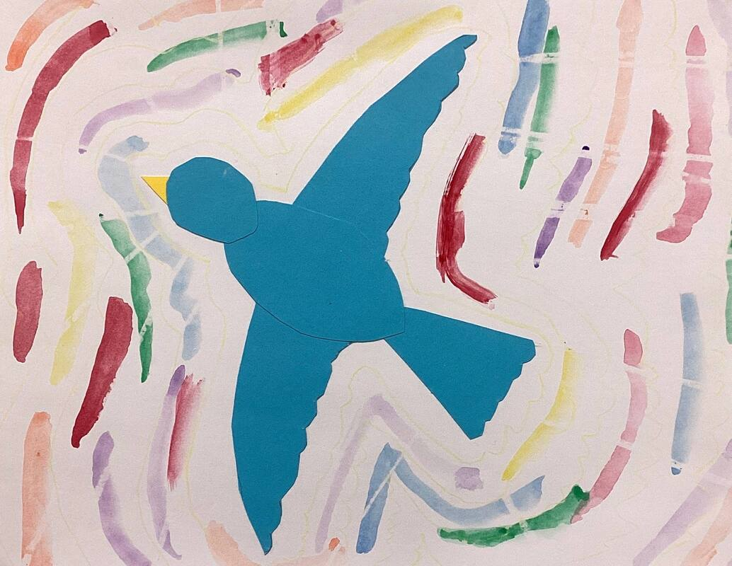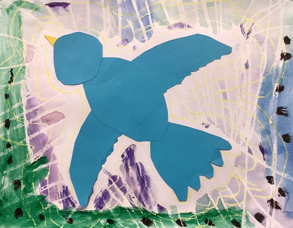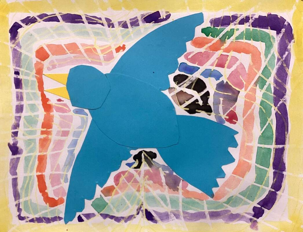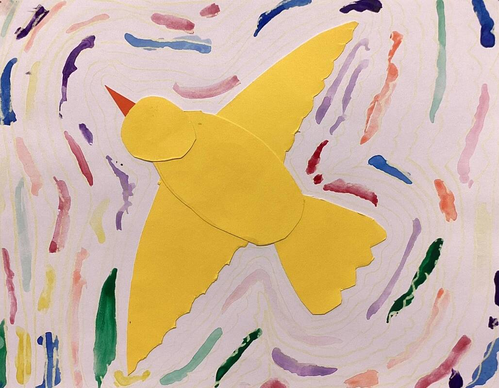 Watercolor paintings centered around paper bird constructions were recently created by 2nd grade art students. Sections of the paper birds were drawn, cut, and assembled with glue. Watercolored areas and linear crayon patterns in the sky echo the shapes of the birds and help unify the compositions.