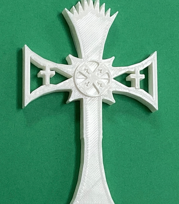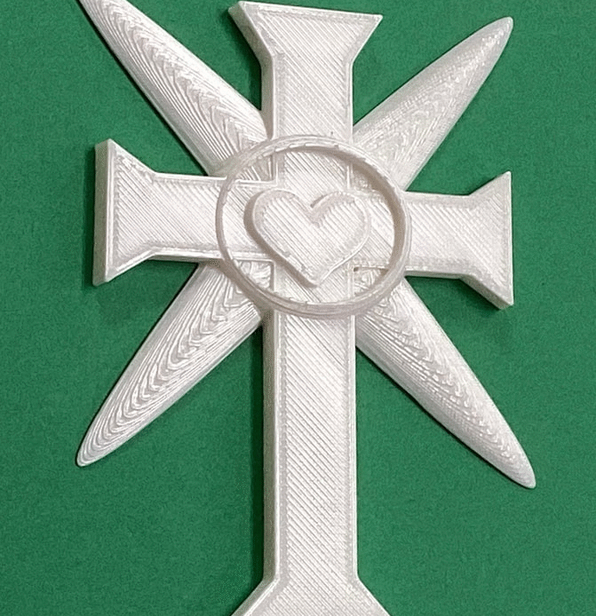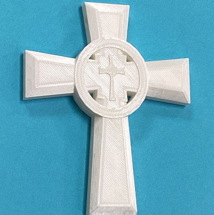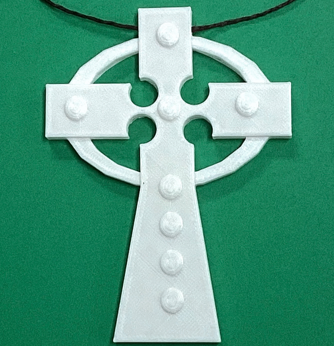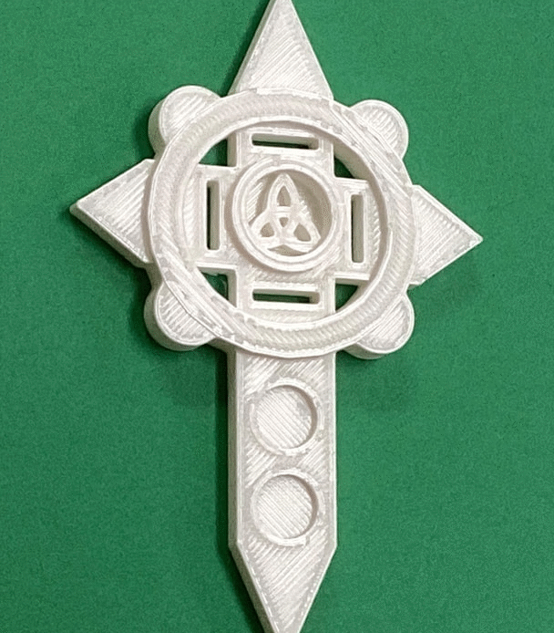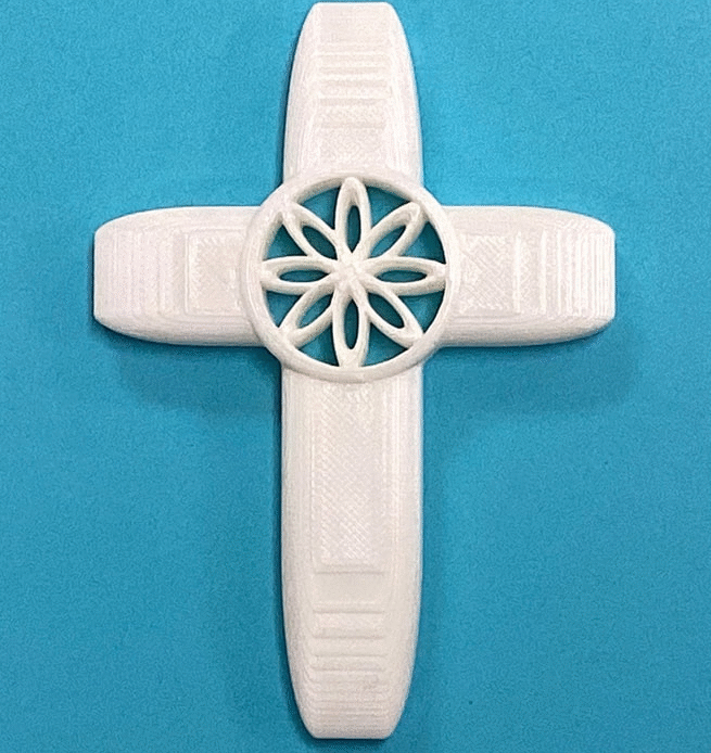 Near the end of their first quarter Art Tech classes, eighth graders designed cross pendants with the Tinkercad computer-aided design app on their iPads. Completed designs have been 3D printed. A hole for inserting a string or thin chain was designed into the upper section of each cross. The photo of the cross by Jules shows a string that passes through the top section. It has a jewelry latch at the ends of the string that is not shown in the photo.