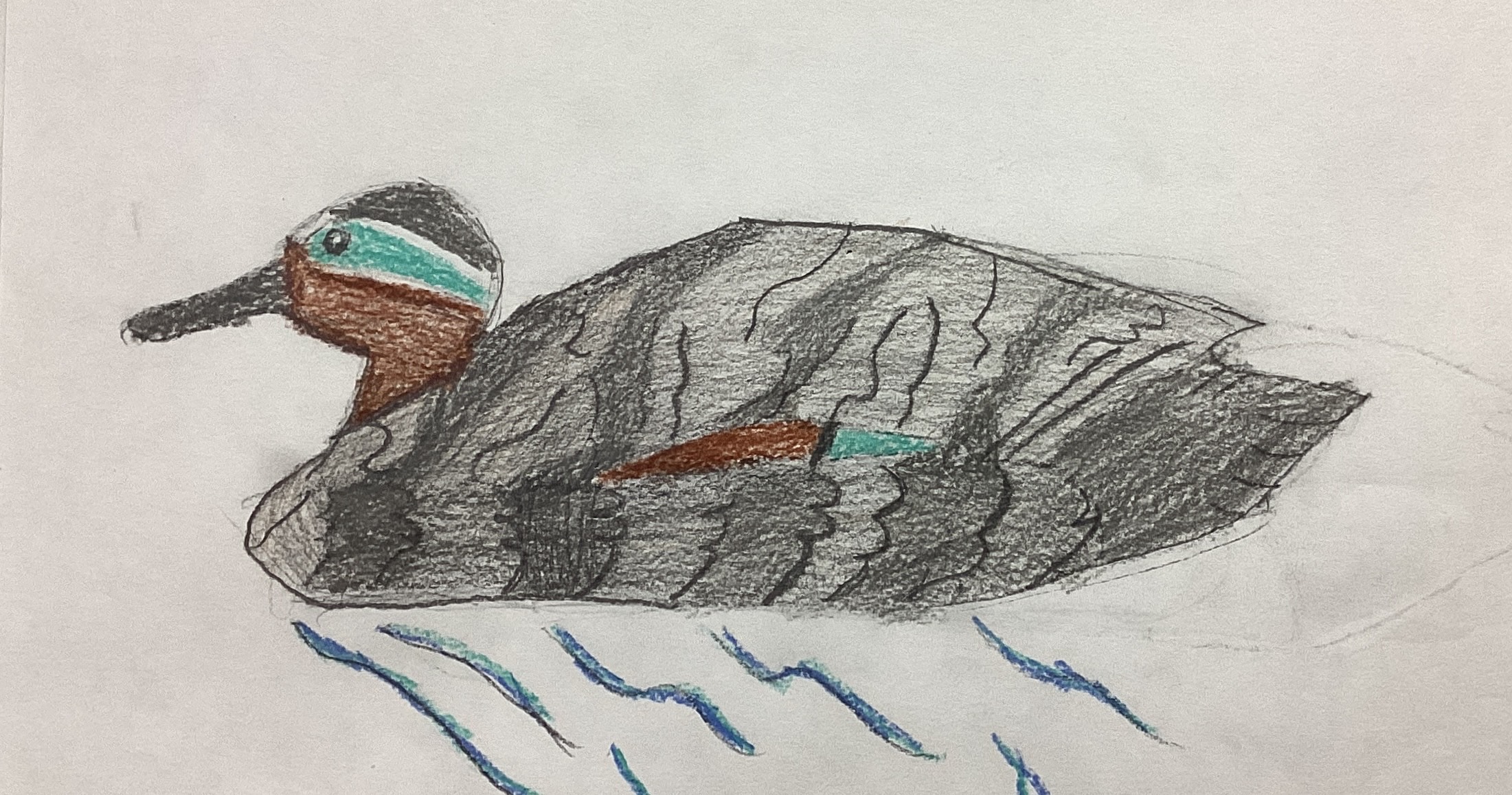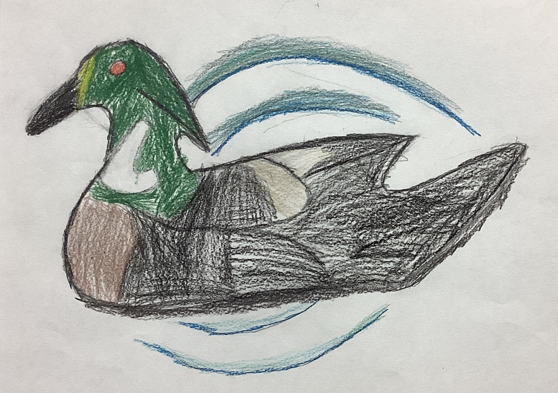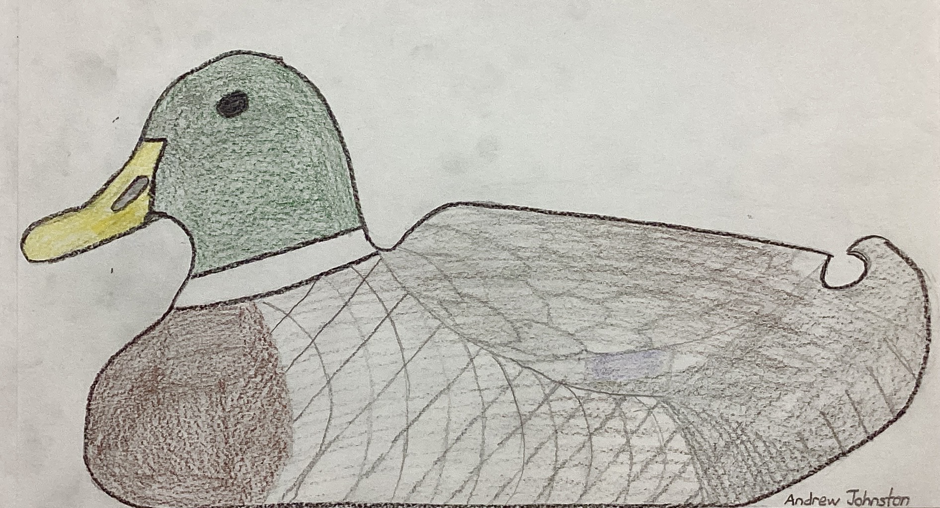 Fourth grade art classes recently had a lesson in drawing duck decoys. The pictures shown here are students’ interpretations of plastic duck decoys that were positioned on tables in the Spiritual Life Center of our Church. The drawing that appears above is by Declan Hildebrand.