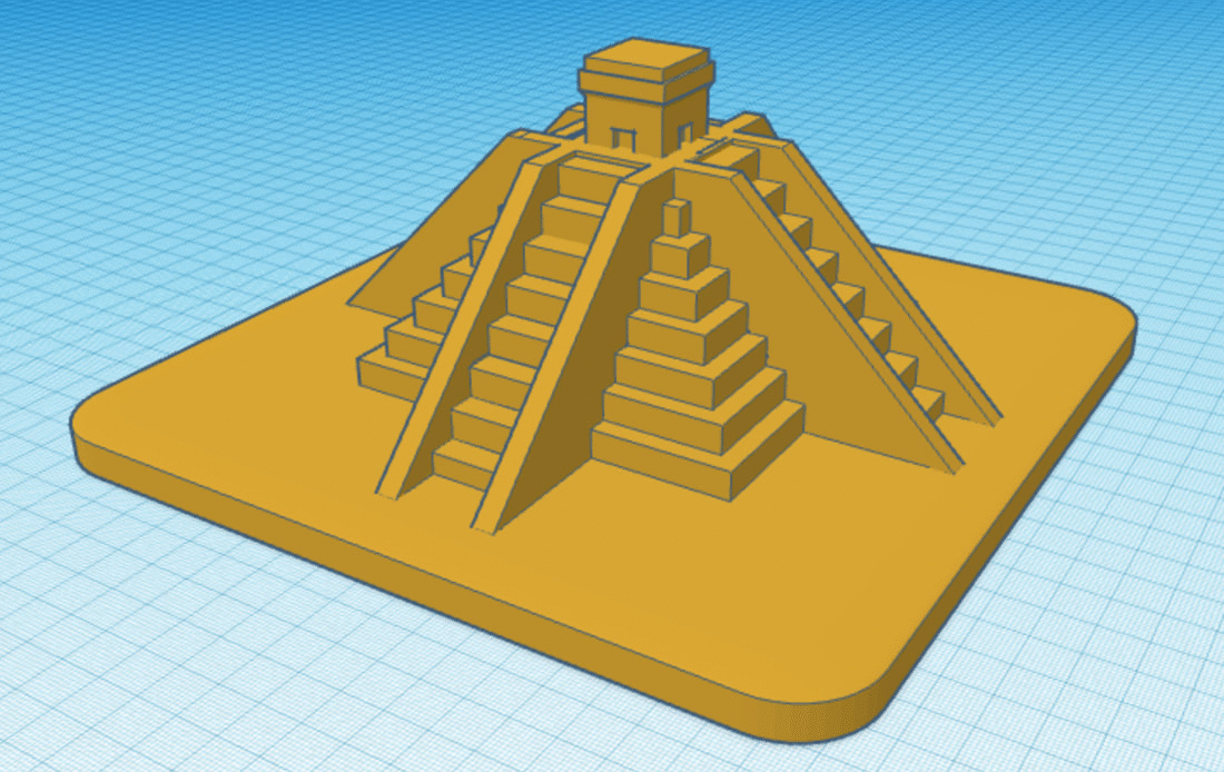 Some sixth graders are making 3D-printable Tinkercad models of Mesoamerican pyramids for a project in Mr. Melton’s Social Studies class. Mr. Bell is assisting with technical instruction. The pyramid shown here (as both a Tinkercad design and 3D print) by Landon Leitz was inspired by the Toltec-Mayan pyramid, El Castillo, which is located in the Chichen Itza Mayan ruins of Mexico’s Yucatan peninsula.