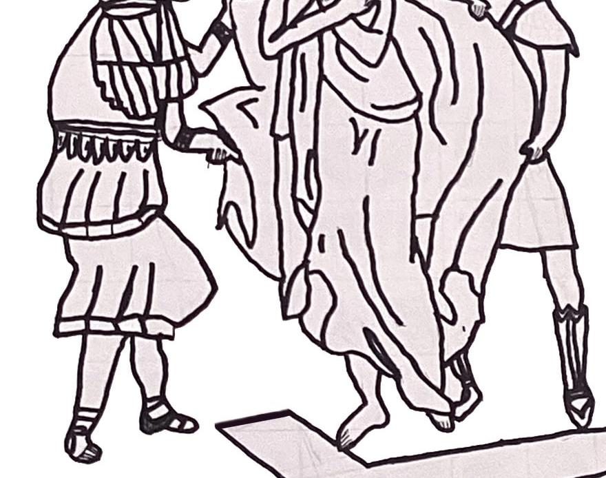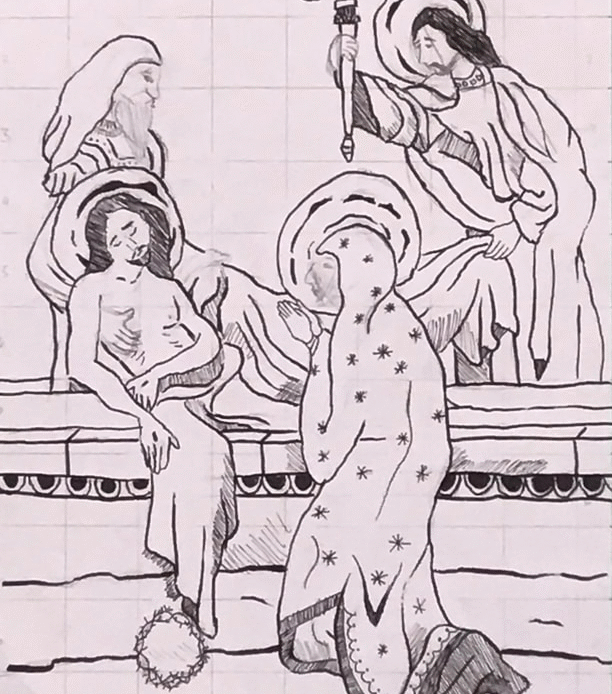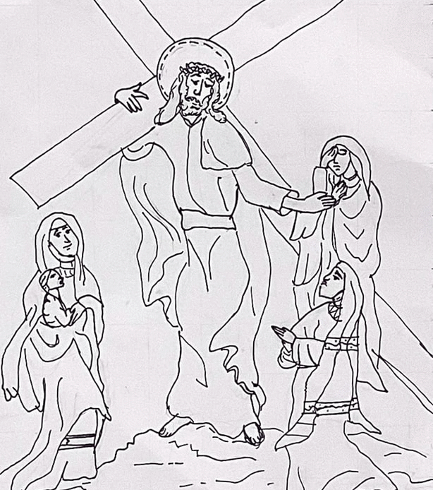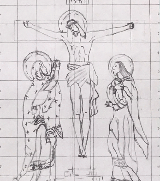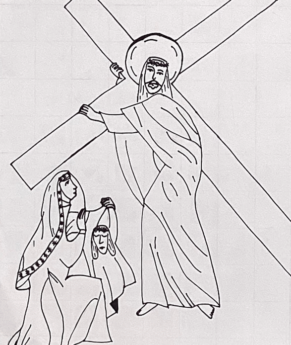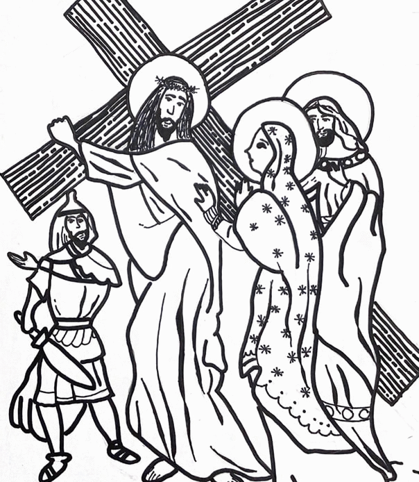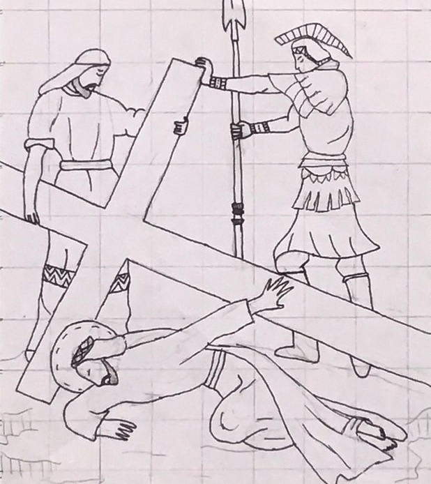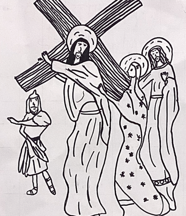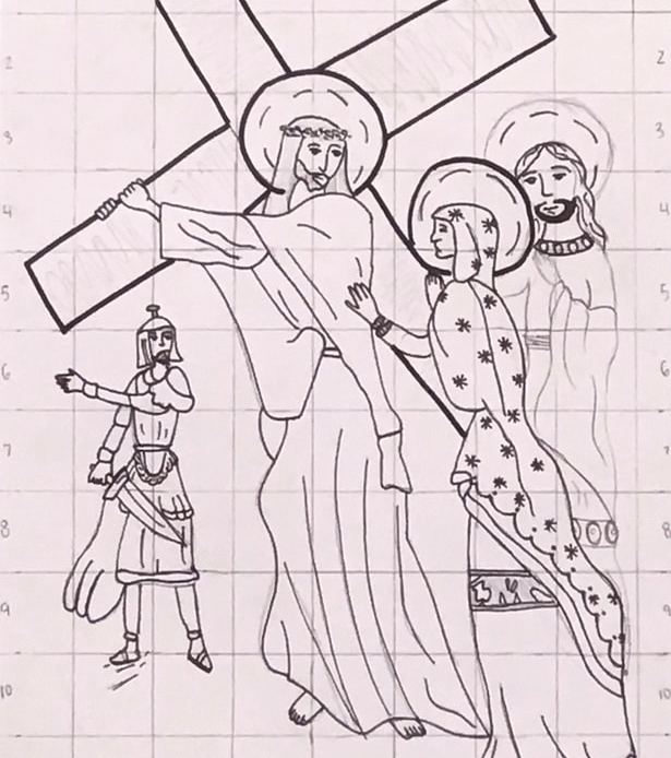 8th graders in art tech class continue to advance on their Stations of the Cross pencil and pen drawings, which they will soon develop into colorful digital images. Grids and pencil marks are visible in some of the drawings shown here, while some have black marker pen lines and white spaces that have been electronically “cleaned up” in the Sketchbook app on students’ iPads. Although our students employ modern electronic technology to develop their images, the basis of their work on this project is the ancient drawing method of carefully observing and analyzing a subject, and using tools (pencil and pen) to transfer visual information to a physical surface (cardstock).