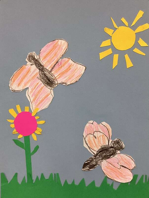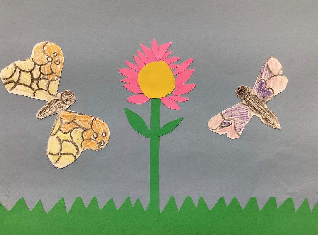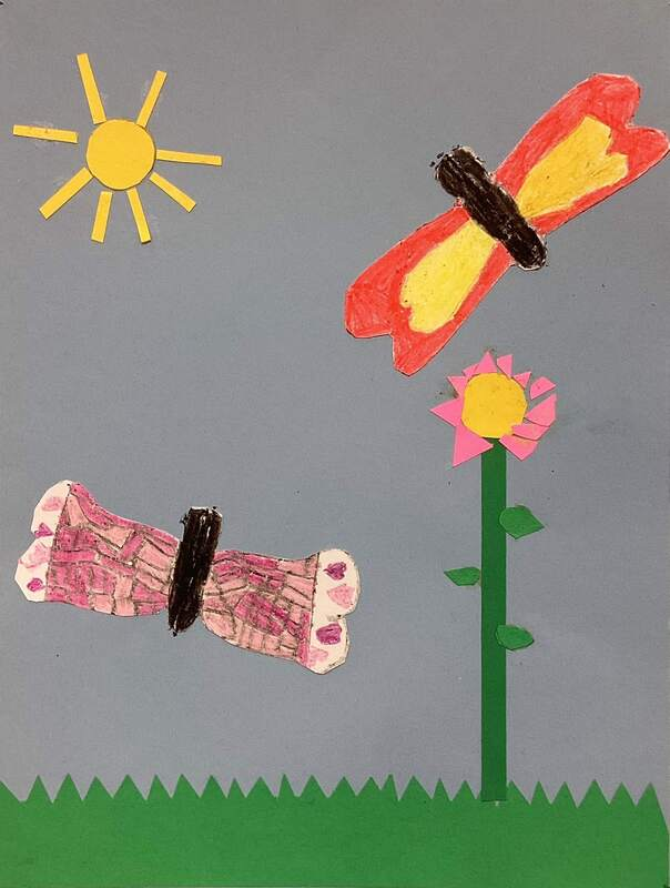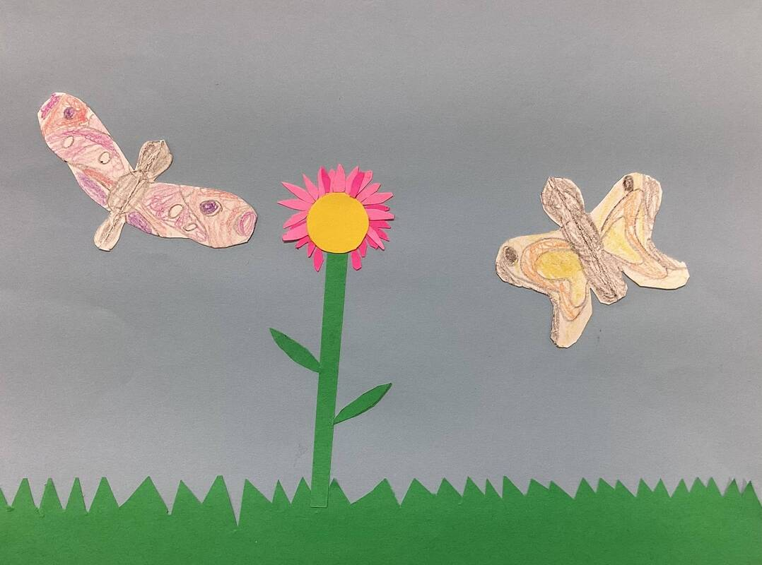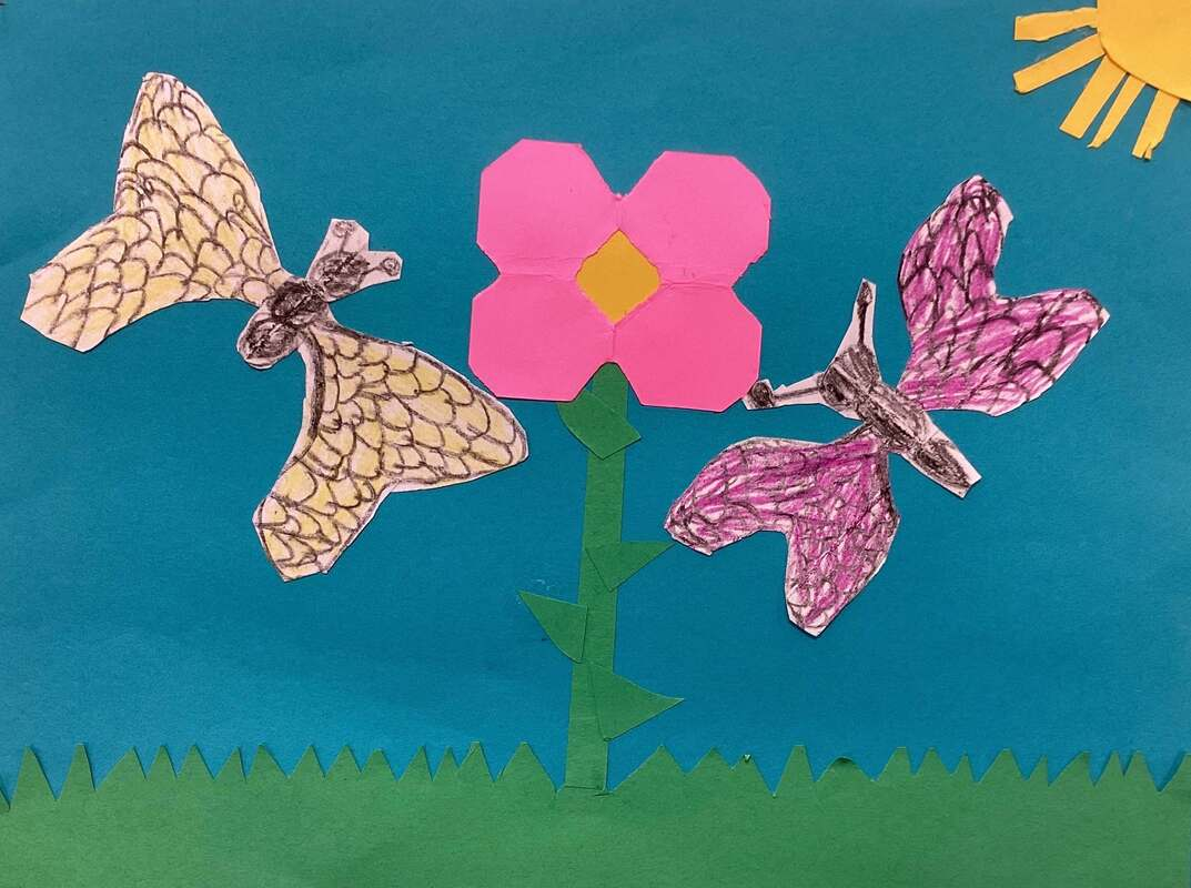 First grade art students have learned about symmetry by drawing half of a butterfly on a folded piece of paper, cutting it out, and then unfolding it. Crayons were used to color the butterflies. Flowers and other landscape components were made with cut colored paper. Students used glue sticks to affix the butterflies and the other objects to a background paper.