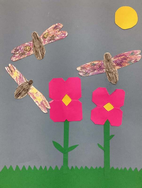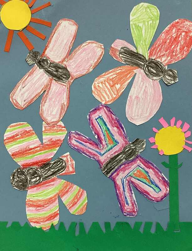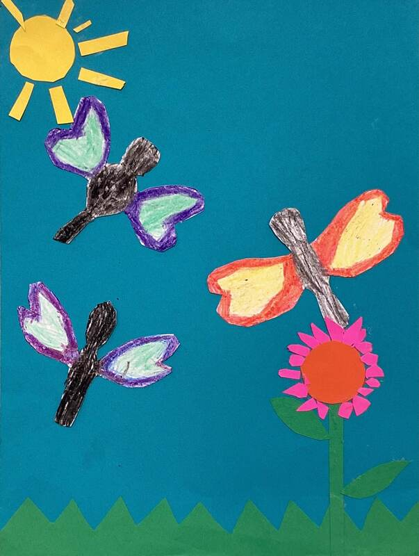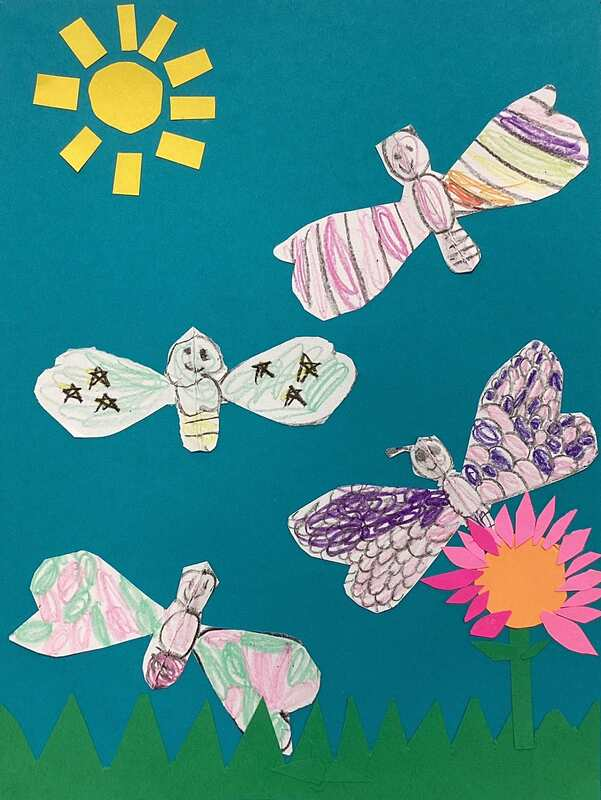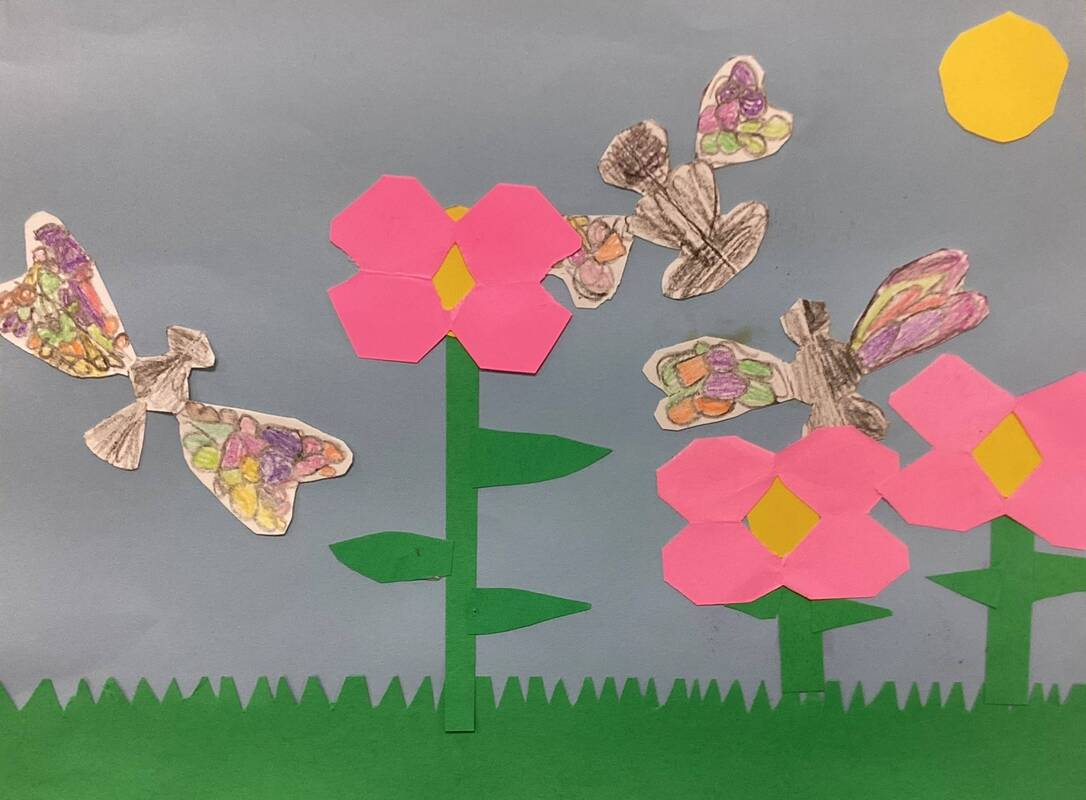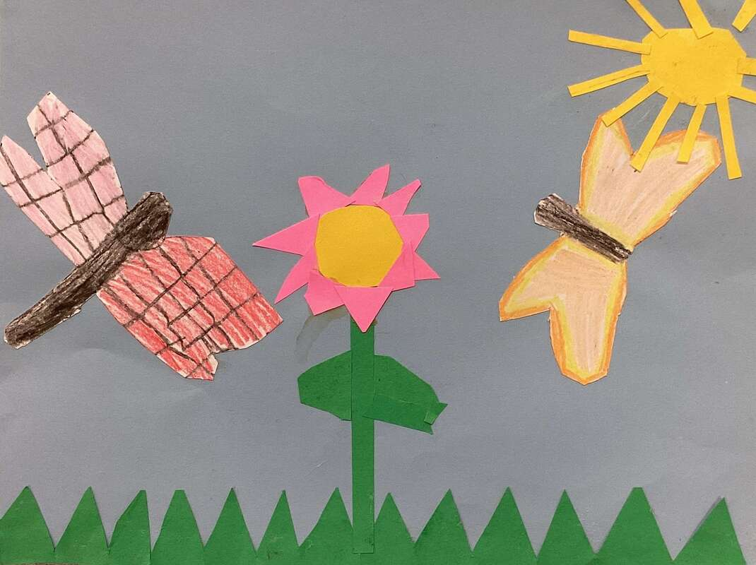 First grade art students have learned about symmetry by drawing half of a butterfly on a folded piece of paper, cutting it out, and then unfolding it. Crayons were used to color the butterflies. Flowers and other landscape components were made with cut colored paper. Students used glue sticks to affix the butterflies and the other objects to a background paper.