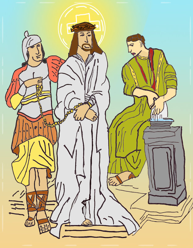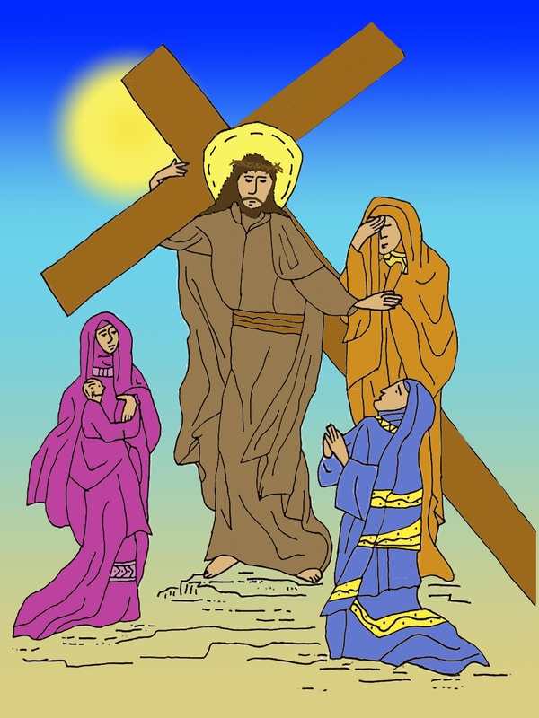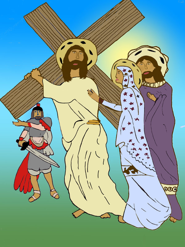 For the 8th grade Stations of the Cross project, the grid method was employed to create free-hand pencil and ink drawings which were colored and edited with the Sketchbook app on iPads. Students’ drawings are based on illustrations by contemporary artist Shari Van Vranken.