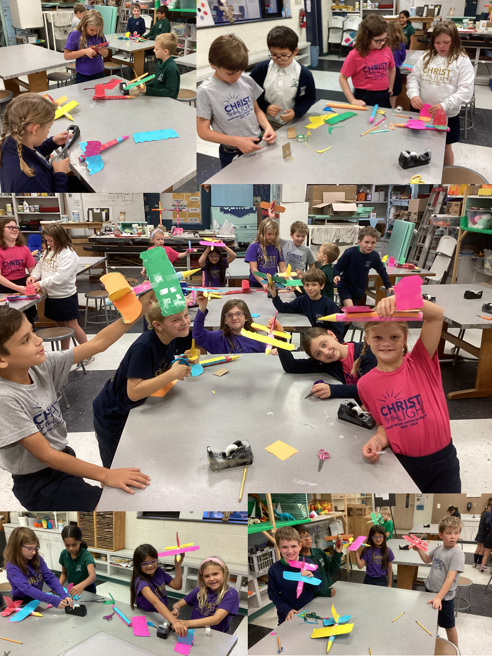 This week’s work from Mr. Bell’s Art Tech classes features 3rd grade airplanes, 5th grade origami, and the 8th grade Stations of the Cross project. A collage of photos shows 3D students as some have finished and others are finishing their paper and cardboard airplane sculptures. This multi-step geometry-based project develops spatial/structural reasoning abilities as students work to create airplanes with structural integrity (i.e., won’t fall apart when thrown). Students individualize their airplanes through their color choices and wing designs.
