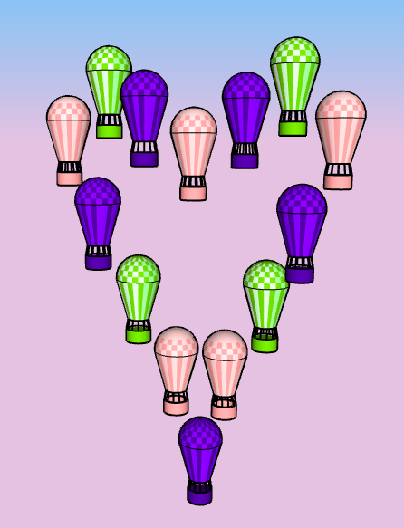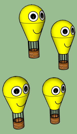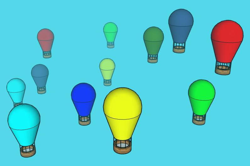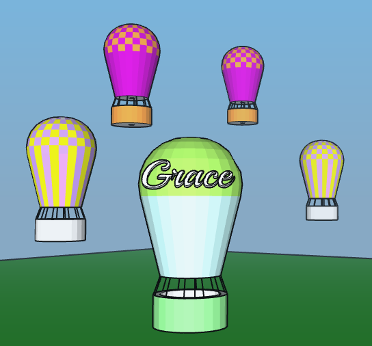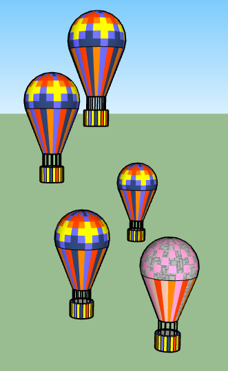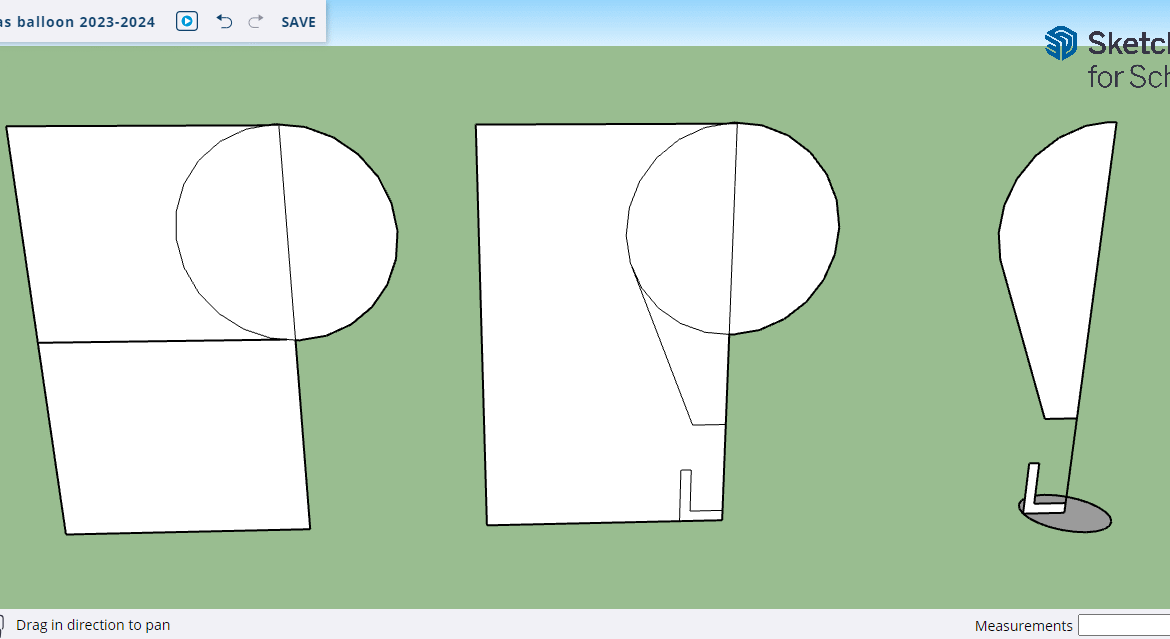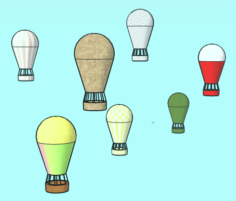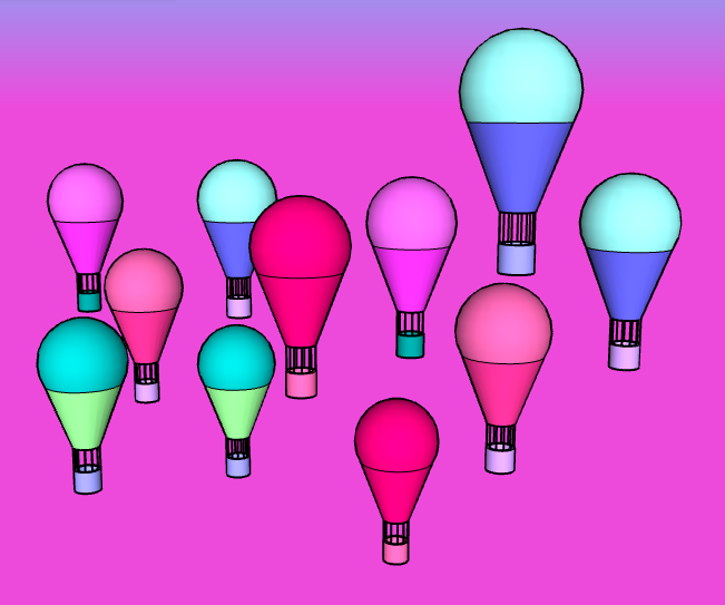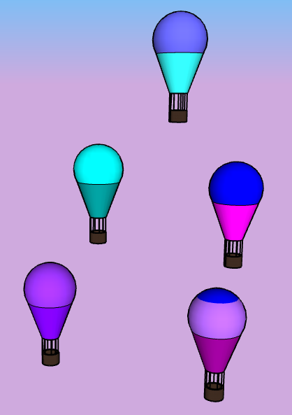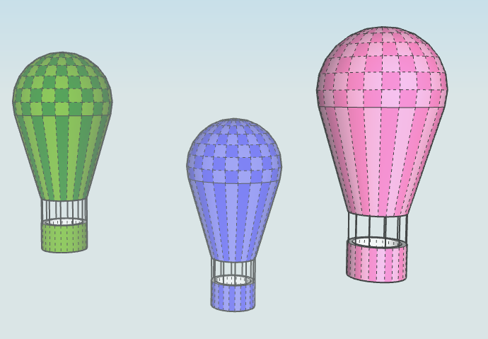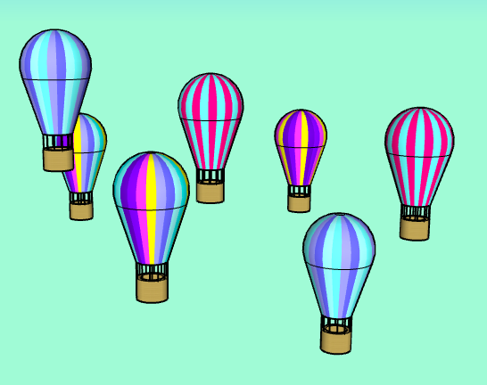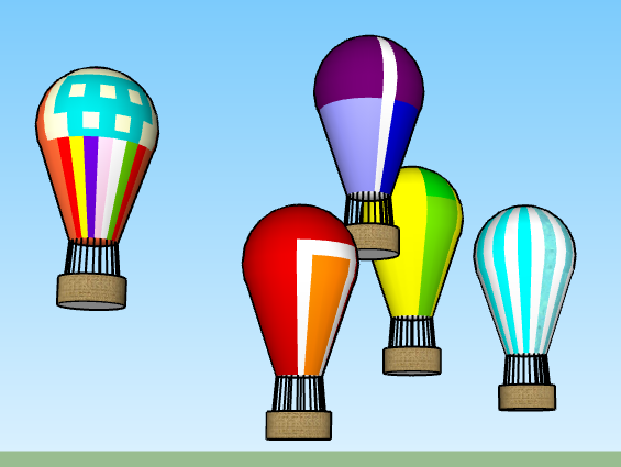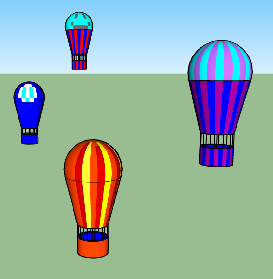 Fifth grade art students have created virtual 3D models of hot-air balloons with Sketch Up for Schools computer-aided design (CAD) software on Chromebooks. Students drew flat shapes on a vertical rectangular plane to make a half-profile of a balloon. To create the 3D form of the balloon and basket, they spun the half-profile with the “follow me” tool around the path of a circle which was drawn on the ground (perpendicular to the half-profile). Students made copies of their balloons and colored them. The groups of balloons were positioned as though they were floating in the sky. Steps in the construction of the balloons are shown below in a CAD design by Nicolas Ford, whose final work also appears here.