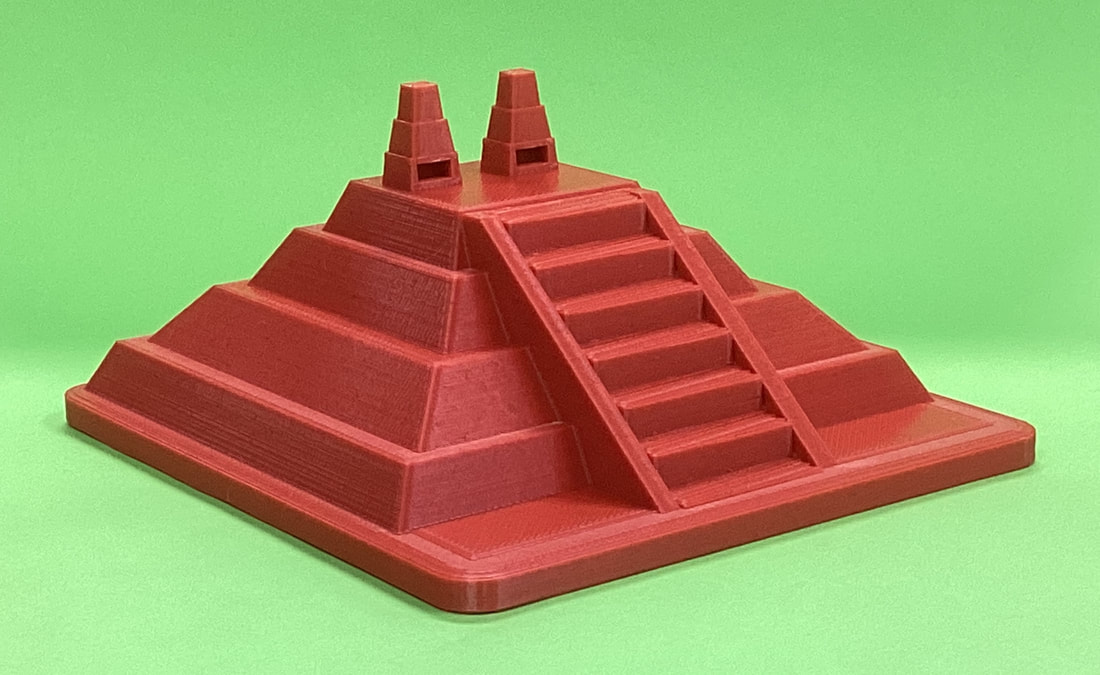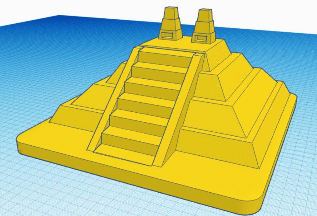 Sixth grader Jac Dupree has made a Tinkercad model that is similar to Aztec pyramids with two temples on top. The computer-aided design model and the 3D print of the pyramid are shown here.