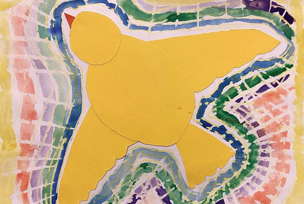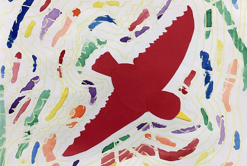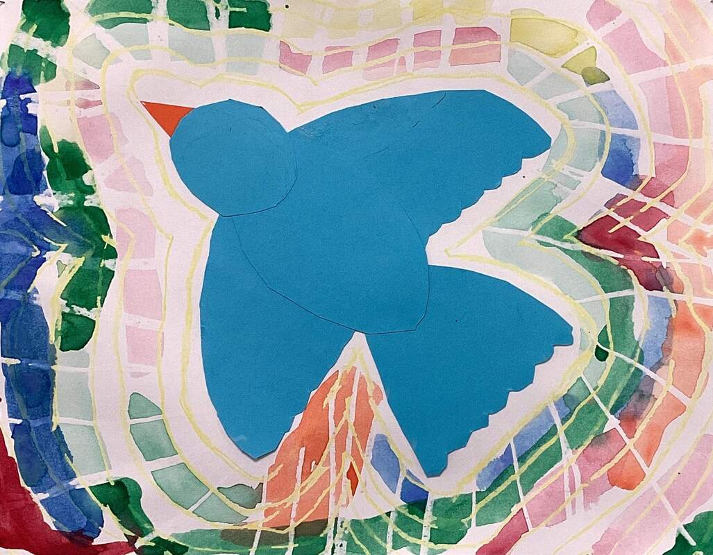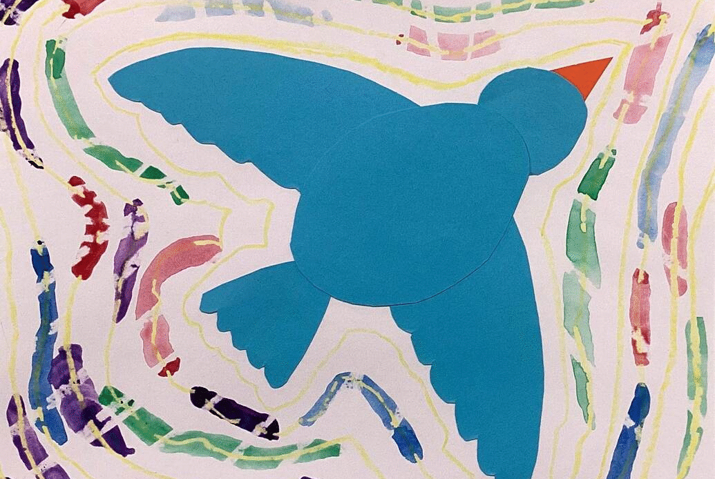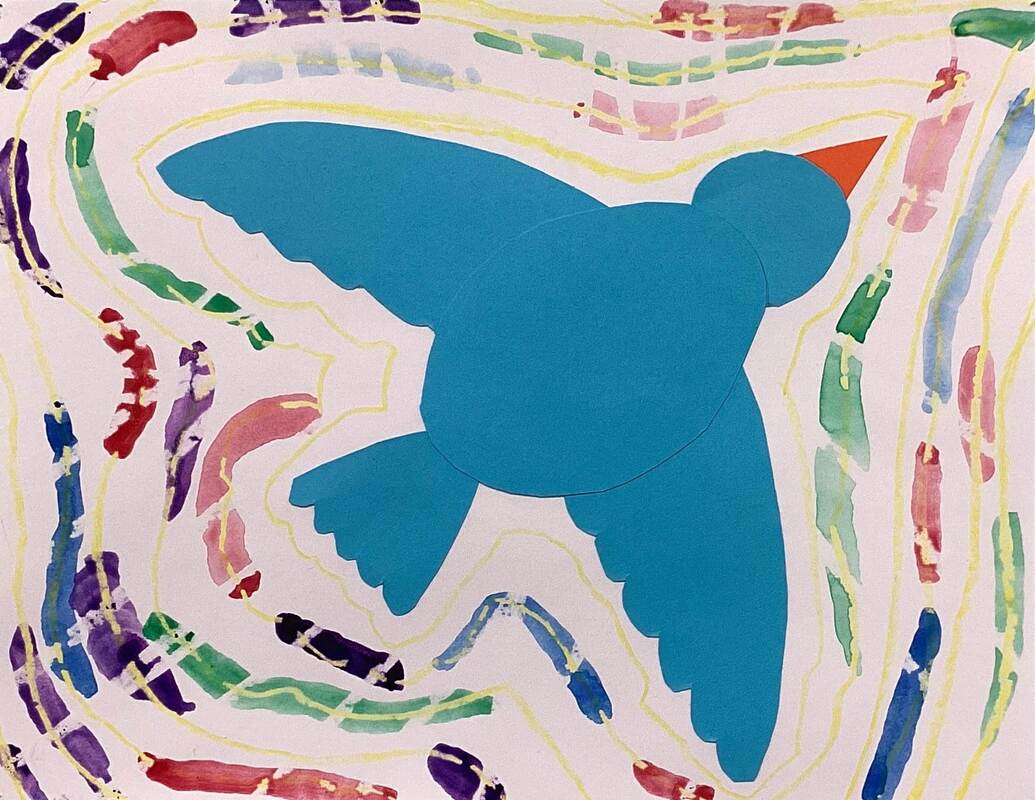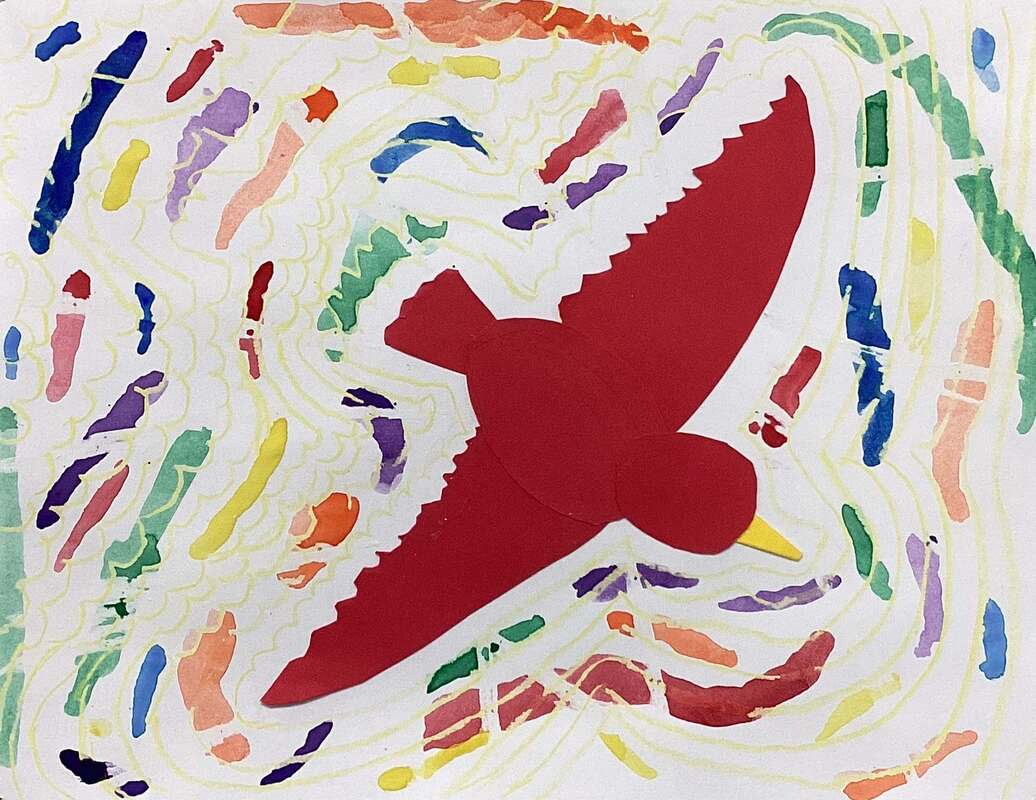 Second grade art students have painted with watercolor around paper bird designs they made by drawing, cutting, and assembling parts. Watercolored shapes and linear crayon patterns in the sky echo the shapes of the birds and help to unify the compositions.