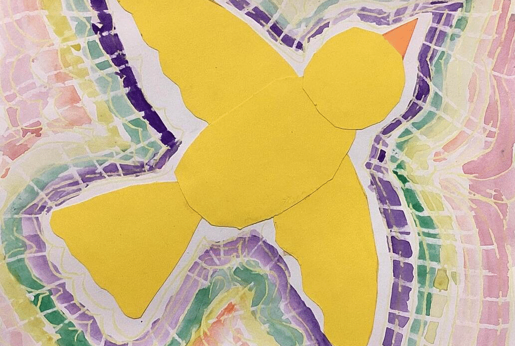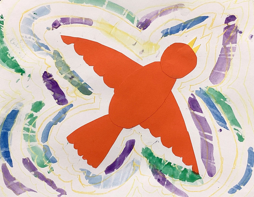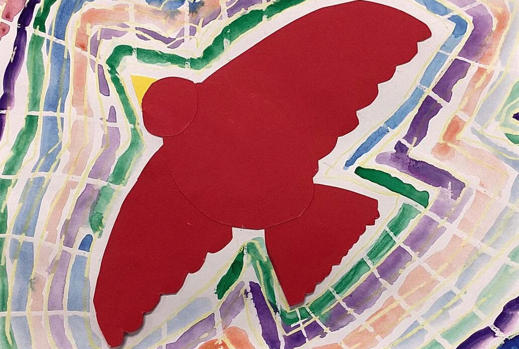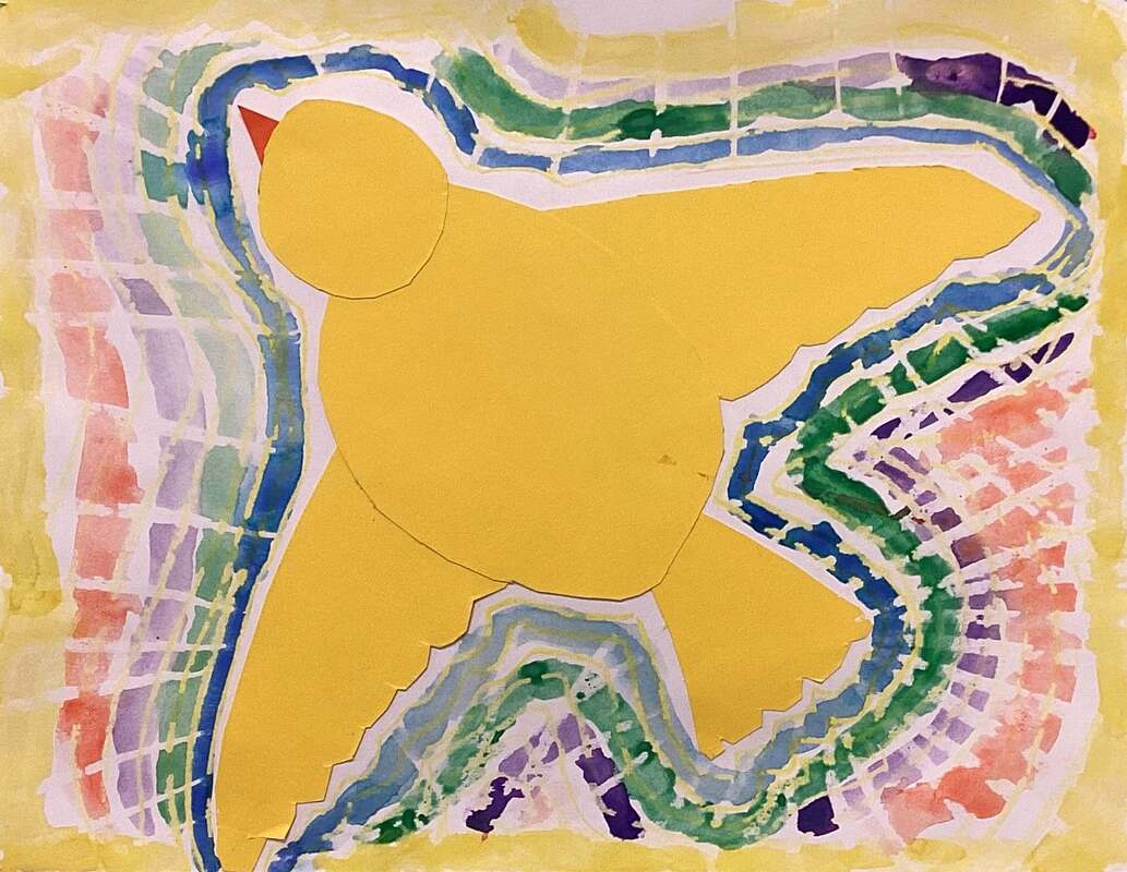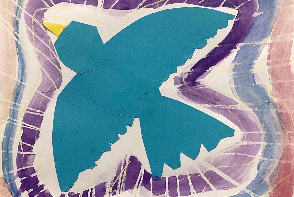 Second grade art students have painted with watercolor around paper bird designs they made by drawing, cutting, and assembling parts. Watercolored shapes and linear crayon patterns in the sky echo the shapes of the birds and help to unify the compositions.