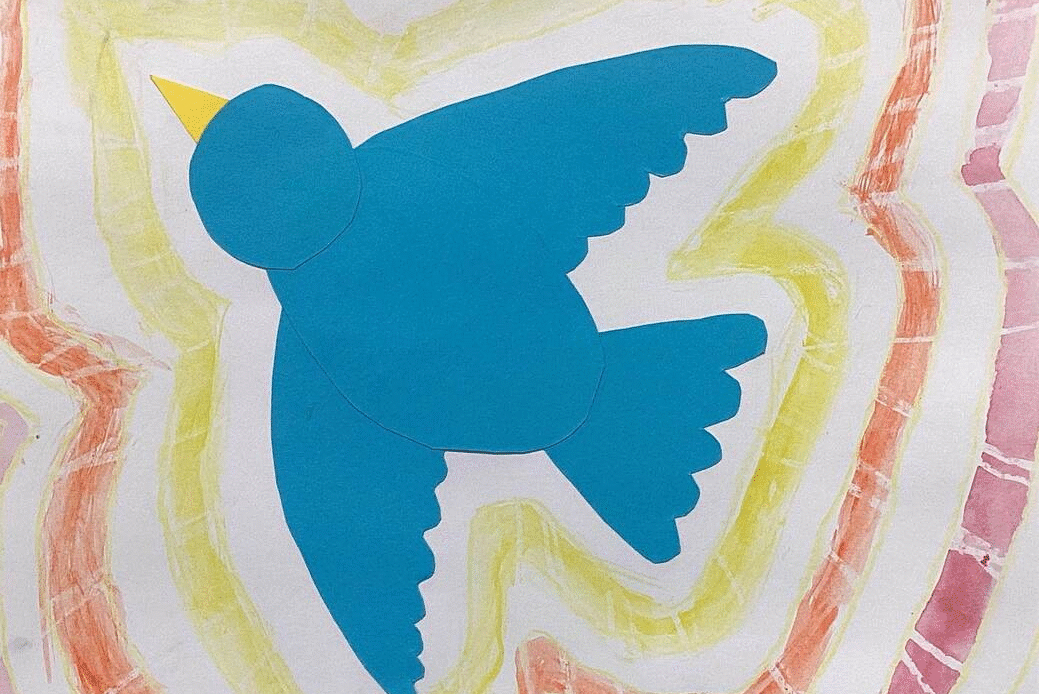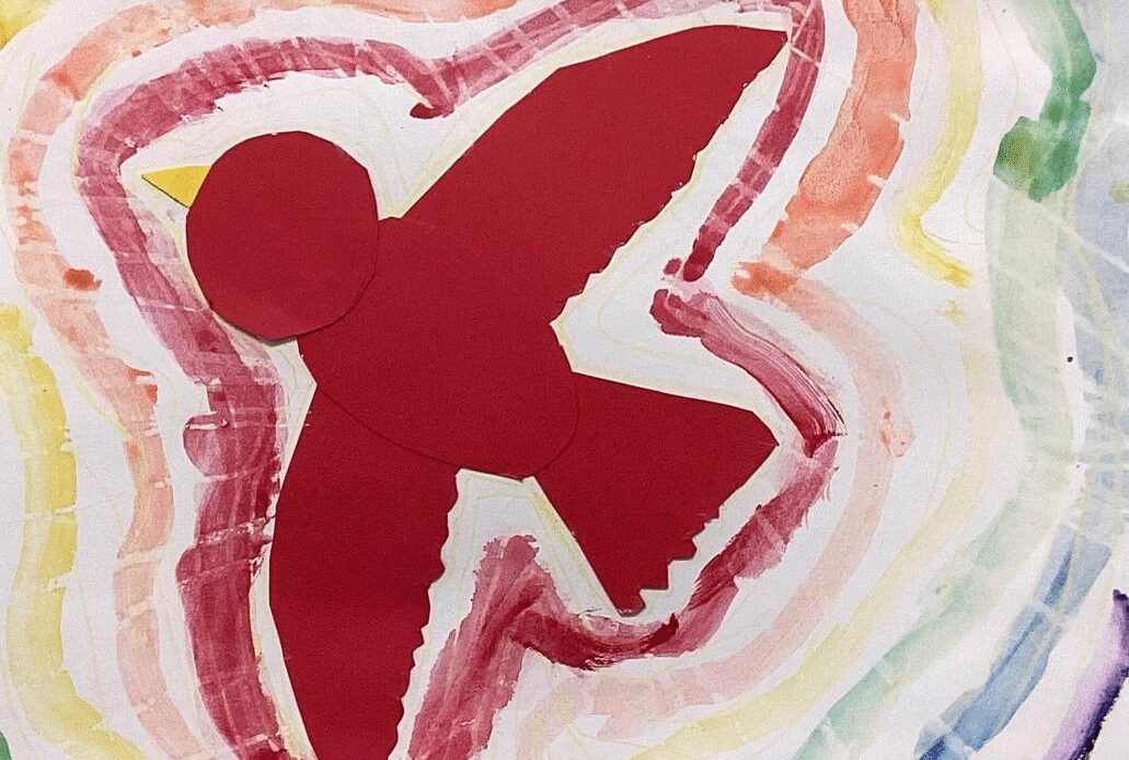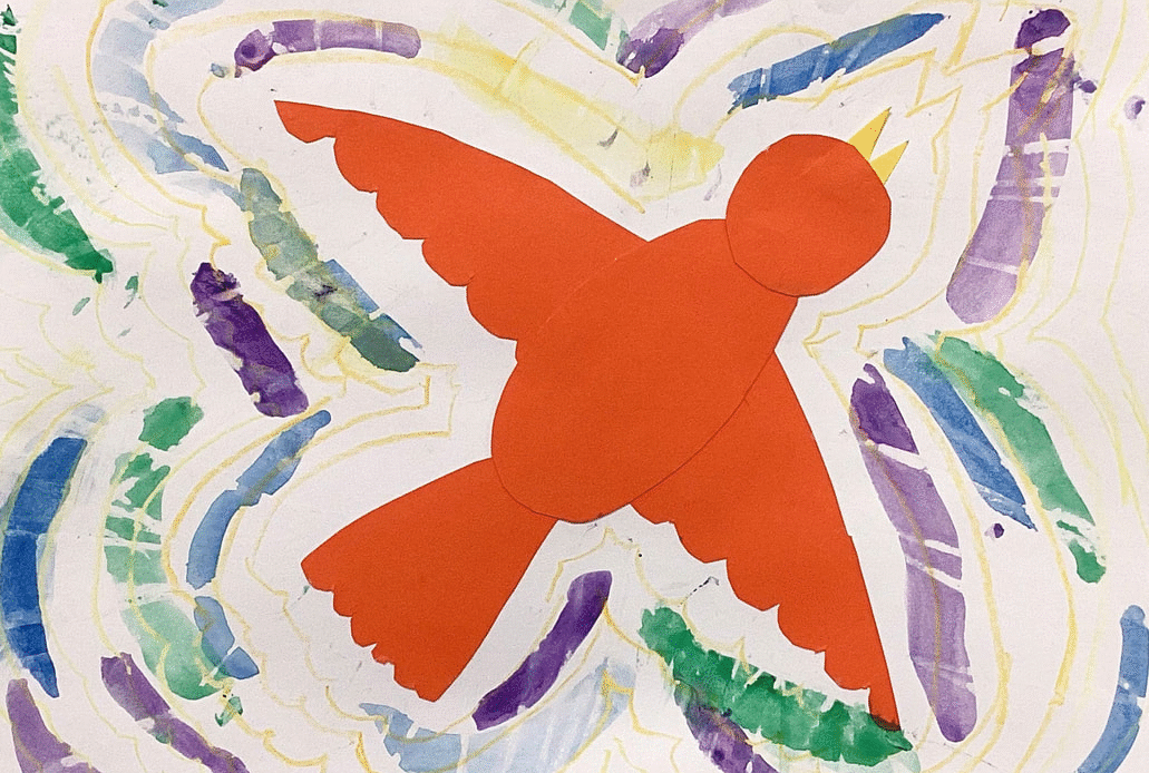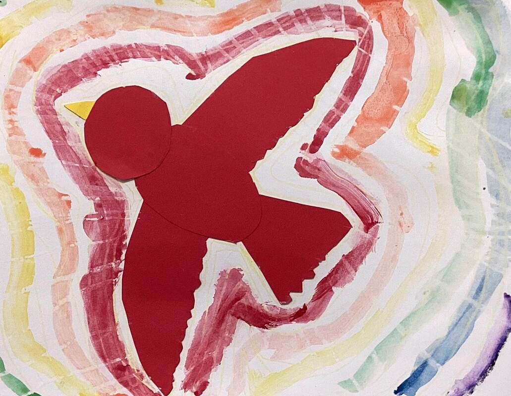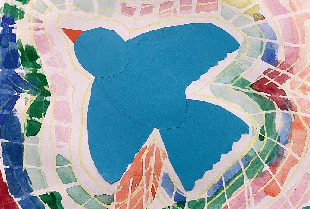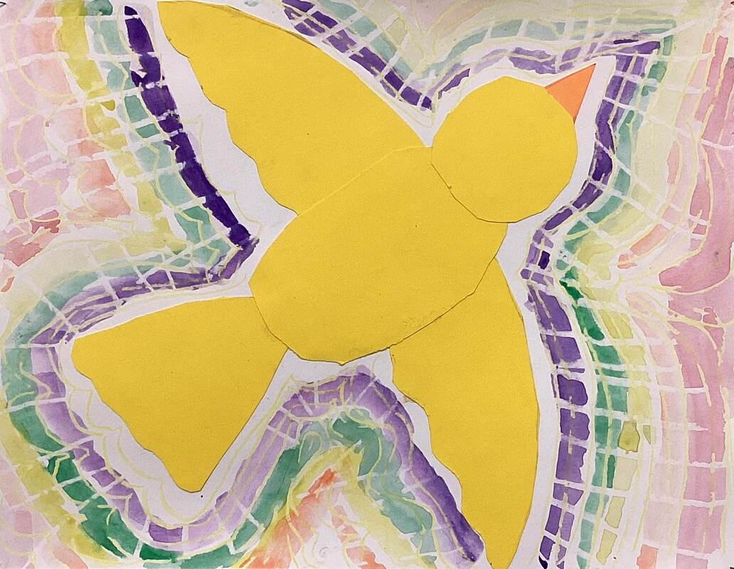 Second grade art students have painted with watercolor around paper bird designs they made by drawing, cutting, and assembling parts. Watercolored shapes and linear crayon patterns in the sky echo the shapes of the birds and help to unify the compositions.