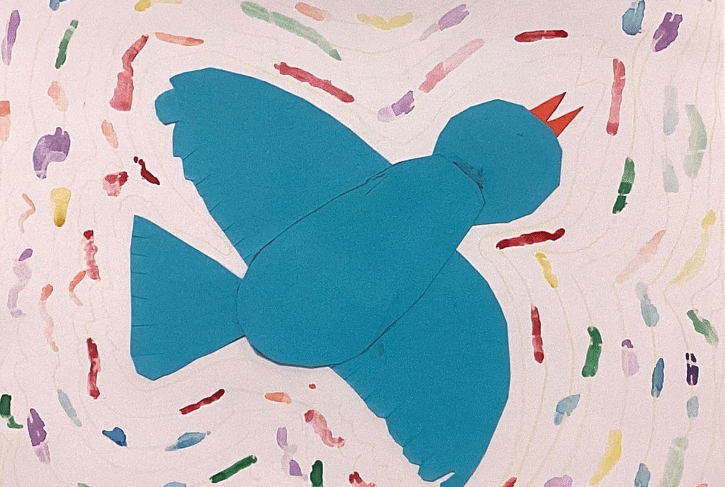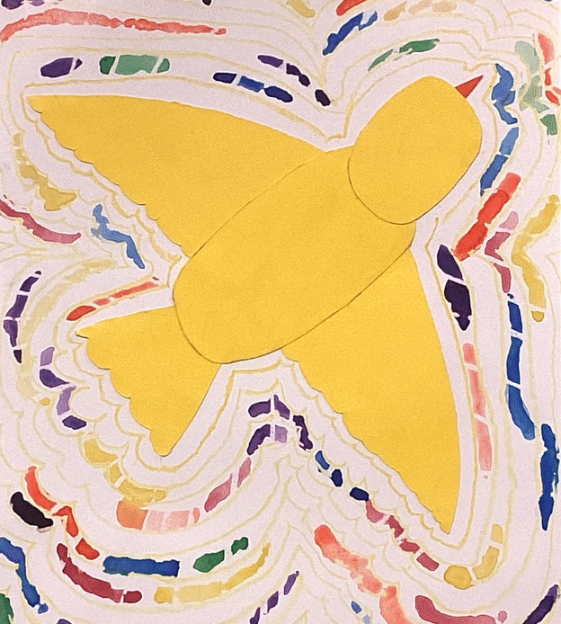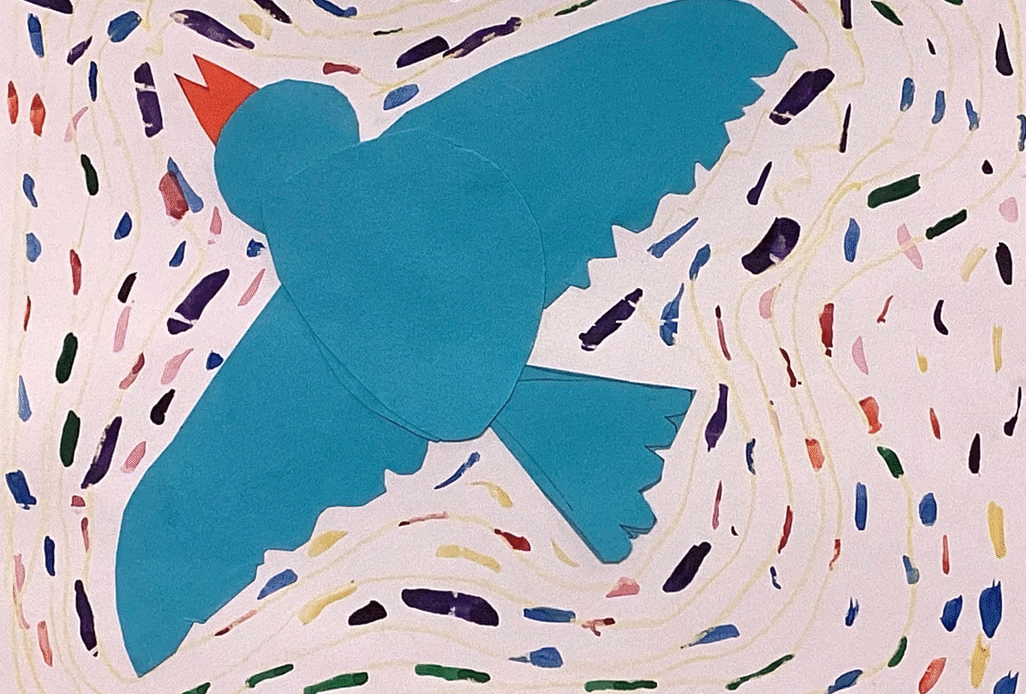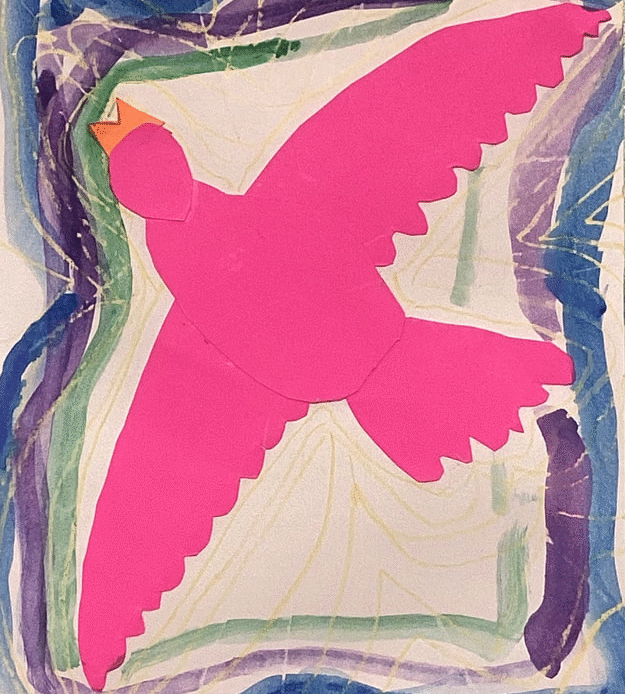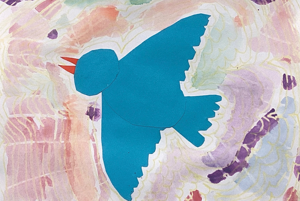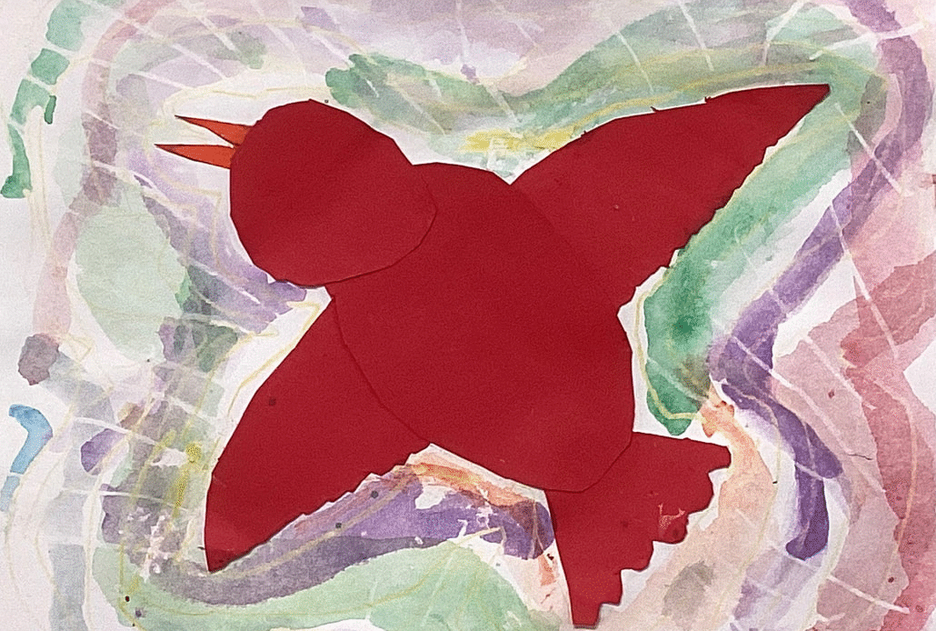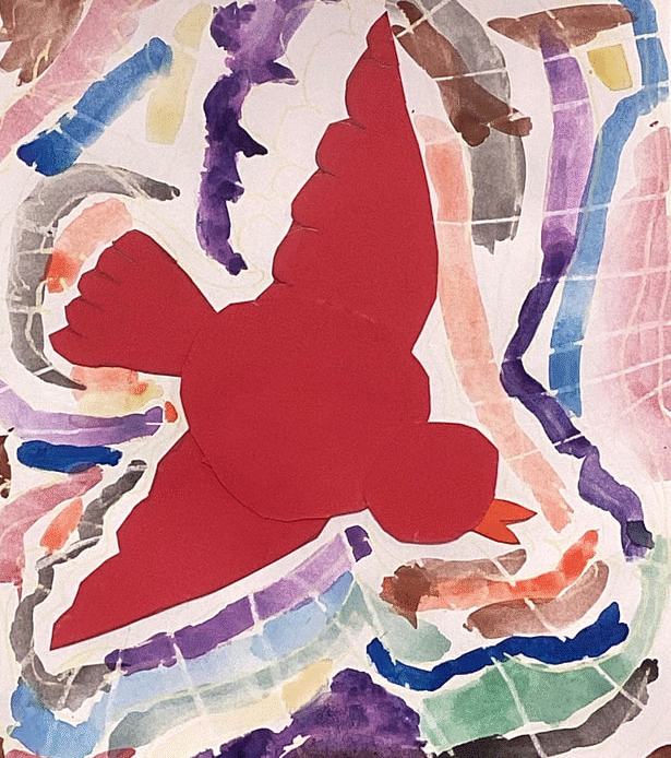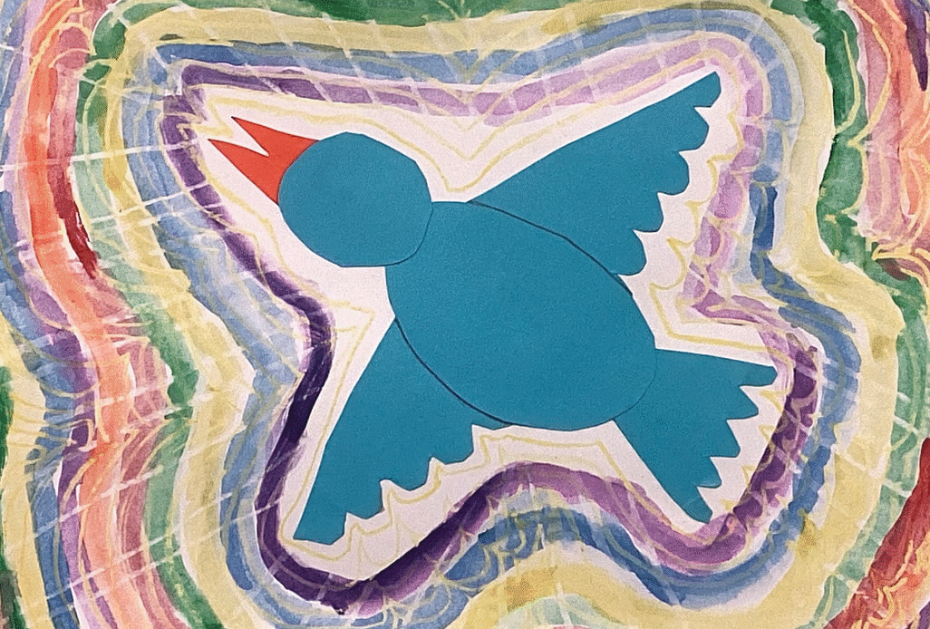 Second grade art students have painted with watercolor around paper bird designs they made by drawing and assembling parts of the birds. Watercolored shapes and linear crayon patterns in the sky echo the shapes of the birds and help to unify the compositions.