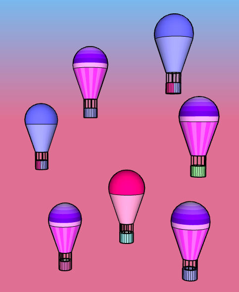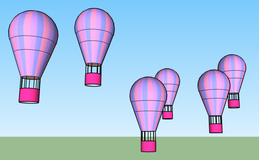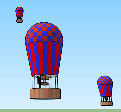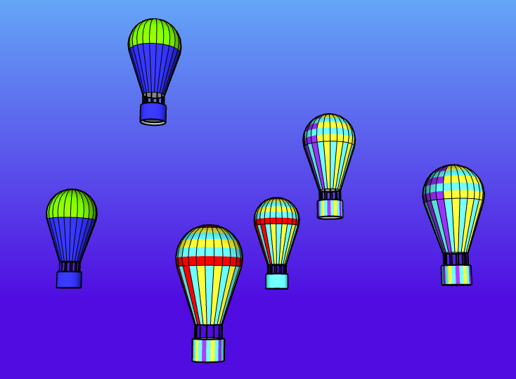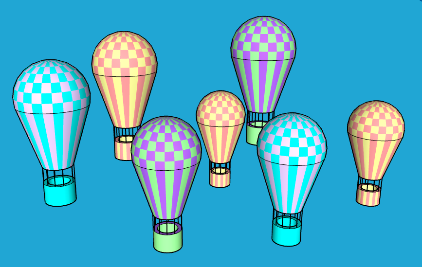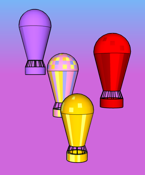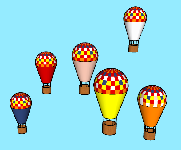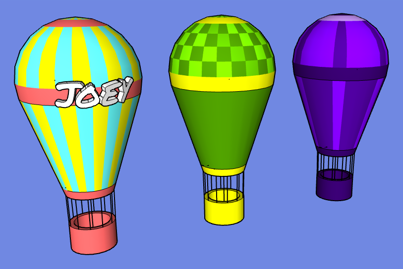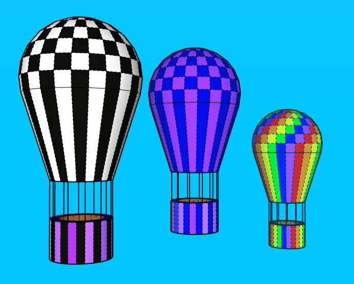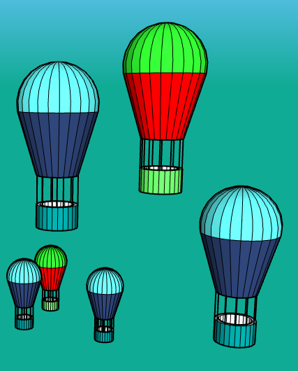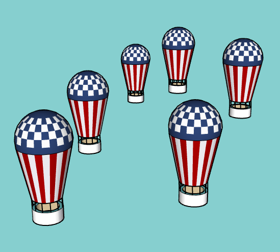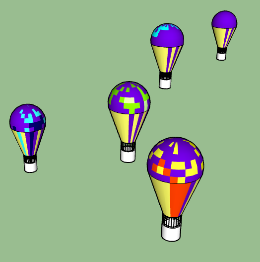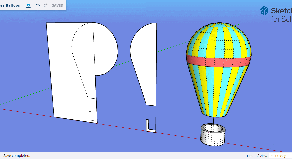 Fifth grade art students have recently been creating virtual models of hot-air balloons with Sketch Up for Schools computer-aided design (CAD) software on Chromebooks. Students used shapes and lines to create a half-profile of a balloon and then spun it with the “follow me” tool to create the 3D form. Students arranged copies of their balloons so that a group appears to be flying. Students colored their balloons and the background space in individually expressive ways. The first steps in the construction of the balloons are shown below in a CAD design by Joey Burgess, whose final work also appears here.