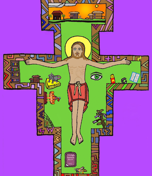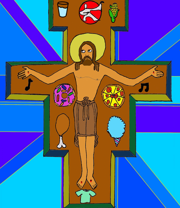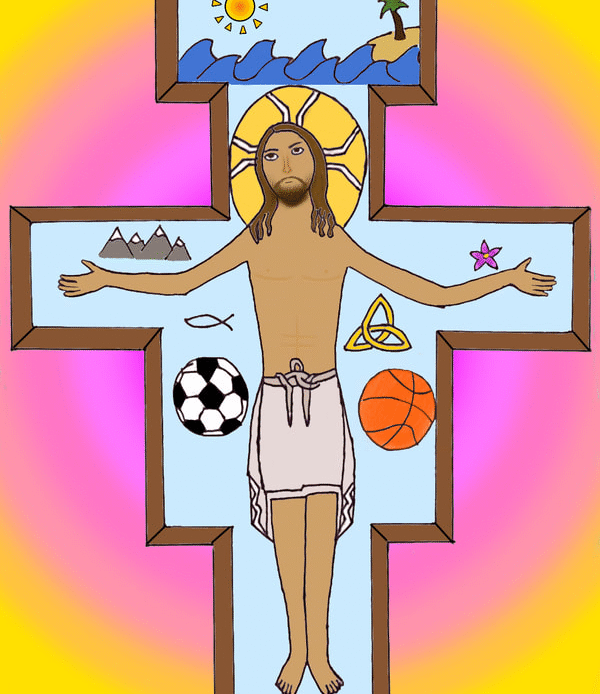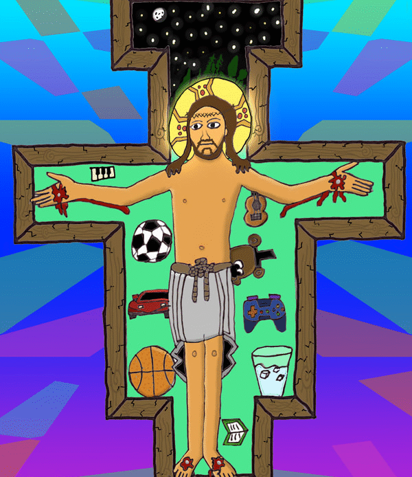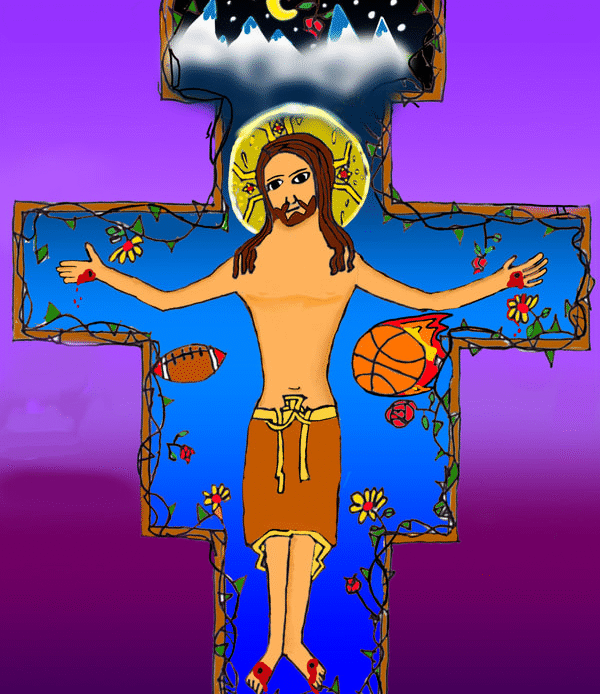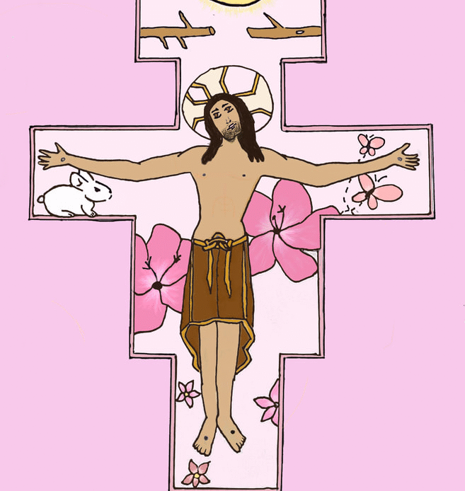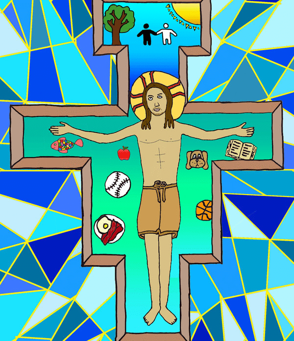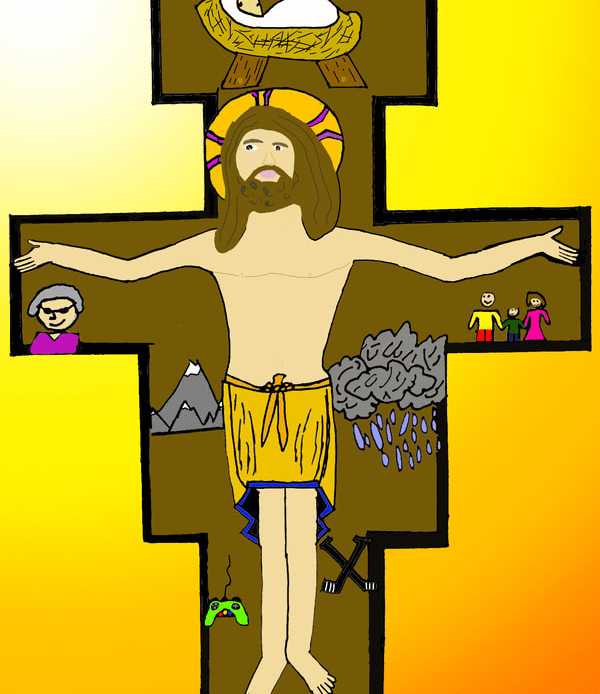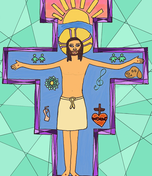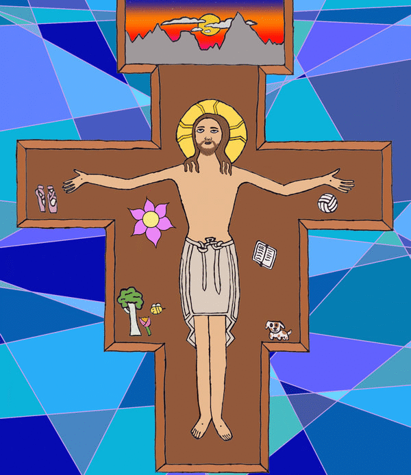 To create artwork for this project, seventh graders first made pencil and ink drawings of Jesus on the unique shape of the San Damiano cross. People, things, and places for which students are thankful appear in the space of the cross around Jesus. After photographing their work, students colored and edited photos of their drawings with the Sketchbook app on their iPads.