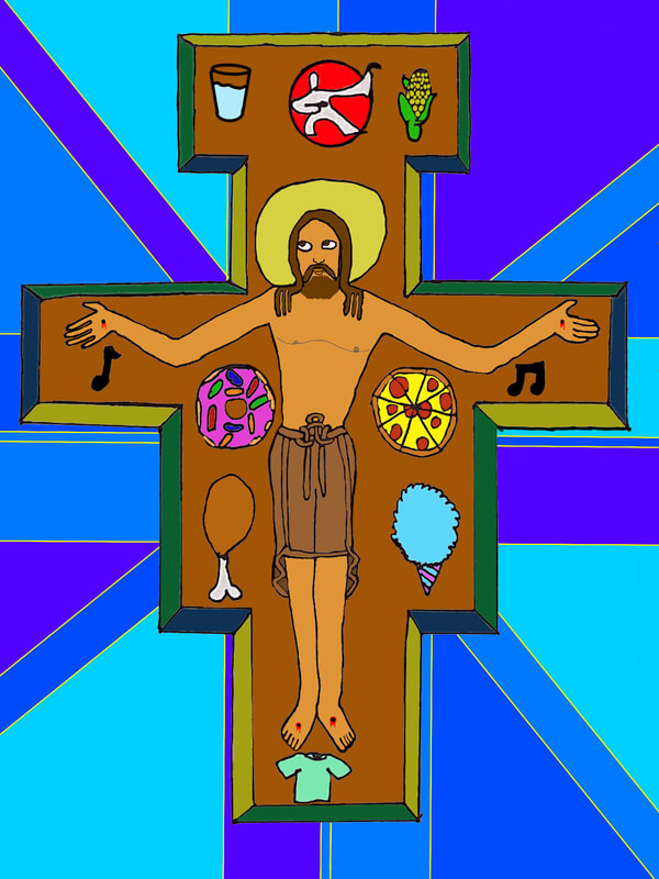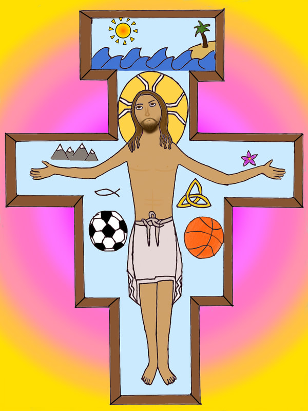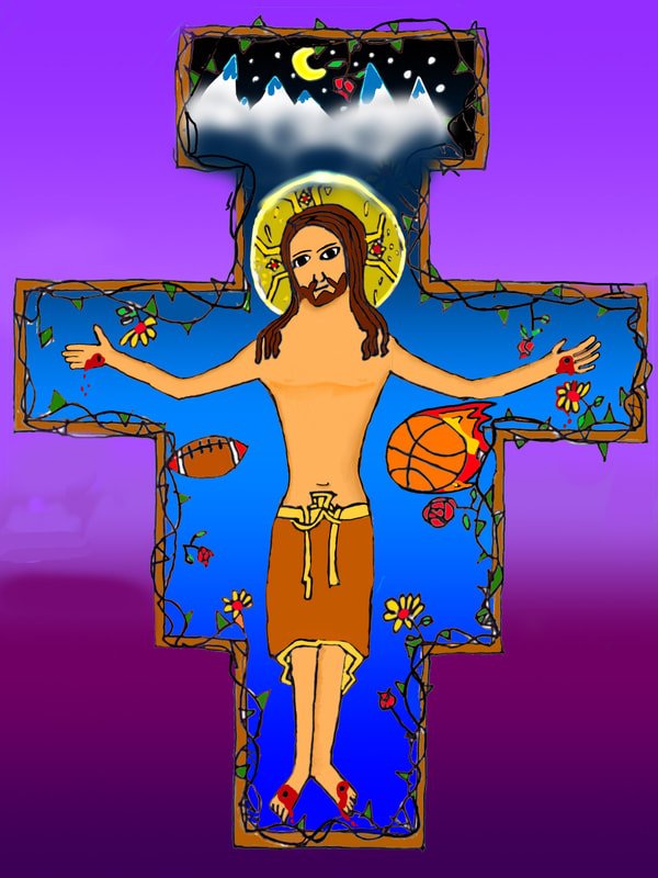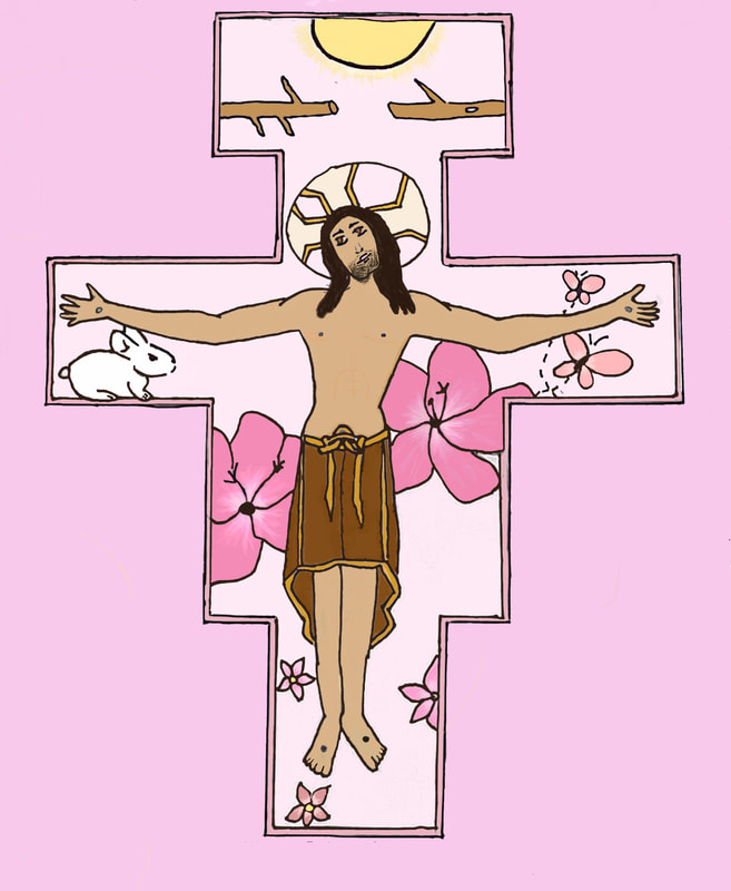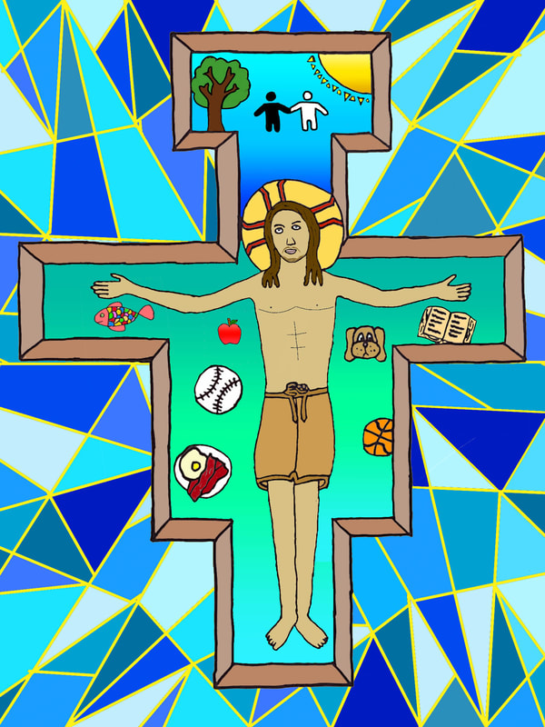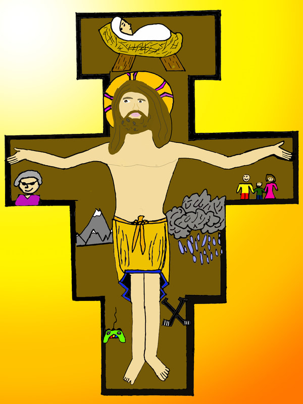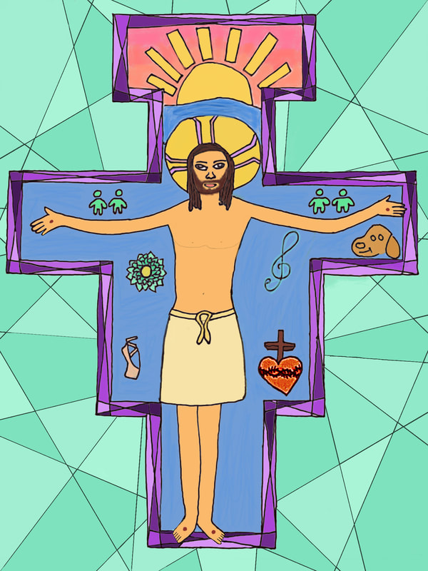 To create artwork for this project, seventh graders first made pencil and ink drawings of Jesus on the unique shape of the San Damiano cross. People, things, and places for which students are thankful appear in the space of the cross around Jesus. After photographing their work, students colored and edited photos of their drawings with the Sketchbook app on their iPads.