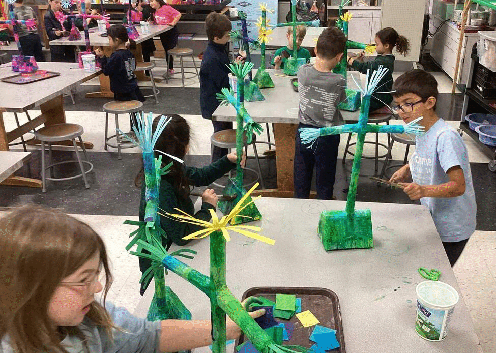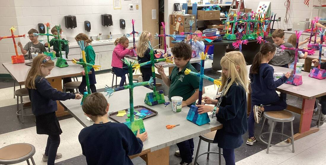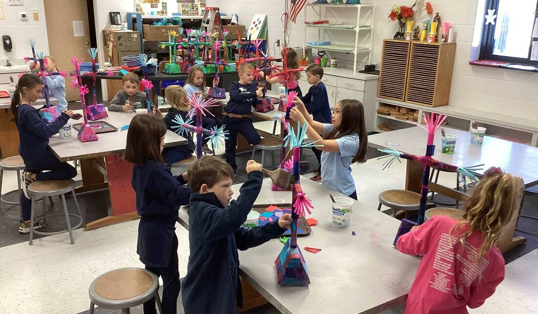 Second grade art students are shown below as they apply the finishing touches of paper mache to their cross sculptures. Students built these structures with cardboard pieces and colored card stock which they measured, cut, and taped.