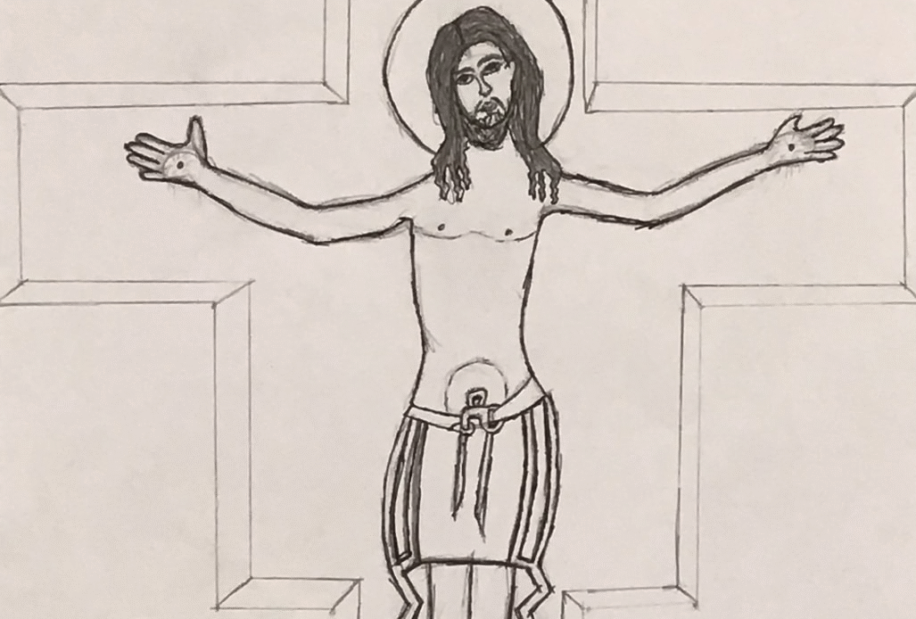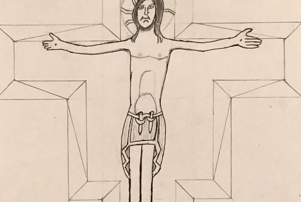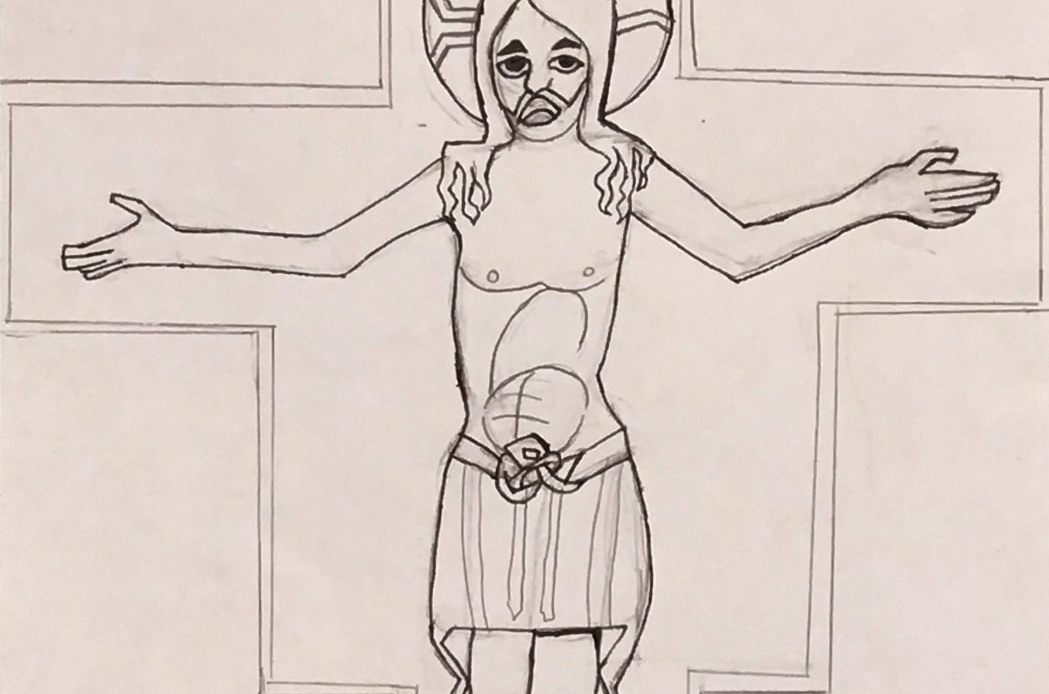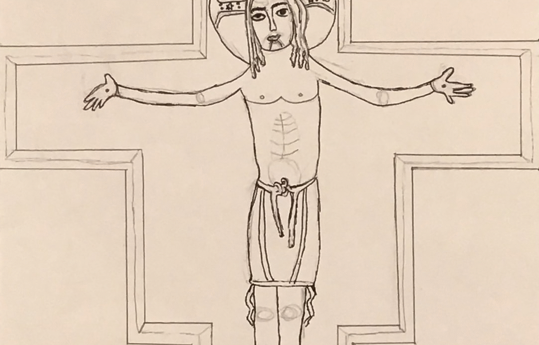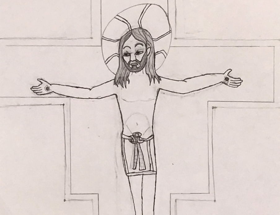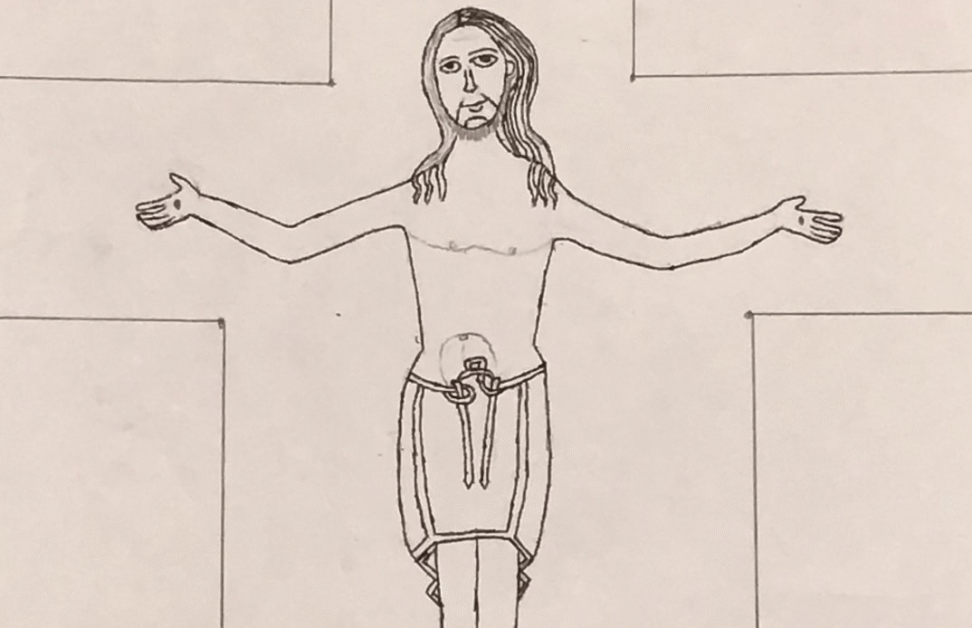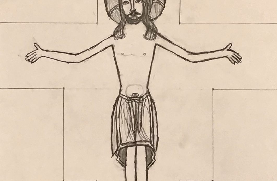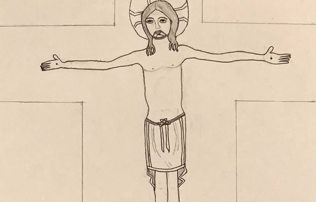 The students’ drawings of Jesus on the shape of the San Damiano cross (shown here) are the first stage of a long-term art project. The next step will be to draw people, things, and places that they are thankful for in the space of the cross surrounding Jesus. Students will color their drawings and then cut away the paper outside the shape of the cross. Each student will glue their colored crucifix image to a piece of 9 x12-inch black paper. Pieces of colored card stock will be glued to the black paper in a way that simulates a stained glass window. Thin areas of the black paper will be left between the pieces of colored paper. Thus, the final images will be of each student’s personalized version of the cross surrounded by a stained glass window.