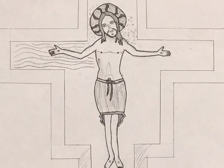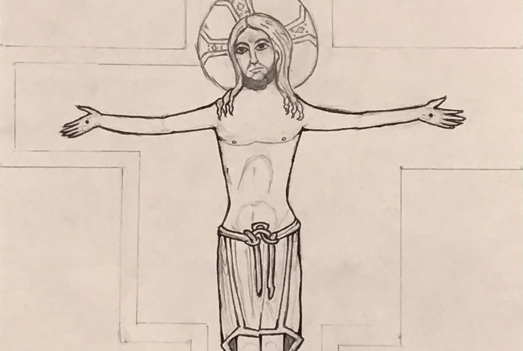 Seventh grade art students are currently working on a project related to the San Damiano Cross. This original iconic crucifix painting was created by an unknown artist, possibly a Syrian monk, in Umbria, Italy in the early 1100’s. Saint Francis of Assisi (1181-1226) is said to have been praying before the large wooden cross where it was hanging in an abandoned chapel which had fallen into ruin near Assisi, Italy. While praying, he heard the voice of God commanding him to “rebuild my church”. (Sources: franciscanmissionservice.org and monasteryicons.com)