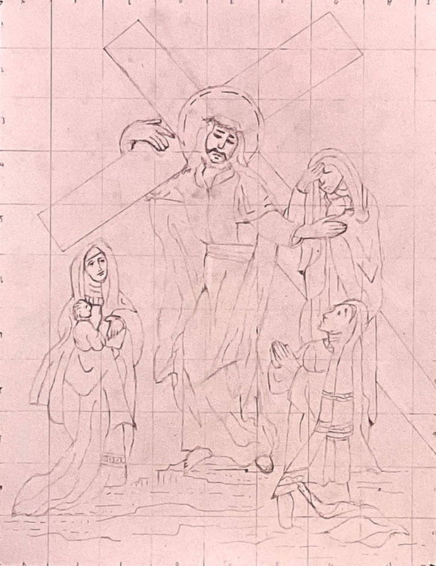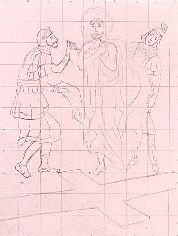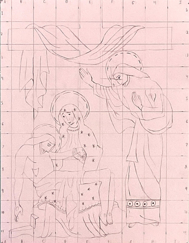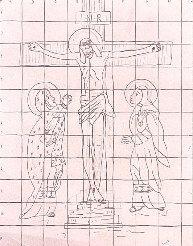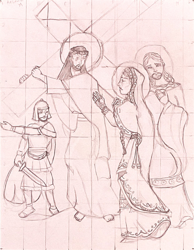 To kick off the 2024-25 school year, 8th graders have begun drawing the Stations of the Cross in Mr. Bell’s Art Tech class. Students drew grids with 1/2-inch squares on small prints of illustrations by contemporary artist Shari Van Vranken. Proportionate grids with 1-inch squares were drawn on larger sheets of card stock in order to scale up the small images. Math concepts are reinforced as students must remain focused on corresponding positions on 2 graphs as they draw the contents of each grid block. When finished with their pencil drawings, students will go over their lines with permanent marking pens. Students will photograph their drawings after erasing the grid lines and stray pencil marks. Then, the images will be developed further and colored electronically with the Sketchbook graphic design app on students’ iPads.