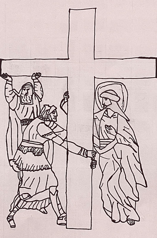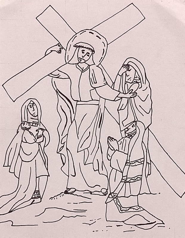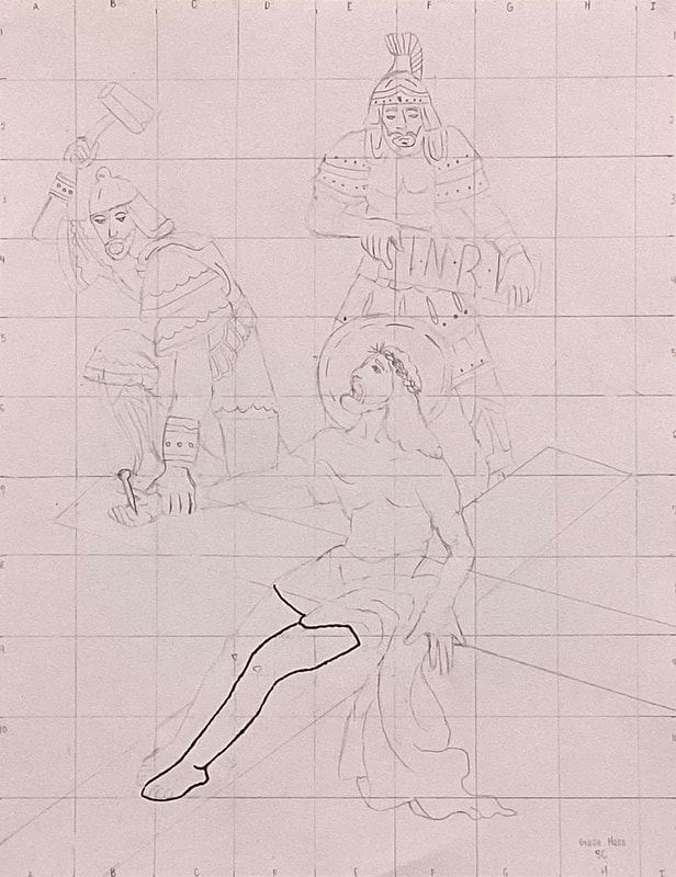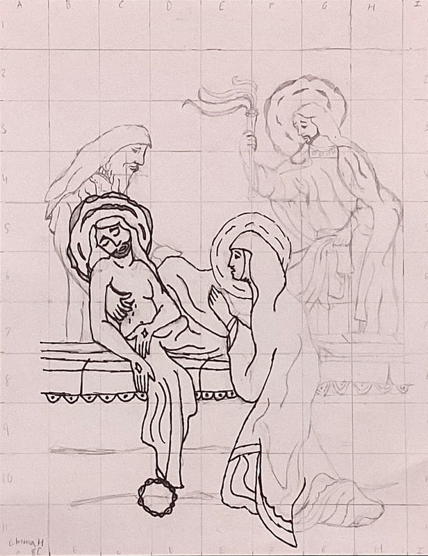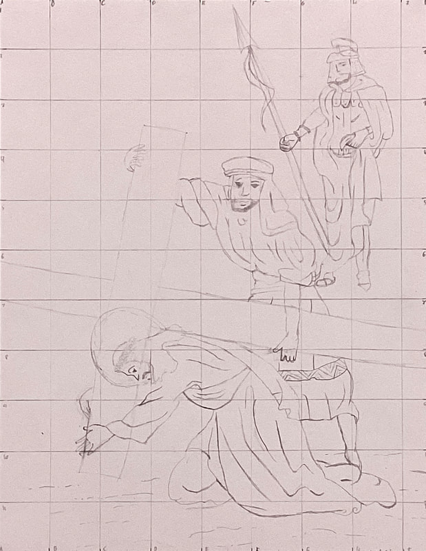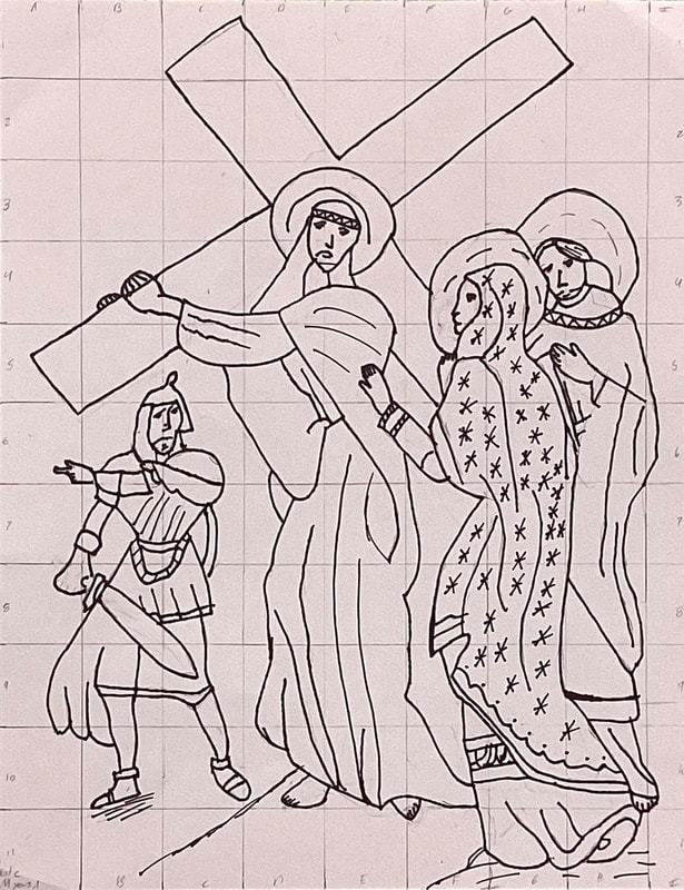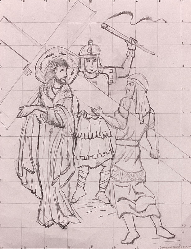 Eighth graders continue to work on their Stations of the Cross drawings in Mr. Bell’s Art Tech class. Students drew grids with 1/2-inch squares on small prints of illustrations by contemporary artist Shari Van Vranken. Proportionate grids with 1-inch squares were drawn on larger sheets of card stock in order to scale up the small images. Students must remain focused on corresponding positions on 2 graphs as they draw the contents of each grid block. When finished with their pencil drawings, students go over their lines with permanent marking pens. Students take photos of their drawings after erasing the grid lines and stray pencil marks. Then, the images are developed further and colored electronically with the Sketchbook graphic design app on students’ iPads.