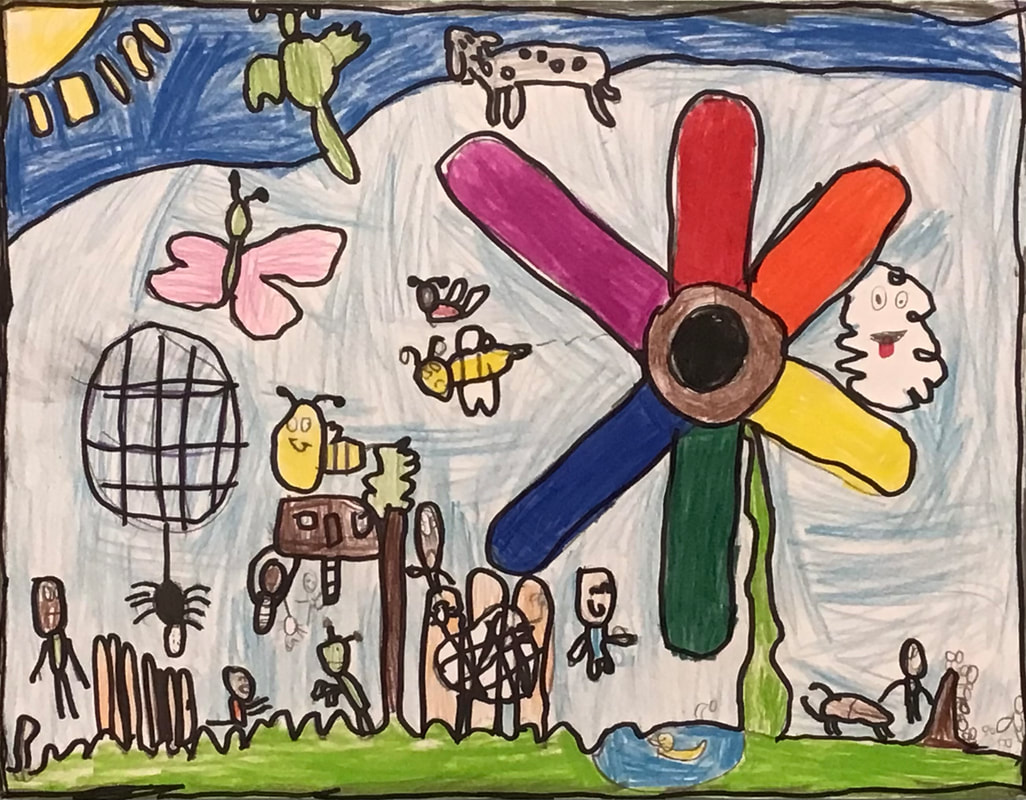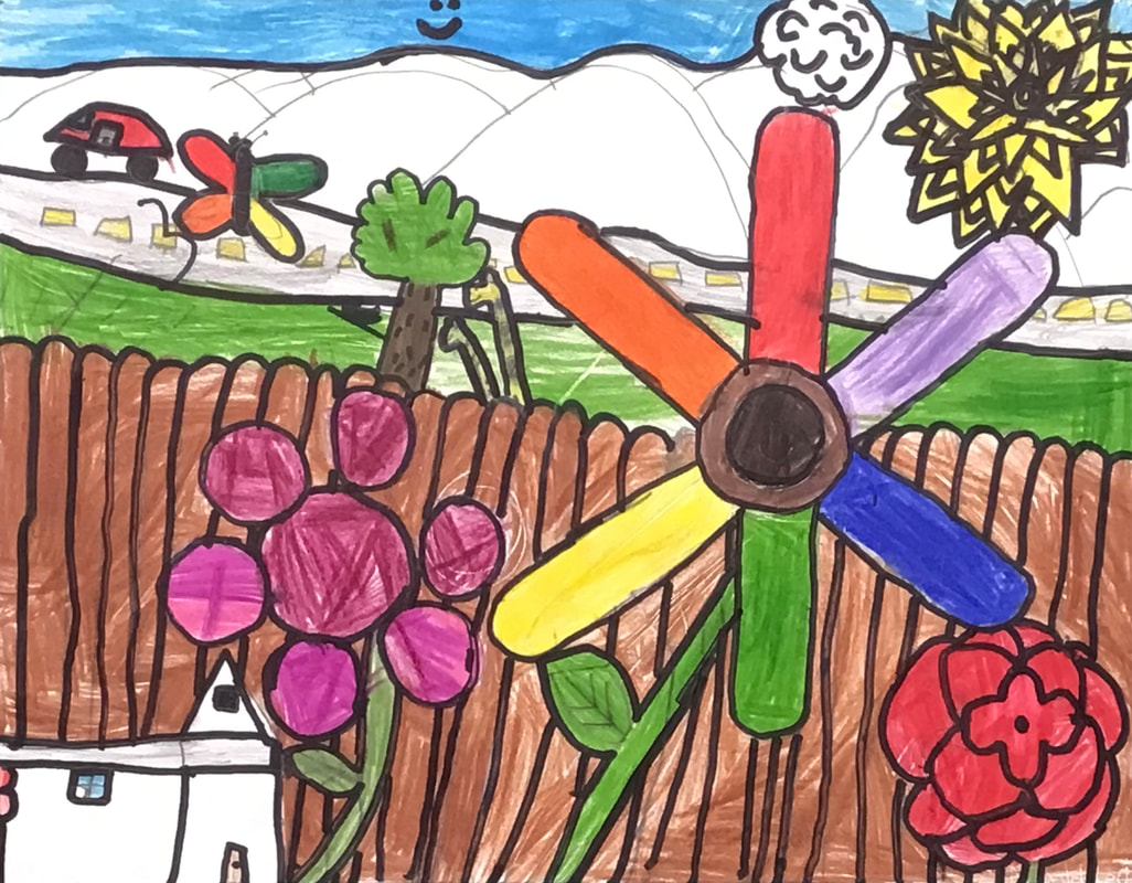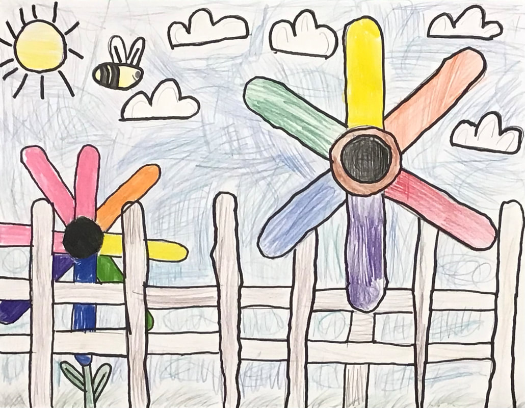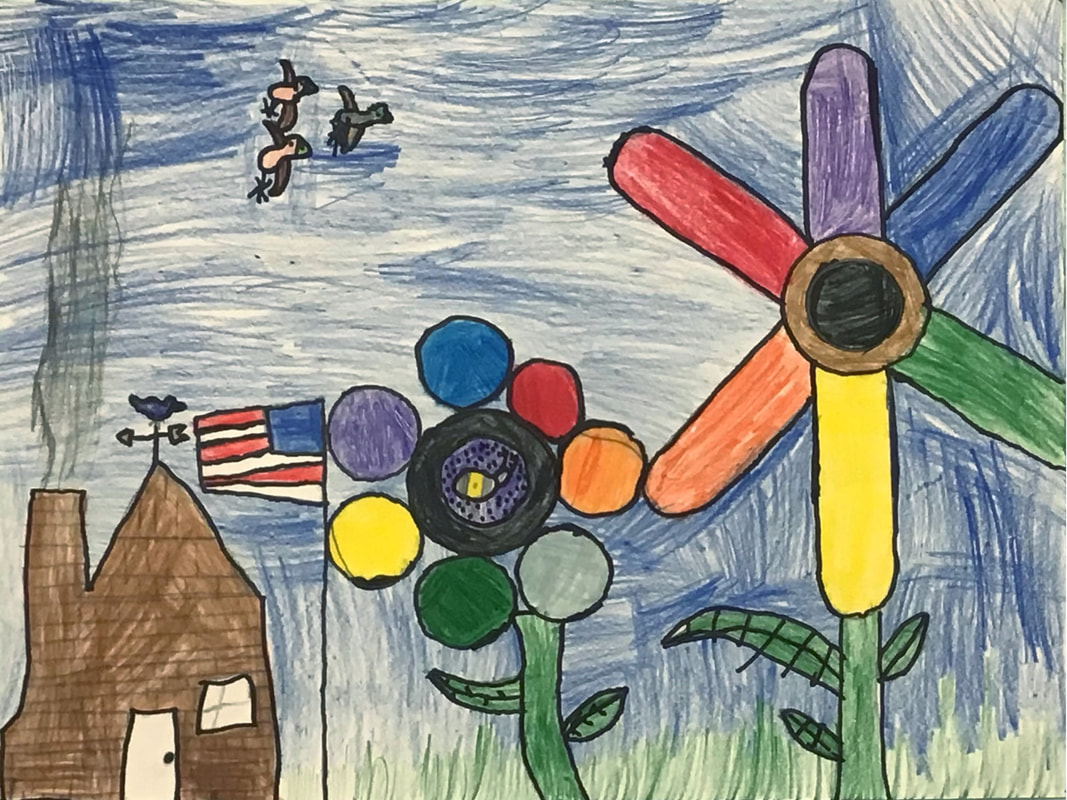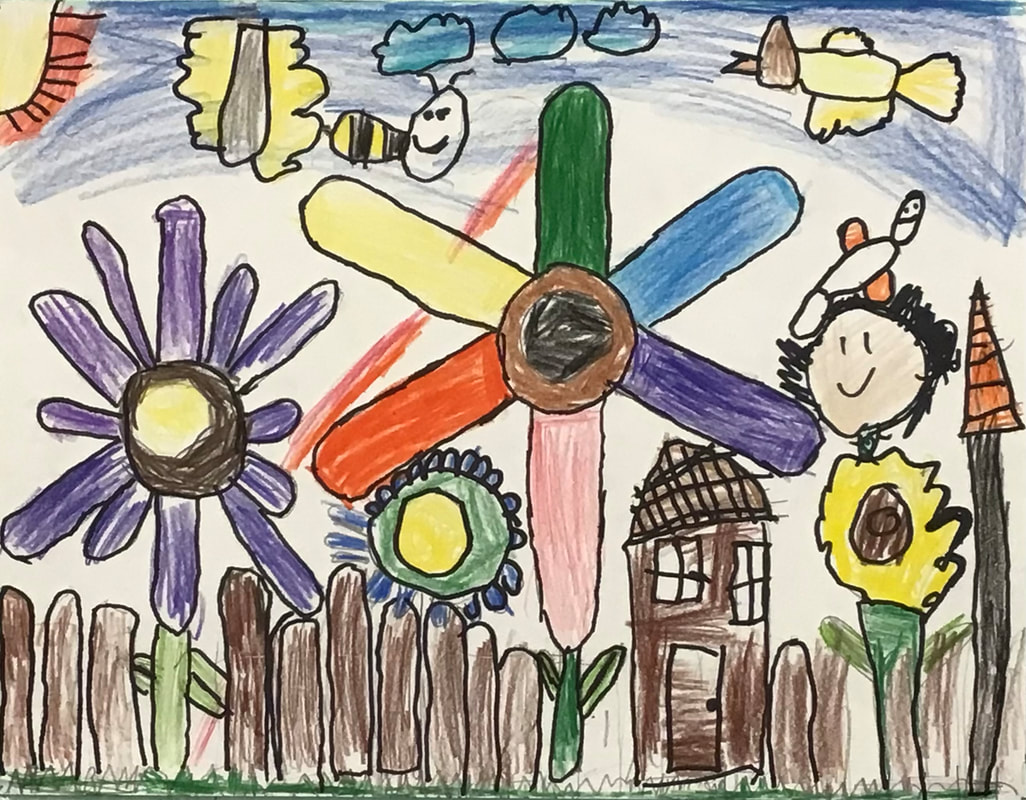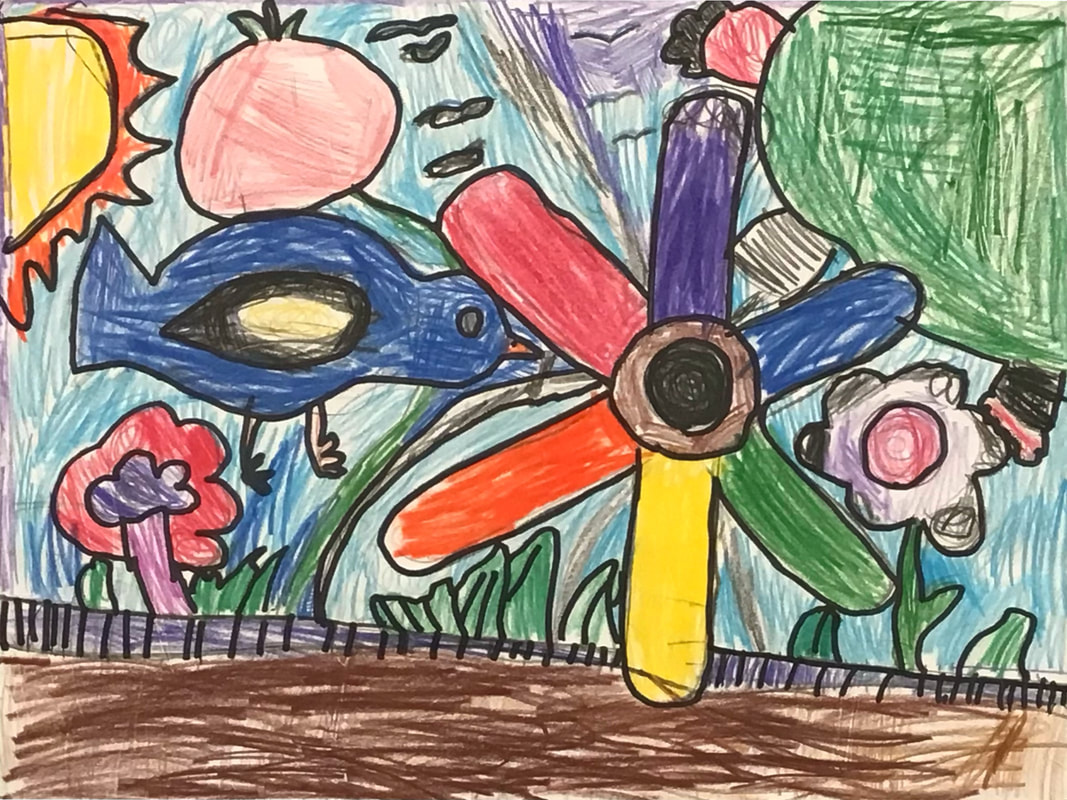 Second grade art students have recently been drawing “Color Wheel Flower Gardens”. In this exercise, the dominant flower in the composition has petals that show a 6-part color wheel. The petals have the three traditional primary colors for painters (red, yellow, and blue) and the secondary colors (orange, green, and purple). The secondary colors appear between the primaries used to make them. Brown appears in the central circle of the color wheel flowers because various types of brown can be obtained by mixing the three primaries in different proportions. Black is in the very center of the color wheel flowers because it can be obtained by mixing the 3 primaries in proportions of equal strength. Students used pencils, colored pencils, permanent markers, and their imaginations to develop these artworks.