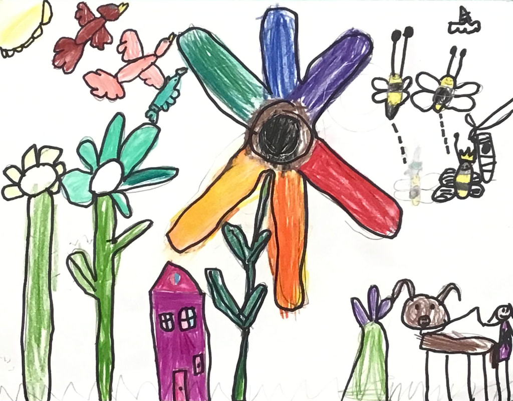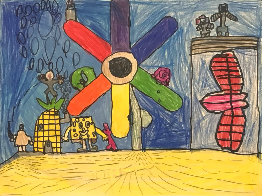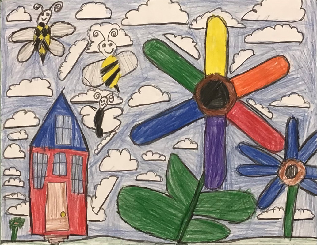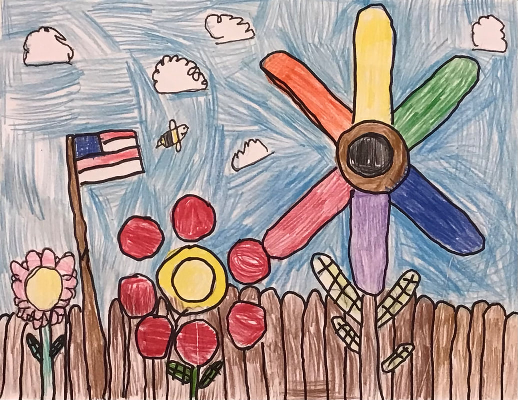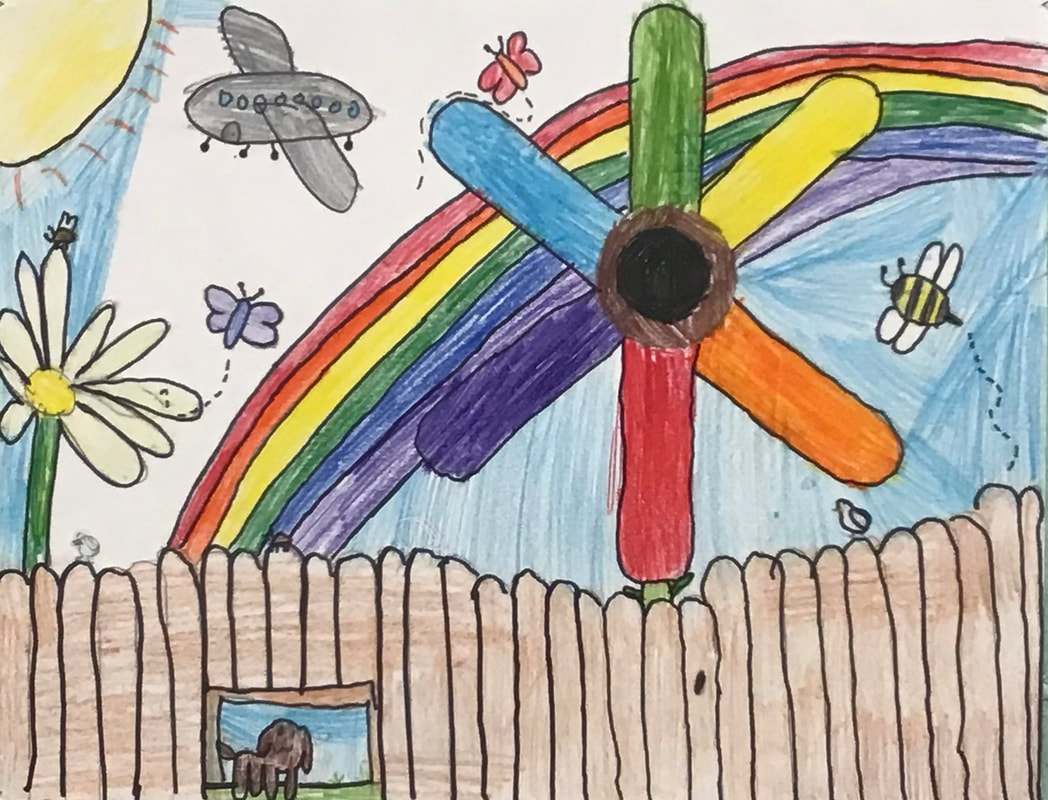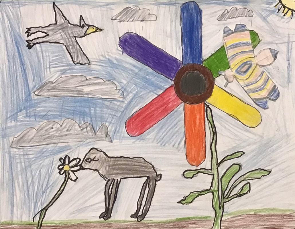 Second grade art students have recently been drawing “Color Wheel Flower Gardens”. In this exercise, the dominant flower in the composition has petals that show a 6-part color wheel. The petals have the three traditional primary colors for painters (red, yellow, and blue) and the secondary colors (orange, green, and purple). The secondary colors appear between the primaries used to make them. Brown appears in the central circle of the color wheel flowers because various types of brown can be obtained by mixing the three primaries in different proportions. Black is in the very center of the color wheel flowers because it can be obtained by mixing the 3 primaries in proportions of equal strength. Students used pencils, colored pencils, permanent markers, and their imaginations to develop these artworks.