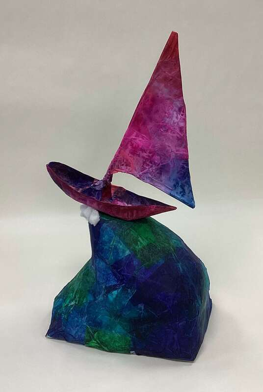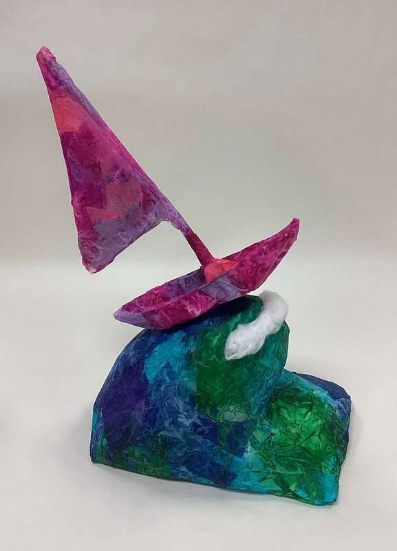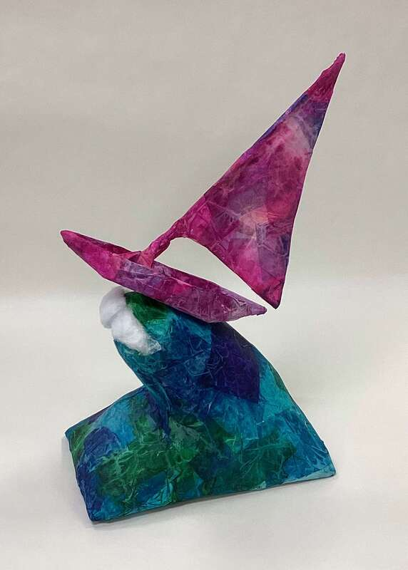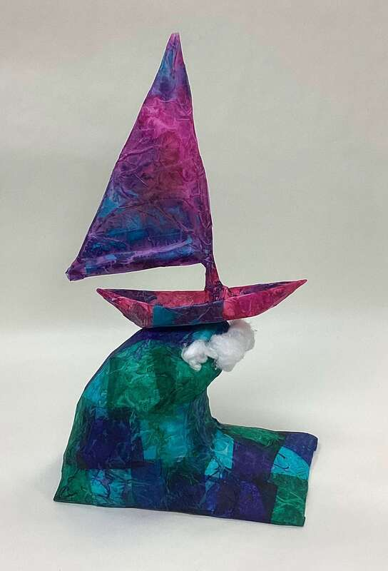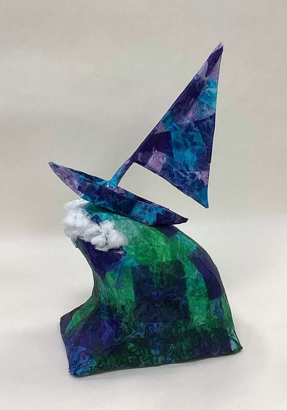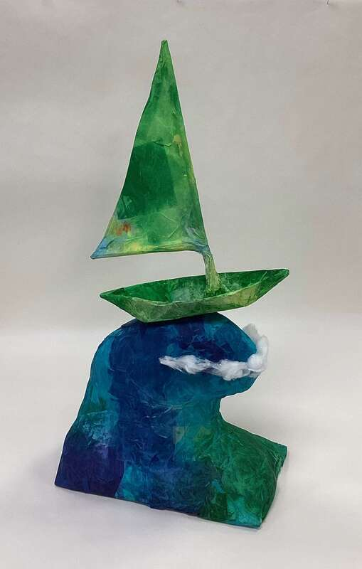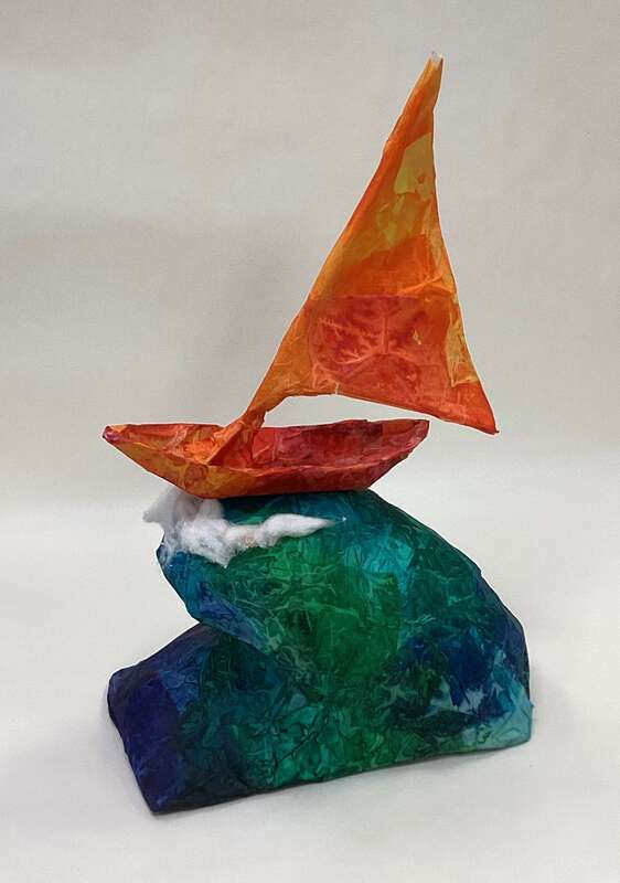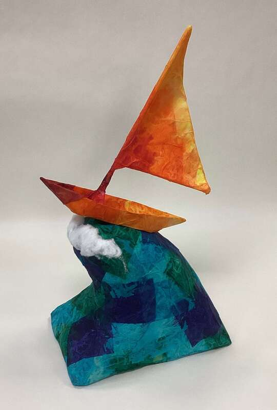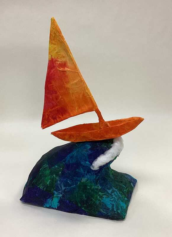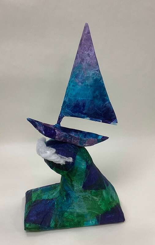 Sailboat sculptures by 4P art class students are featured here. Students used their spatial and structural skills as they measured, cut, and manipulated a variety of materials to create these artworks.