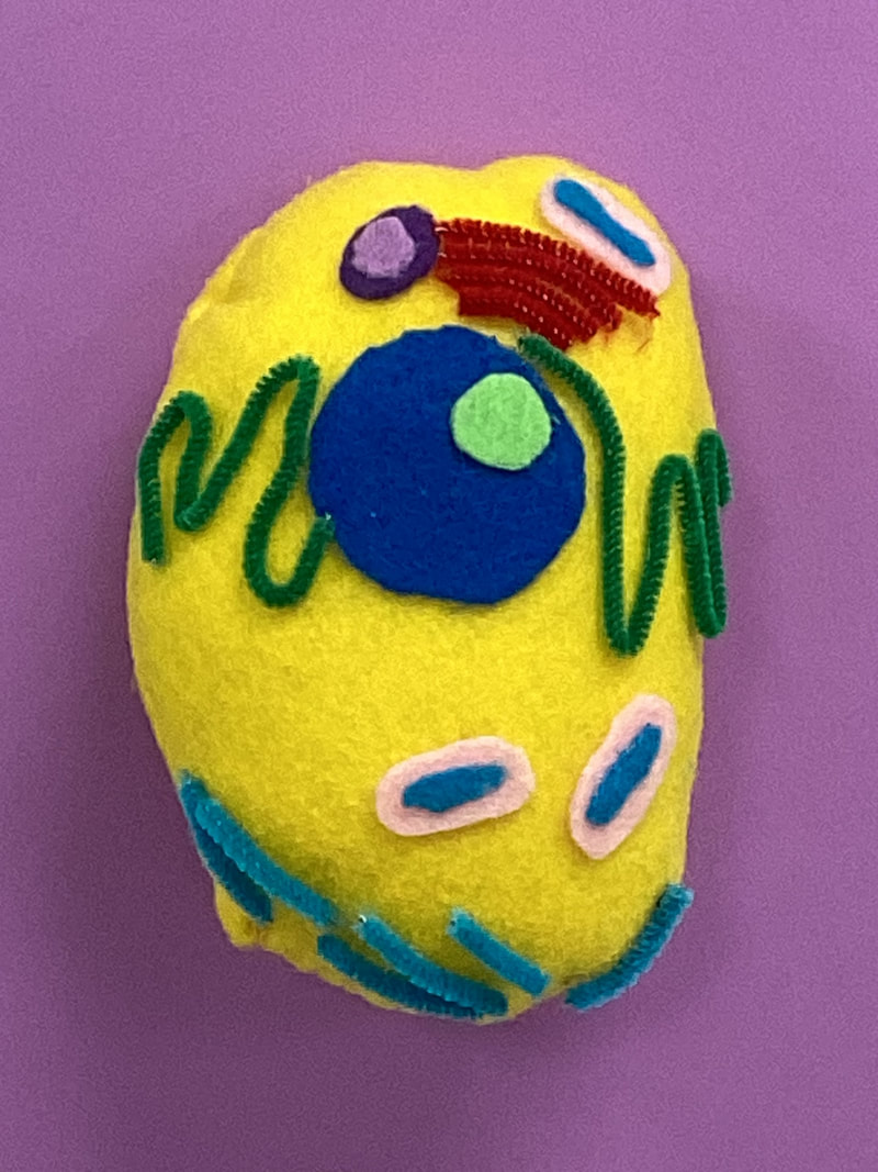 Sixth grade Art Tech students have recently been creating plant and animal CELL PILLOWS by sewing with needles and thread. The pillow designs are based on students’ drawings of reference illustrations. The organelles of the cell pillows were affixed to the surface of the cloth with fabric glue. Students stuffed their pillows with poly-fill. In this display, all of the pillows represent plant cells.
