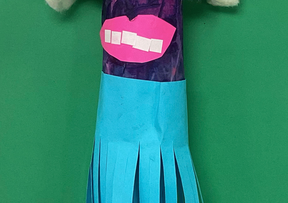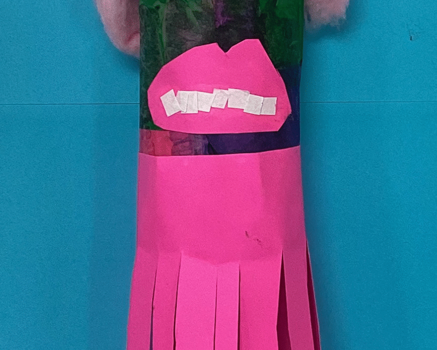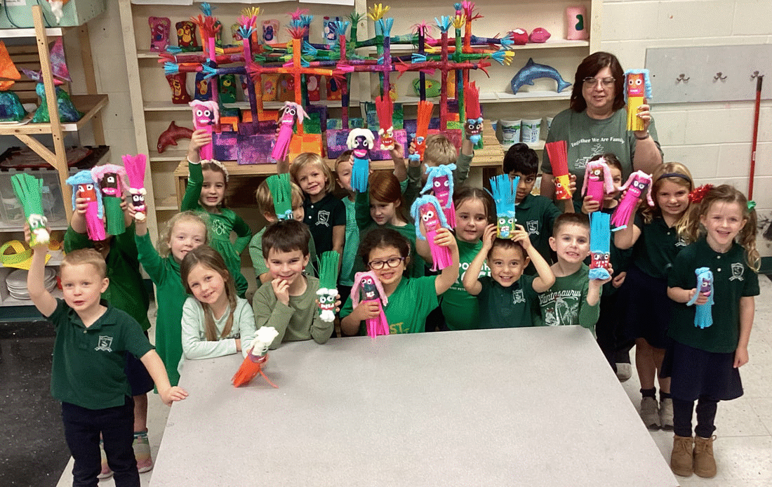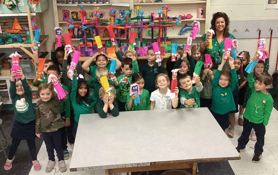 The KB and KE art classes recently completed their paper maracas. This geometry-oriented sculpture project helps students understand the concept of the cylinder by making one. The cylinder is the base form upon which students used paper, unpopped popcorn, cotton, glue, and tape to express their creativity. Kindergarten assistant teachers Mrs. Baker (KB) and Mrs. Edmison (KE) graciously assist Mr. Bell during the kindergarten art classes. They are shown in the photos with their classes.
