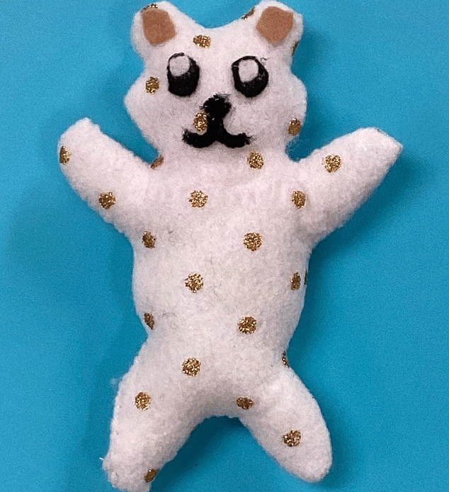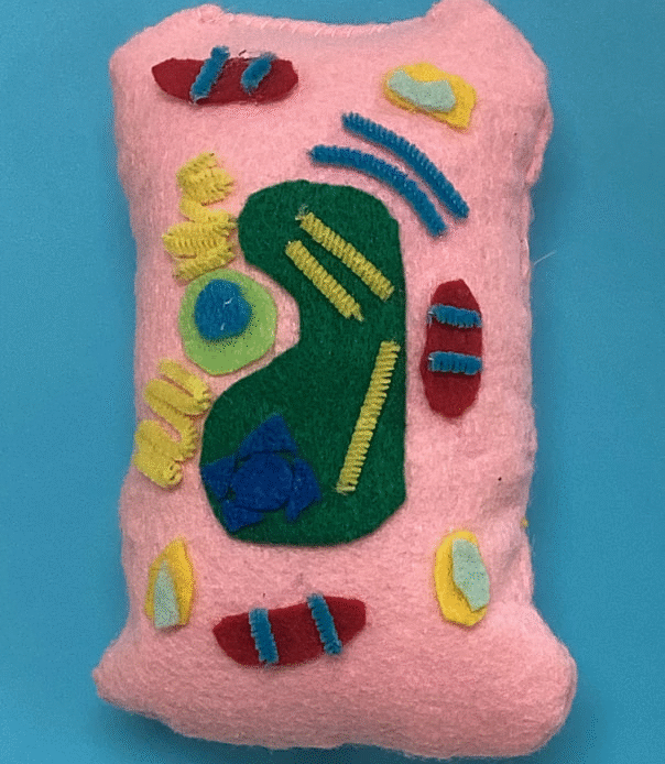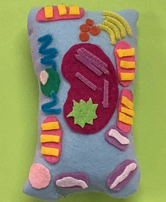 From the 6th grade Art Tech classes, a plant cell pillow by Maddy Wakefield, a cell pillow by Logan Kendrick and a teddy bear pillow by Lilly Hass appear below. The STEAM-based plant cell project teaches basic sewing skills and reinforces science content. Creating animal pillows encourages students to express themselves more freely with cloth sculpture.