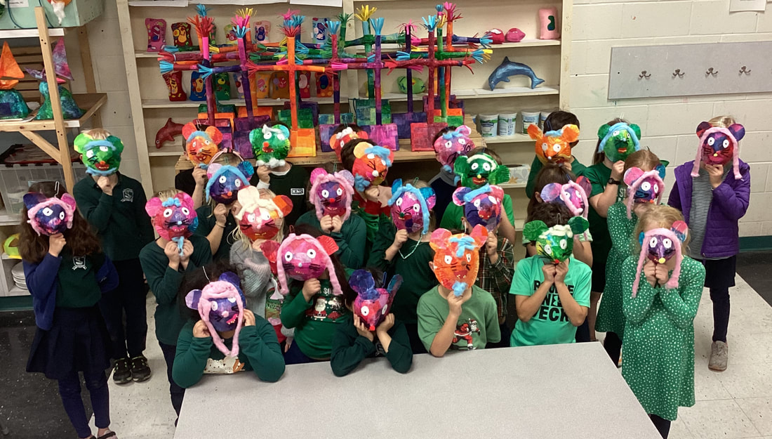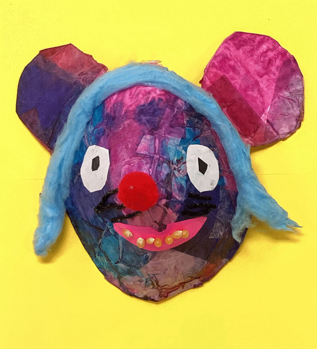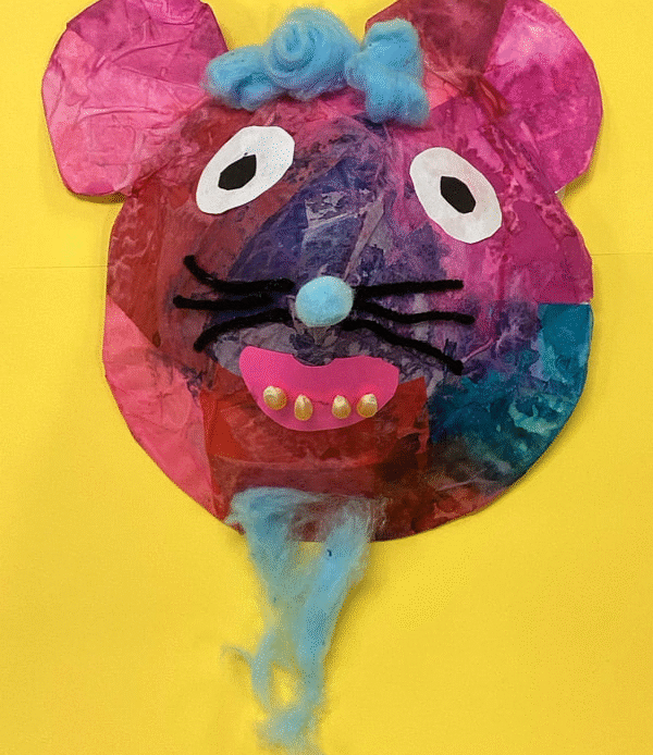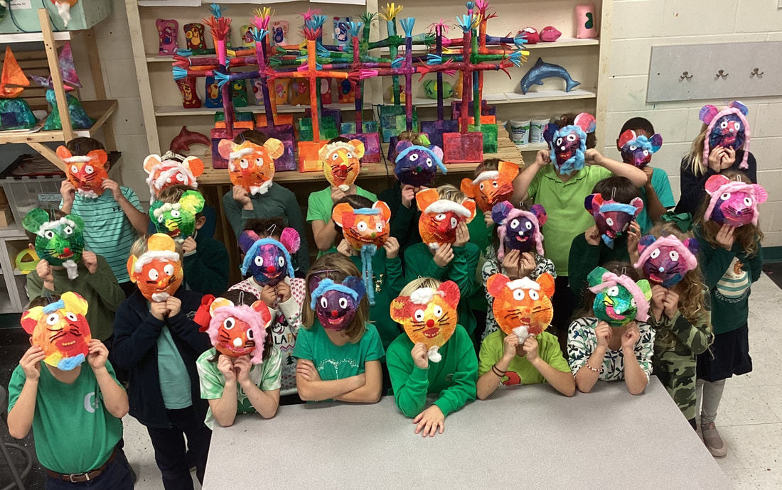 The first graders of the 1B and 1S art classes proudly display their “Mr. and Ms. Mousey Head” paper sculptures in the group photos shown below. Details of the project are visible in the closeup photos of artwork by Devenie Delph and Teddy Compton. In this geometry-based project, students internalize the concept of the cone by making them from paper plates. The cone serves as the base form upon which each student works creatively to give his or her mouse a unique personality. Materials include colored tissue paper, a glue/water mixture, card stock, yarn, corn, pom poms, cotton, tape, and paper clips.