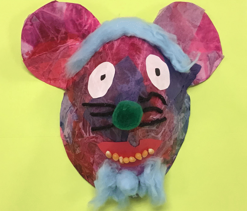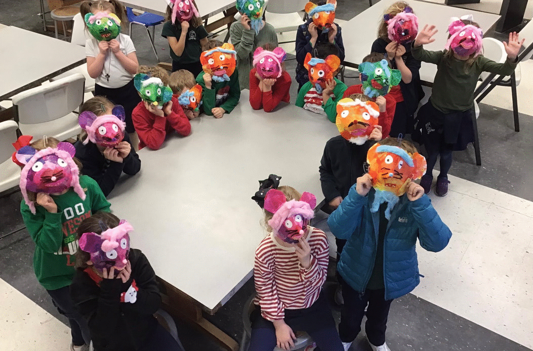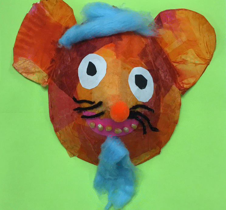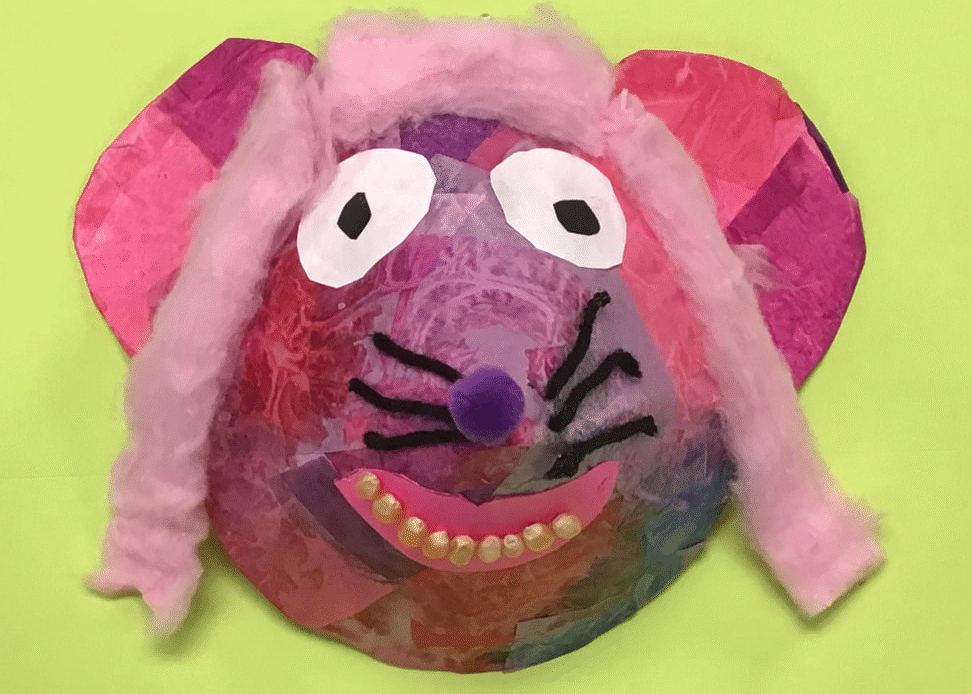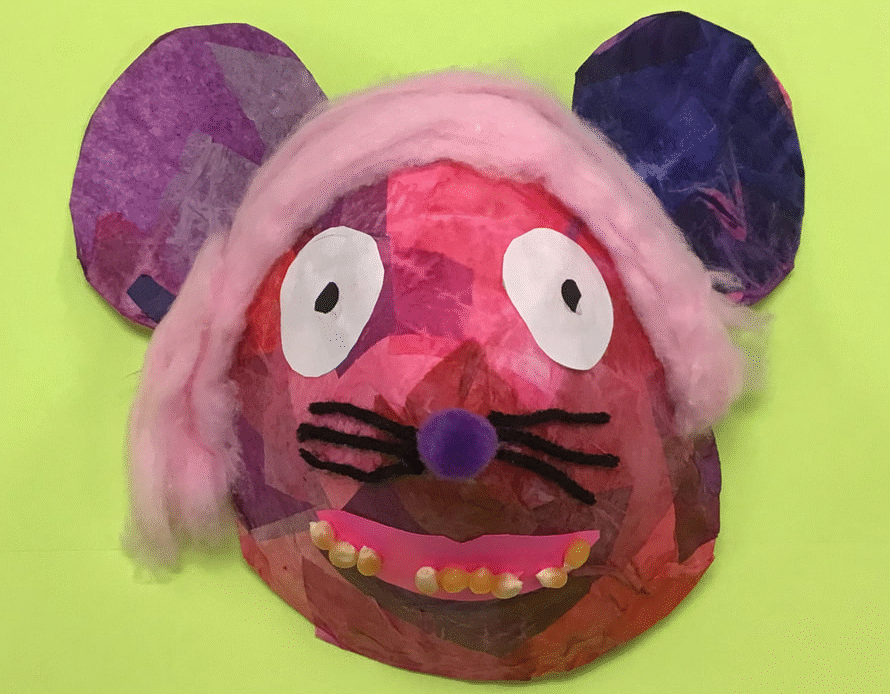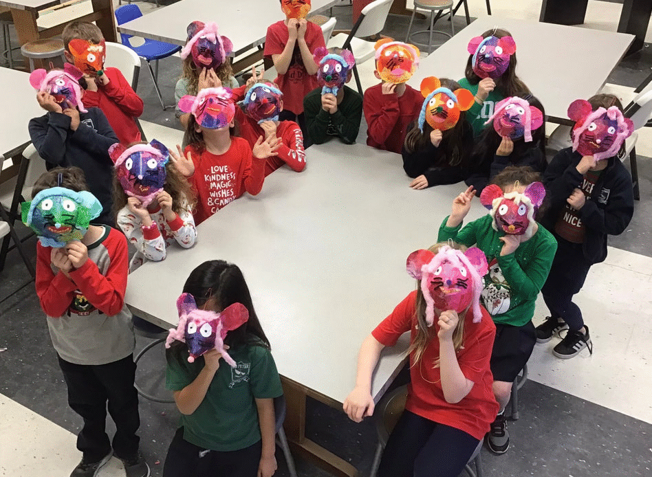 The first graders of the 1B and 1P art classes proudly display their Mr. and Ms. Mousey Head paper sculptures in the group photos shown below.  In this geometry-based art exercise, students internalize the concept of the cone by making them from paper plates.  The cone serves as the base form upon which each student works creatively to give his or her mouse a unique personality.  Materials include colored tissue paper, a glue/water mixture, card stock, yarn, corn, pom poms, cotton, tape, and paper clips.