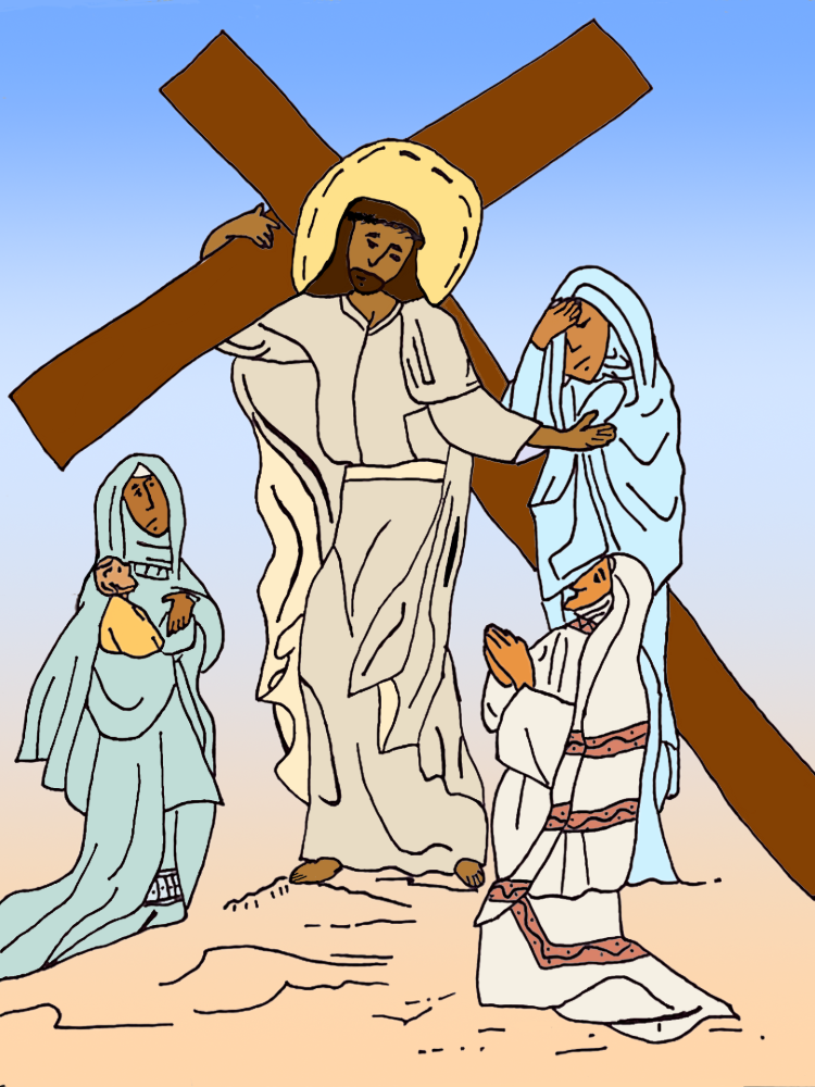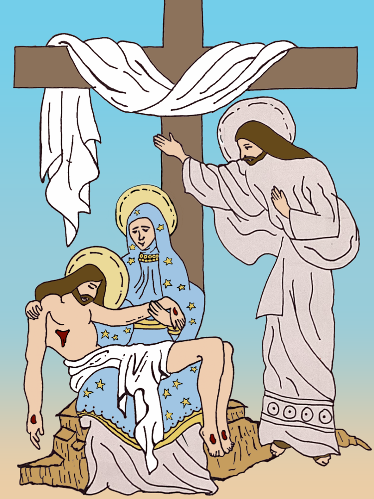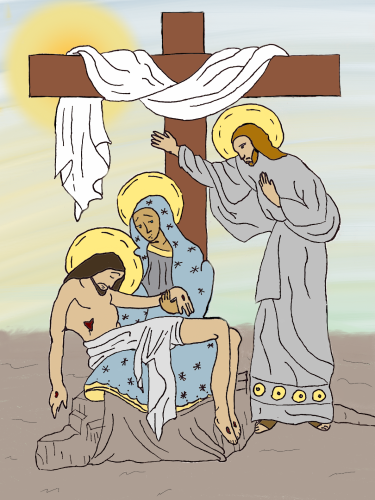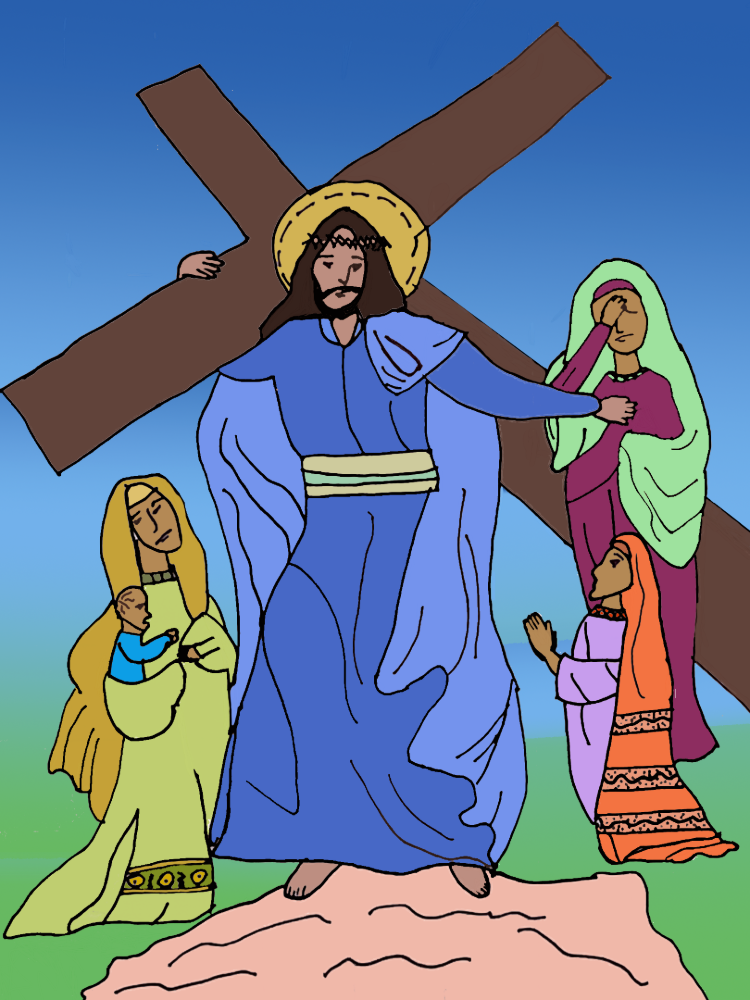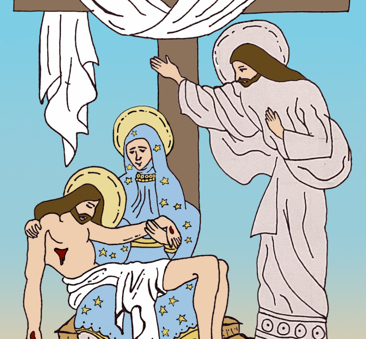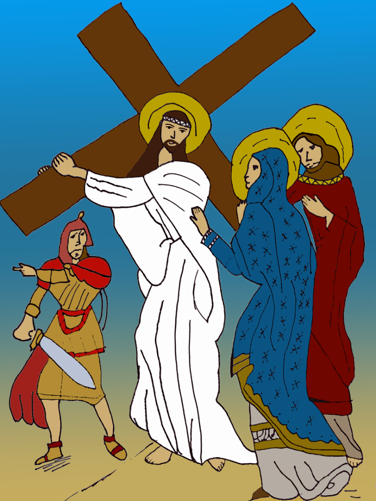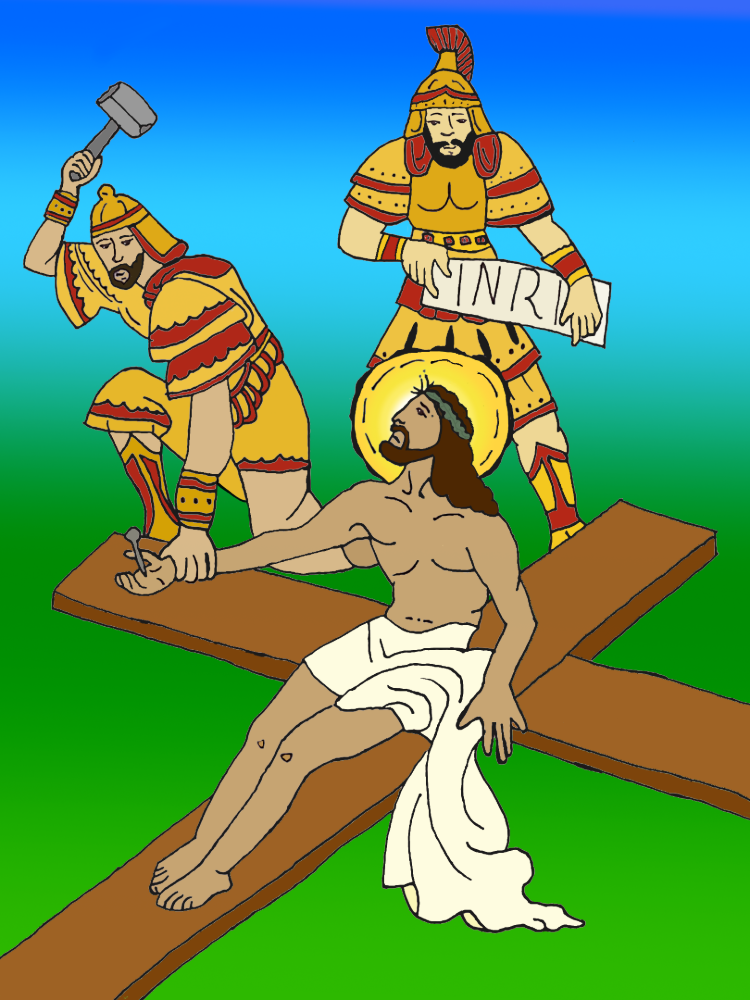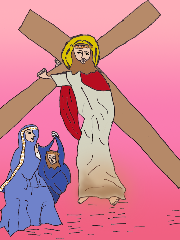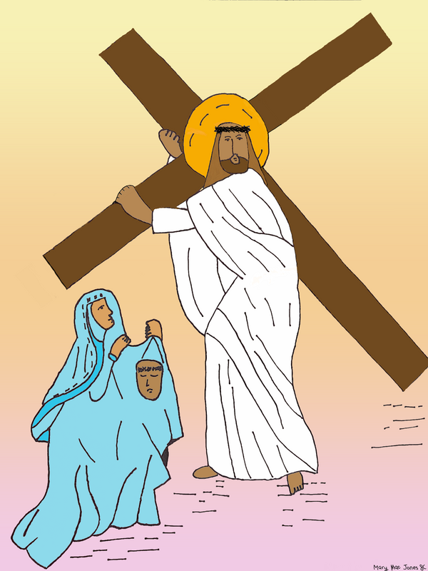 Most 8th graders have recently finished the Stations of the Cross project in Mr. Bell’s Art Tech class. The Renaissance-based grid method was used to create free-hand pencil and ink drawings of illustrations by contemporary artist Shari Van Vranken. Students edited and colored photos of their drawings with the Sketchbook app on their iPads.