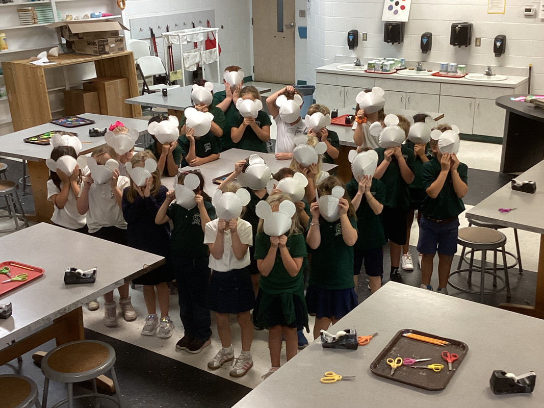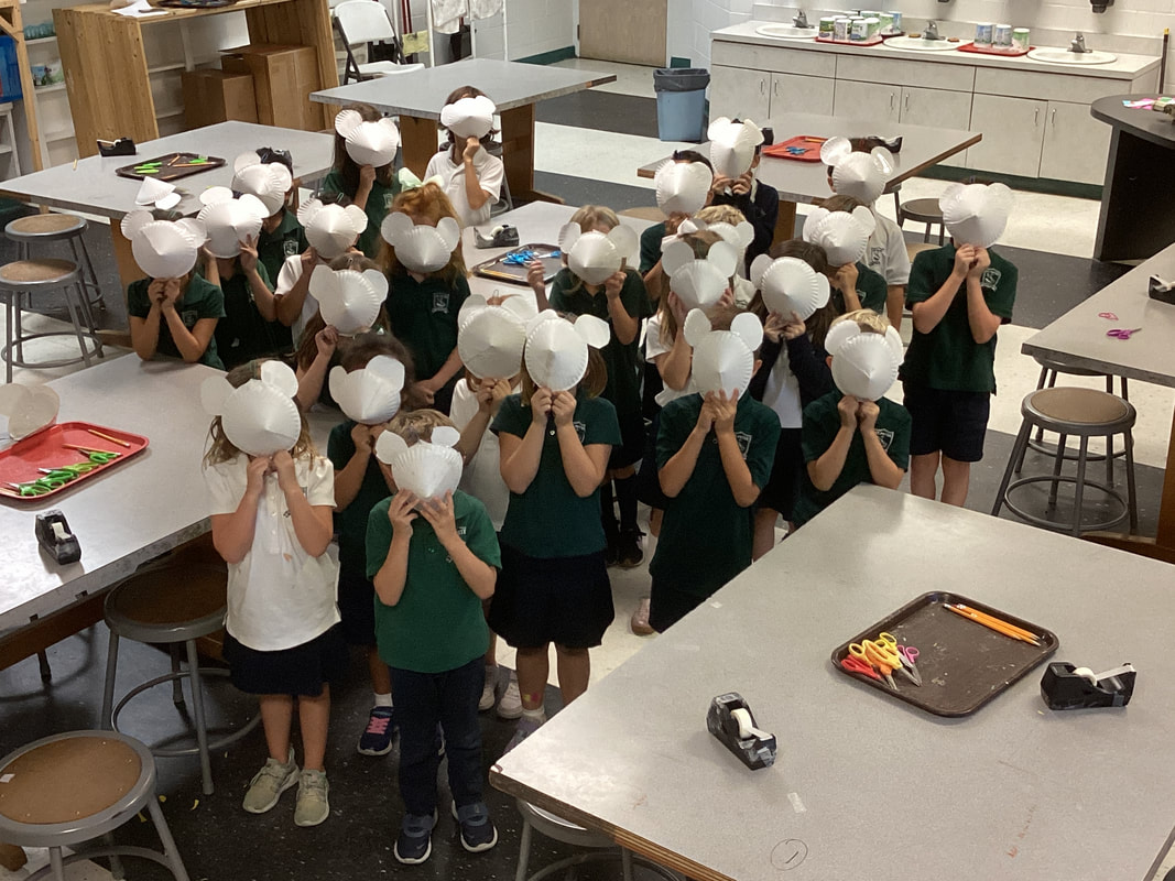 The 1B and 1S art students are shown below proudly displaying the base structures of their Mr. and Ms. Mousey Head paper sculptures.  In this geometry-based art project, students internalize the concept of the cone by making one from a paper plate.  The cone serves as the base form upon which each student will work creatively to give his or her mouse head a unique personality.  During the next few weekly classes, students will use colored tissue paper, a glue/water mixture, yarn, corn, pom poms, and cotton to finish their sculptures.