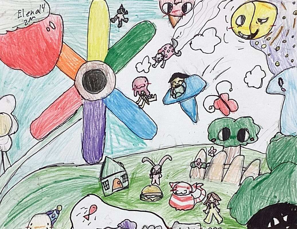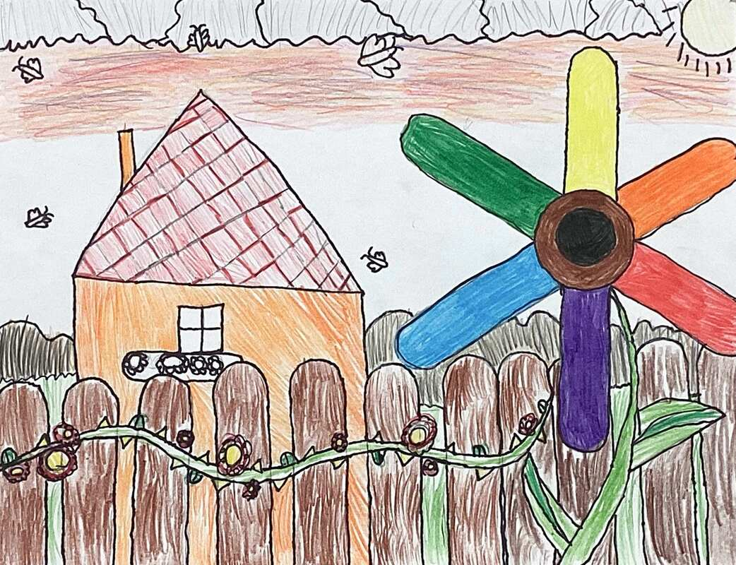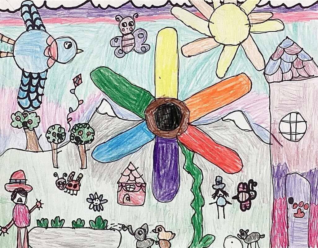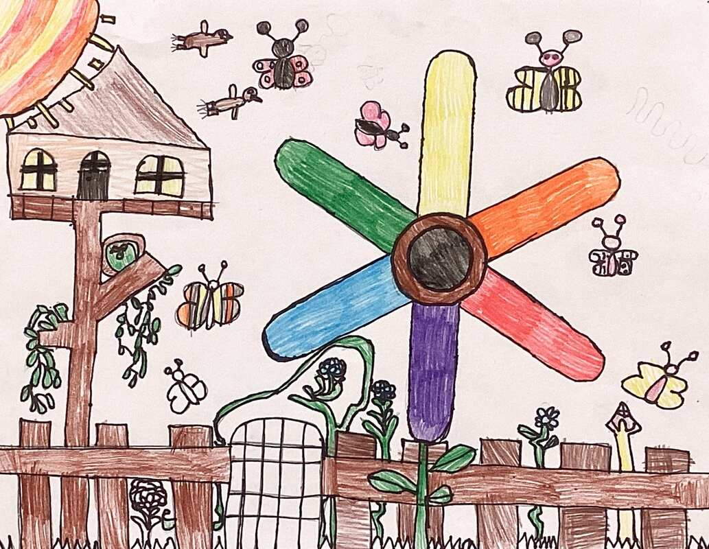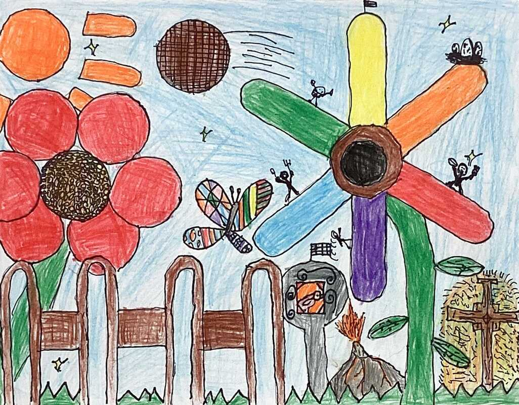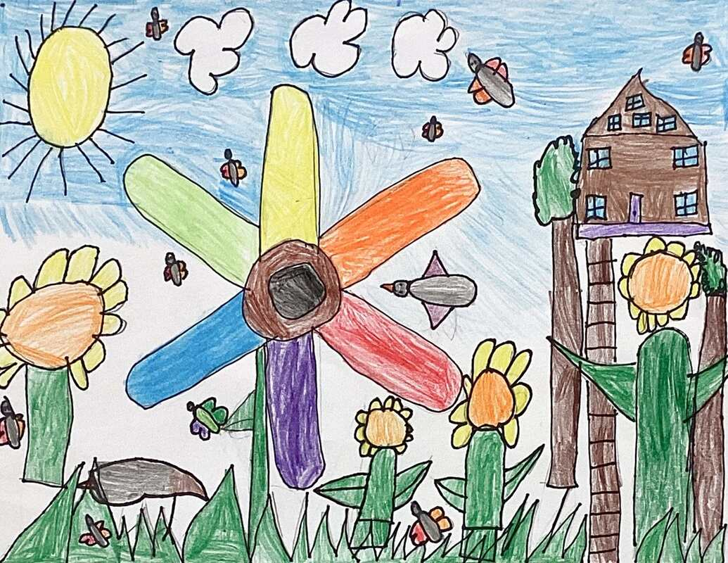 Second grade art students recently drew “Color Wheel Flower Gardens” with pencils, colored pencils, and permanent markers. The dominant flower in each composition has petals that show a 6-part color wheel. Brown and black appear in the central circle of the color wheel flowers because they can be obtained by mixing the three primaries in different proportions.