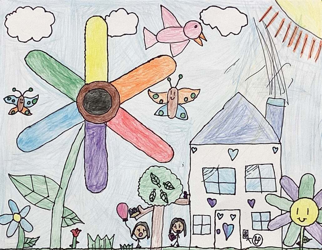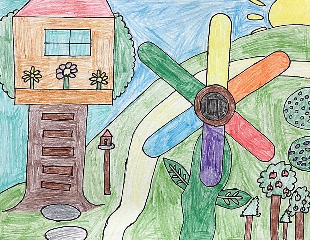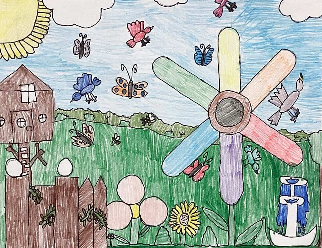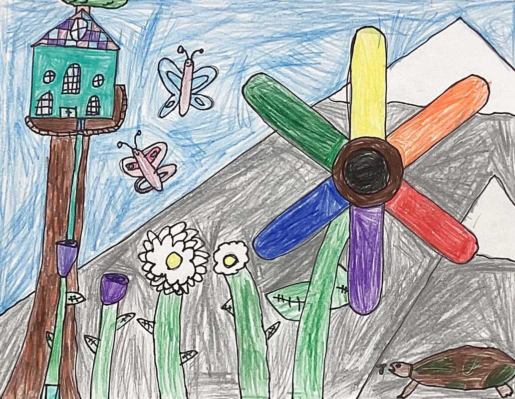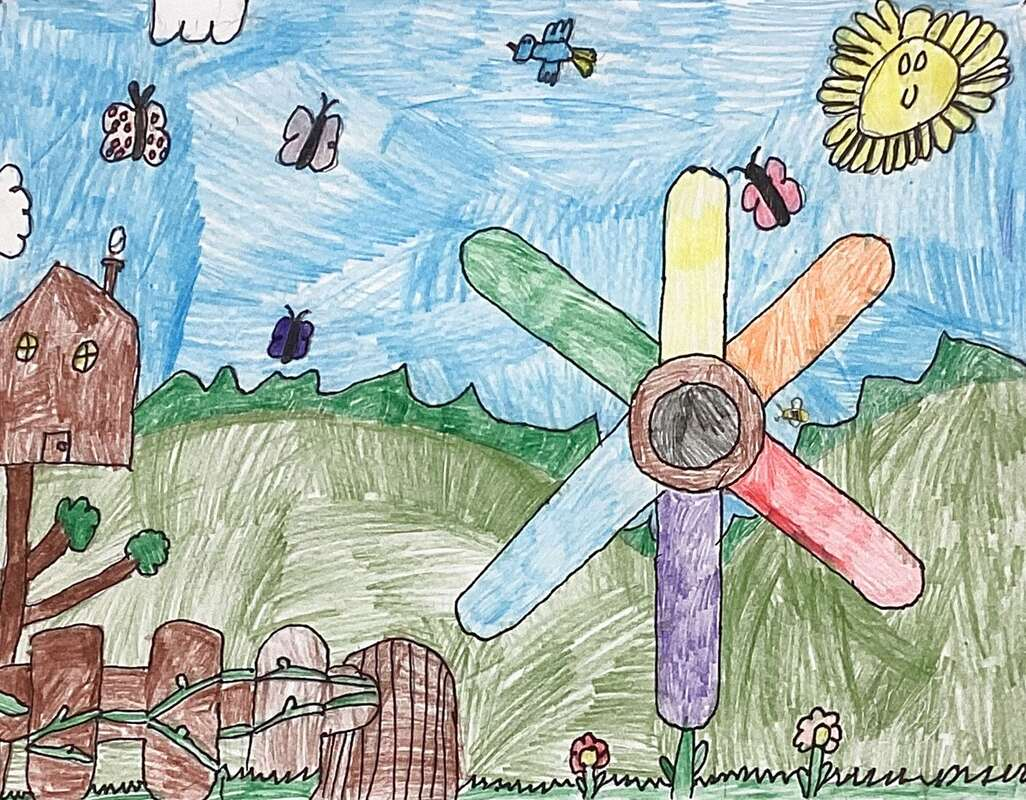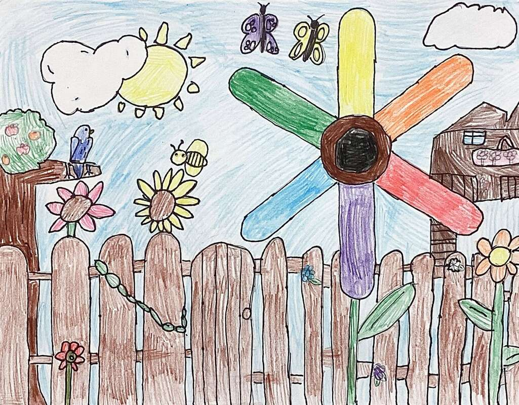 Second grade art students recently drew “Color Wheel Flower Gardens” with pencils, colored pencils, and permanent markers. The dominant flower in each composition has petals that show a 6-part color wheel. Brown and black appear in the central circle of the color wheel flowers because they can be obtained by mixing the three primaries in different proportions.
