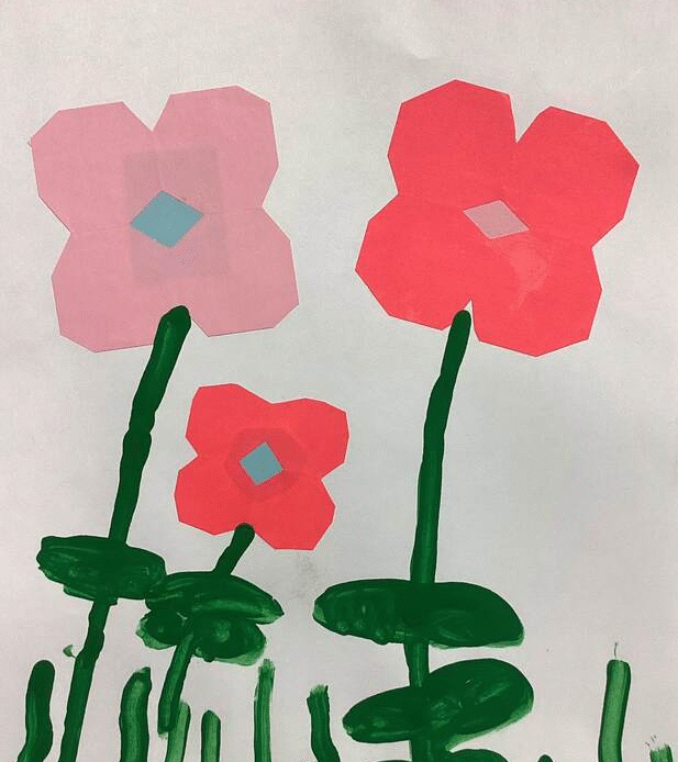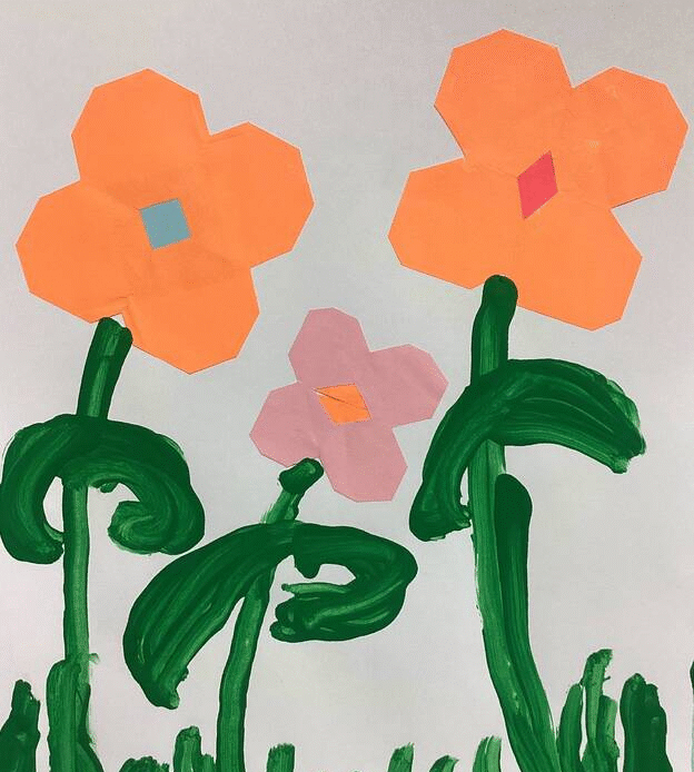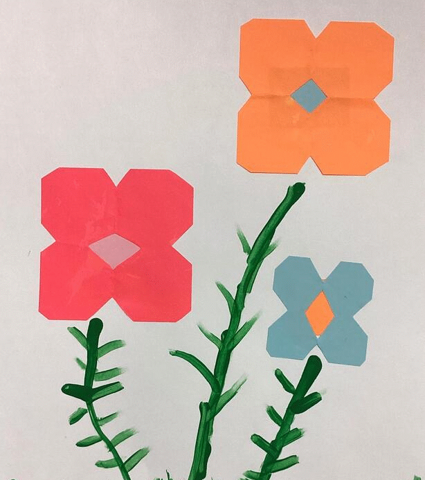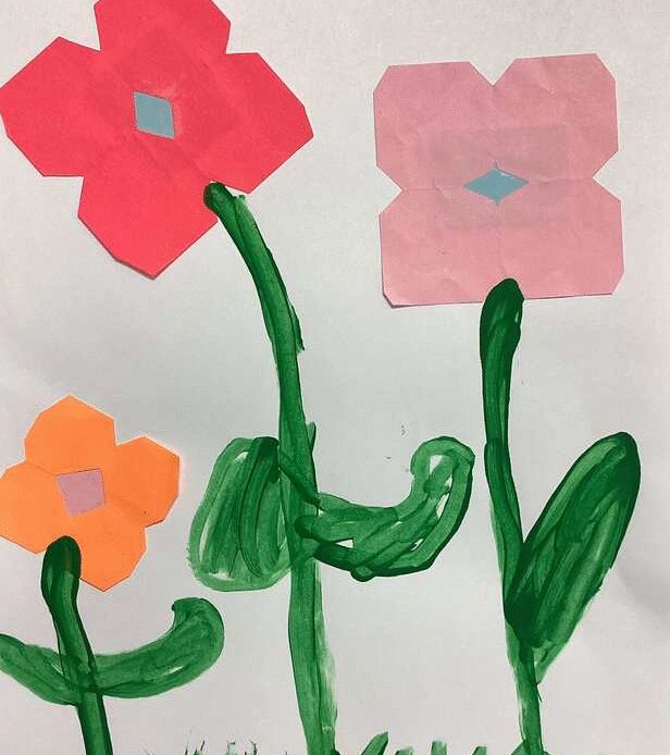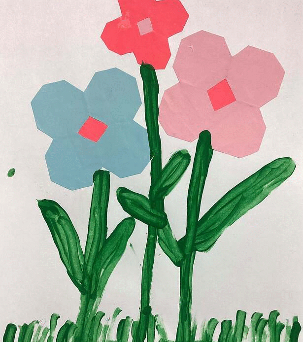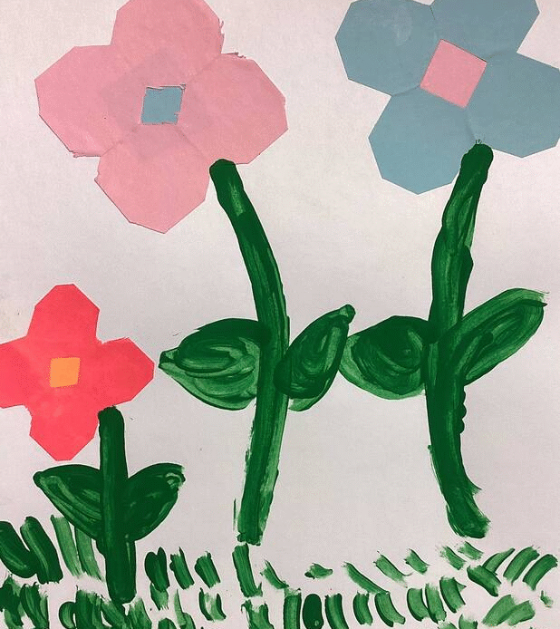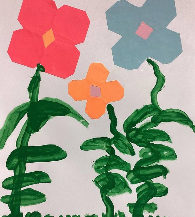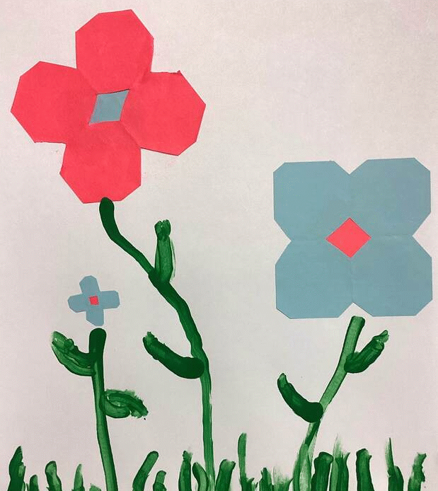 Kindergarteners made symmetrical paper flowers by folding, cutting, and gluing colored paper. Tempera paint was used to create grass, stems, and leaves in these artworks from the KB class.