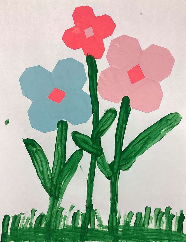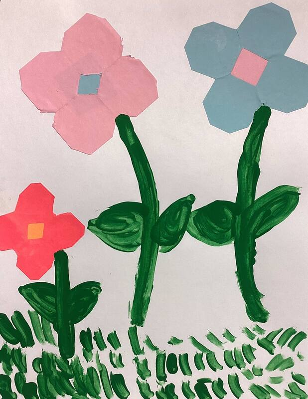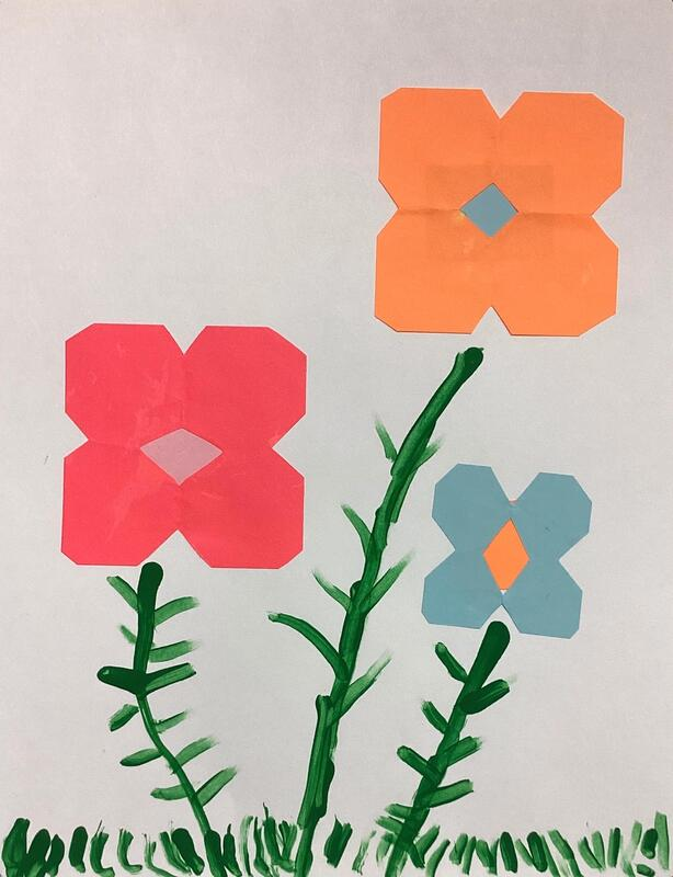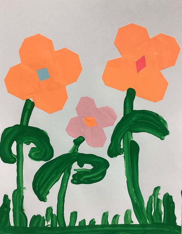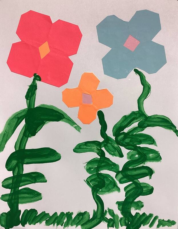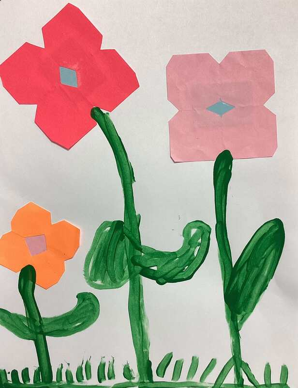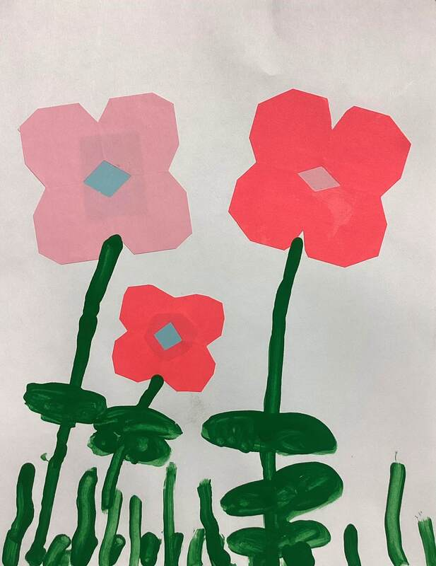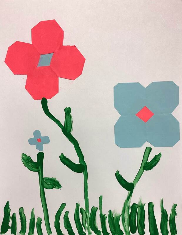Kindergarteners made symmetrical paper flowers by folding, cutting, and gluing colored paper.  Tempera paint was used to create grass, stems, and leaves in these artworks from the KB class.