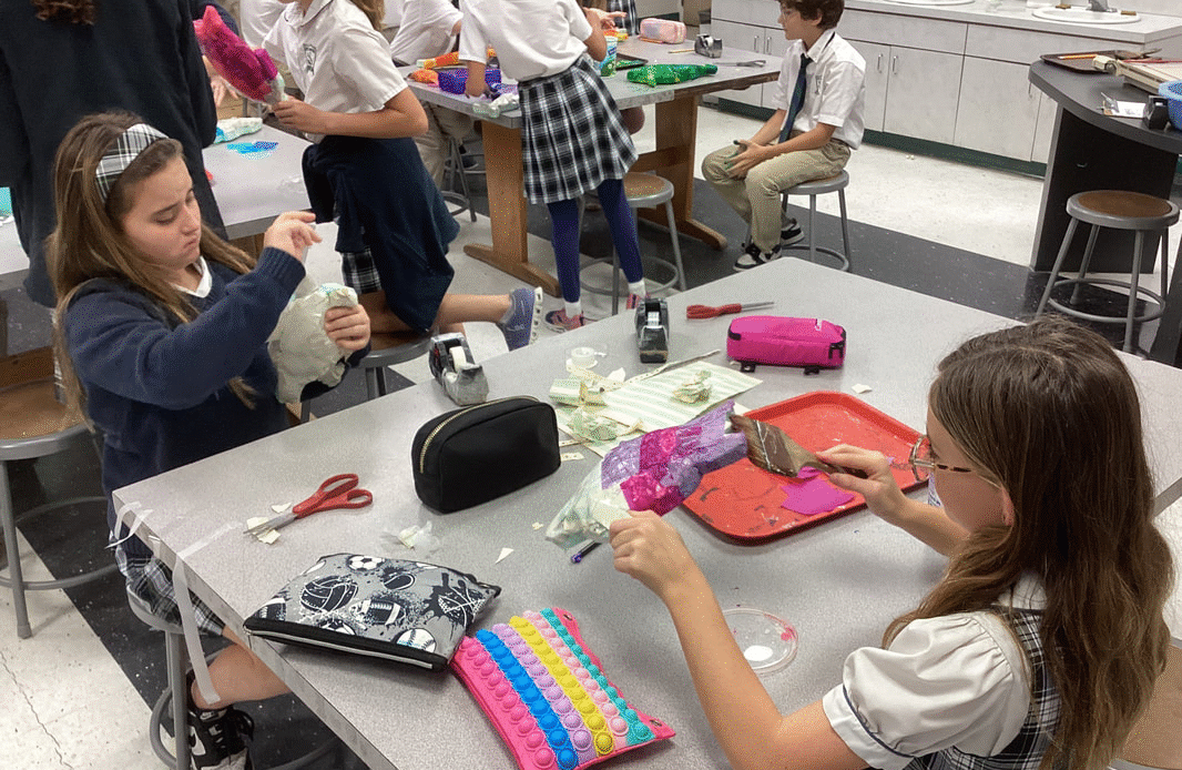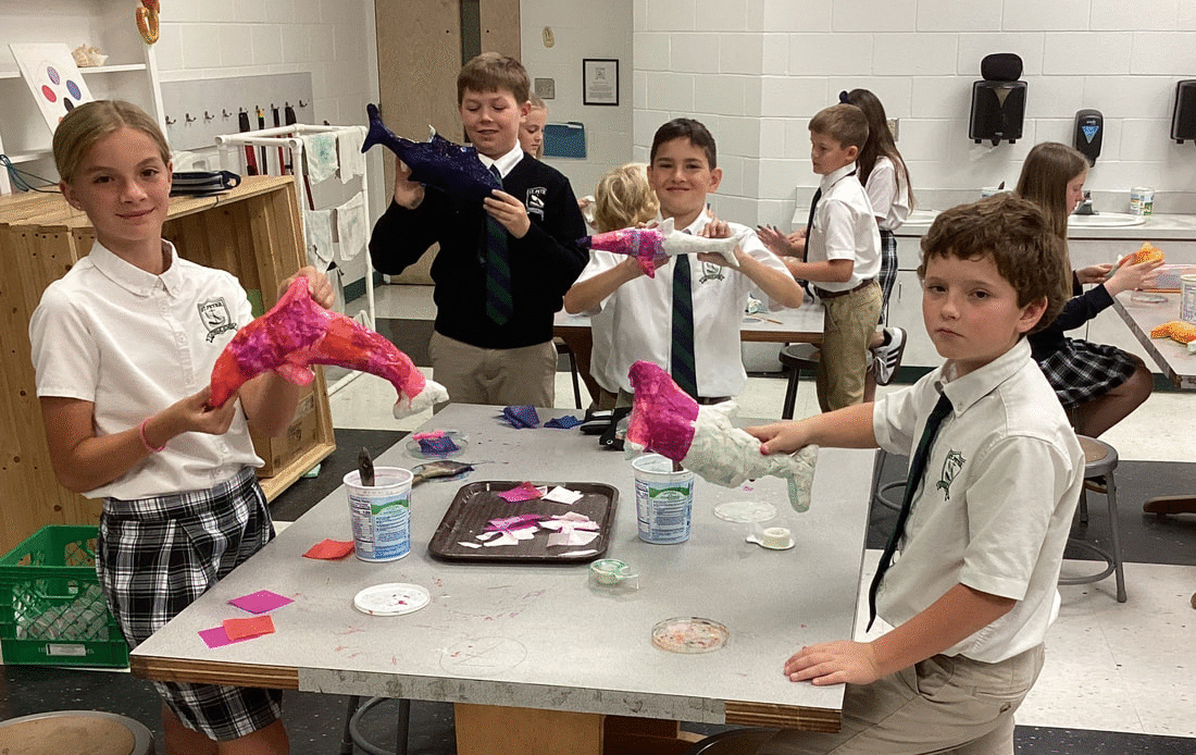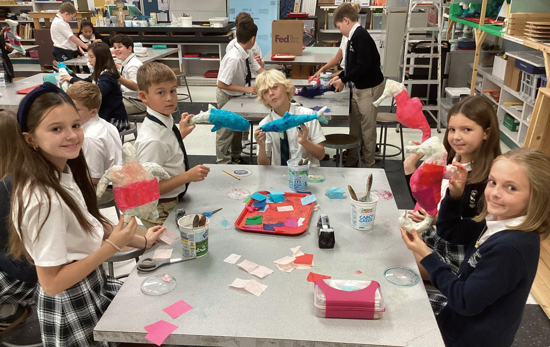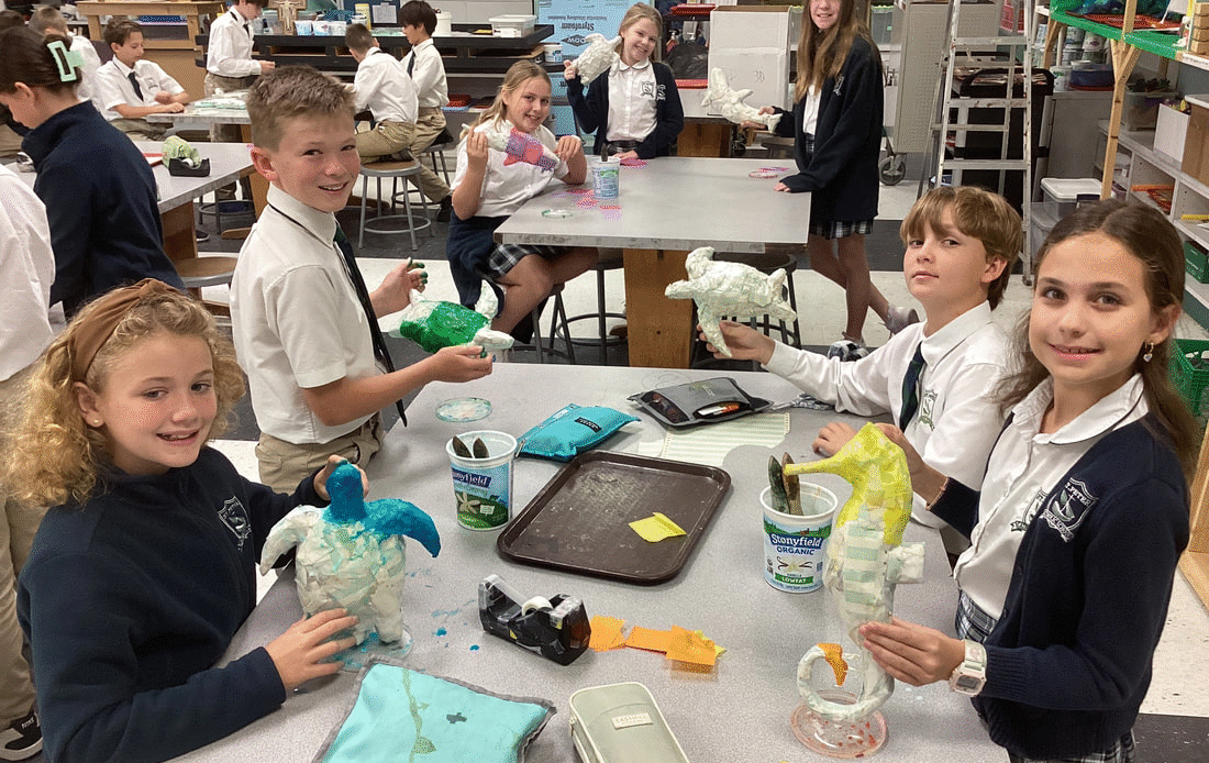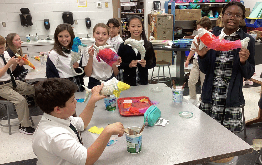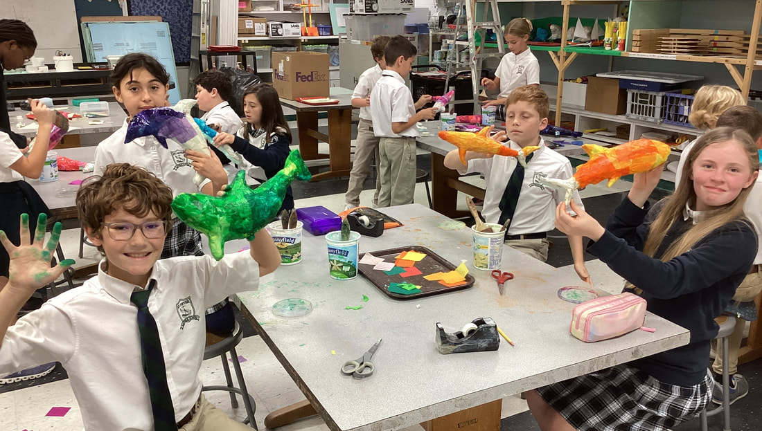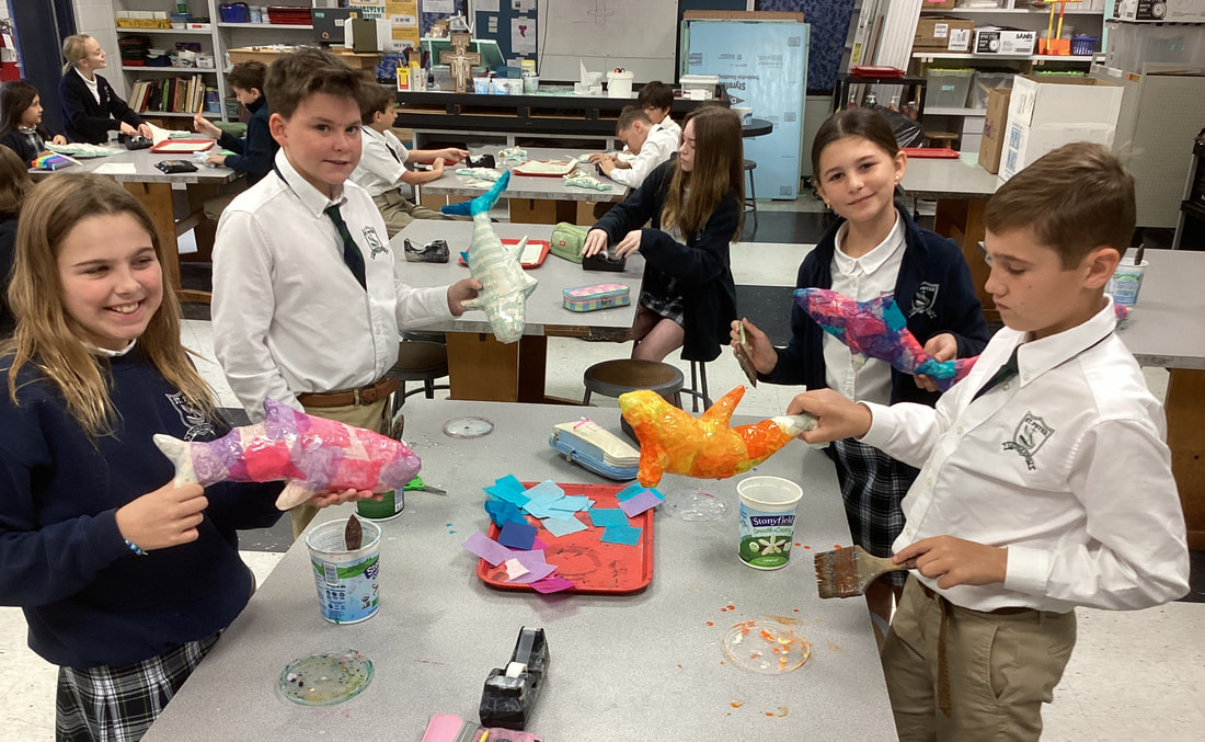 As shown in the photos below, fifth grade art students are currently applying paper mache to the surface of their relief sculptures of sea animals.  Students used the grid method to draw from photos. After transferring their drawings of aquatic animals to Styrofoam sheets, students cut out the shapes of the animals with hacksaw blades.  The form of each animal was built up with paper and tape on the Styrofoam base, which most students reinforced with splints made of popsicle sticks and tape.   After applying paper mache and glitter glue to create a colorful skin, they will make hanging hooks with paper clips and screws.