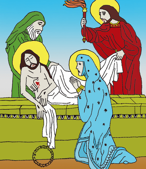 Eighth grader William Edwards recently completed a beautiful drawing of the fourteenth Station of the Cross.  Using the grid method, he created a freehand pencil and ink drawing of an illustration by artist Shari van Vranken.  The final image, which you see here, is a photo of his drawing that he colored with the Sketchbook app on his iPad.