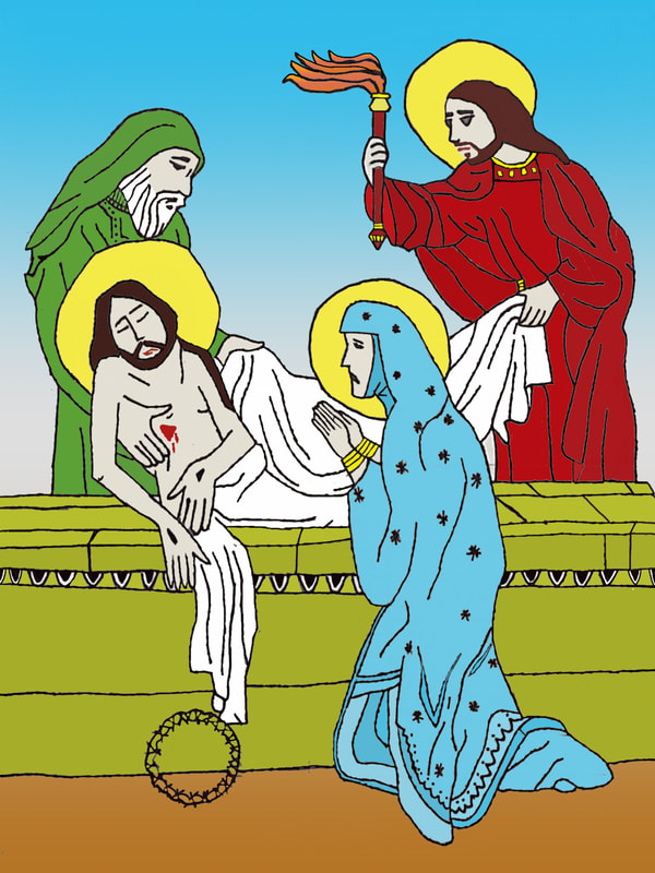 Eighth grader William Edwards recently completed a beautiful drawing of the fourteenth Station of the Cross. Using the grid method, he created a freehand pencil and ink drawing of an illustration by artist Shari van Vranken. The final image, which you see here, is a photo of his drawing that he colored with the Sketchbook app on his iPad.
