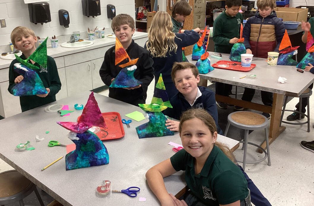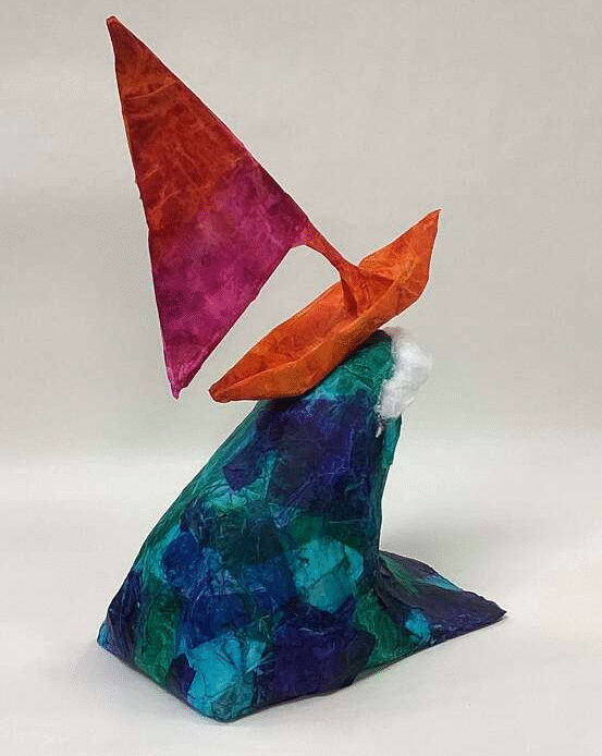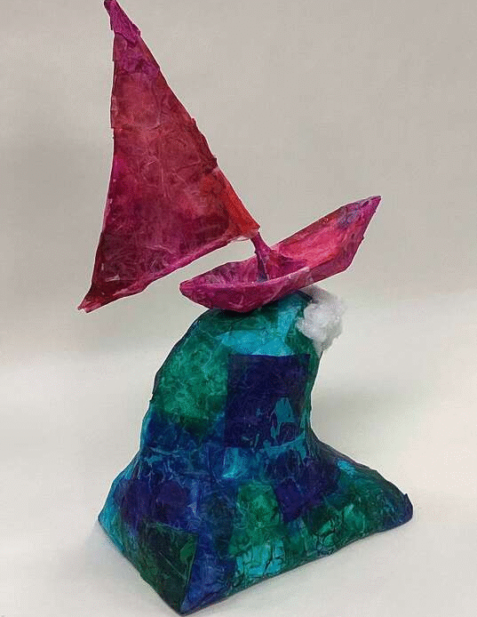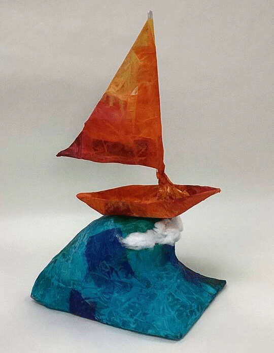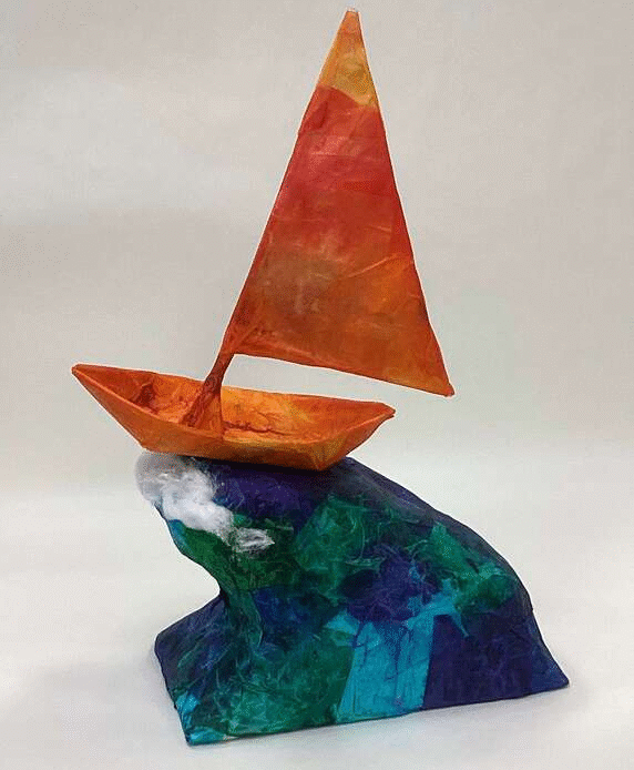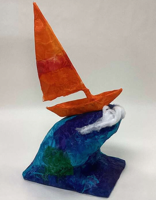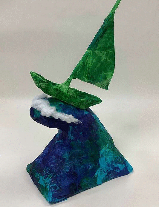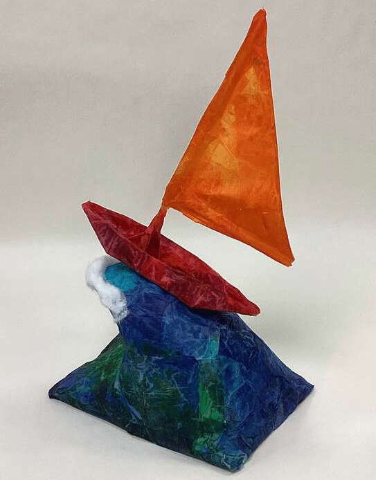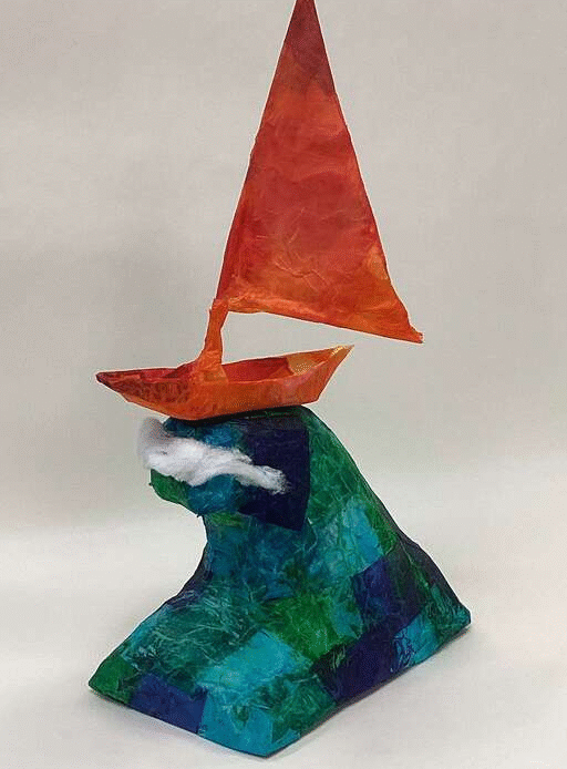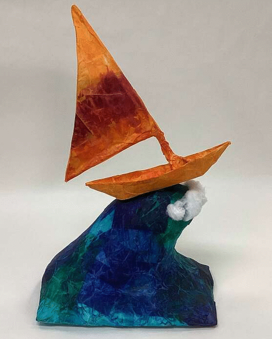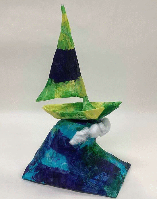 Fourth grade art students have recently been creating sculptures which depict sailboats on waves.  The boat structures combine origami with measuring, cutting, and taping paper and plastic straws.  The boats are mounted on wave structures composed of wadded paper, cardboard, and tape.  A paper mache skin coats the boats and waves.   The boats are attached to the waves with glue and one Phillips screw.  Cotton forms the foam on the waves.
