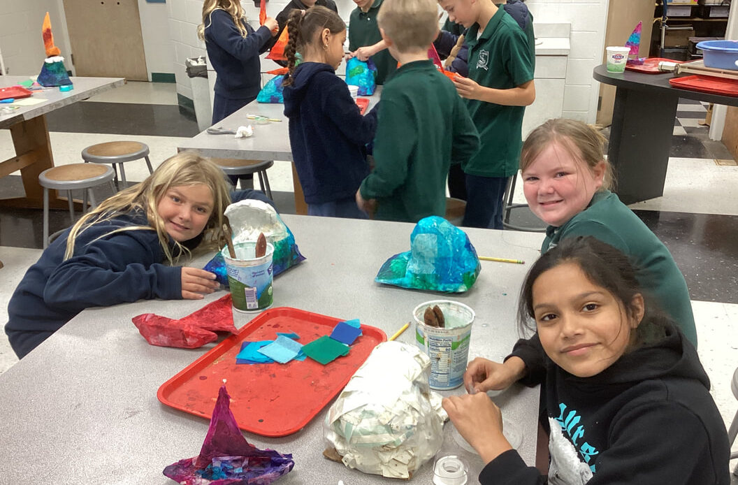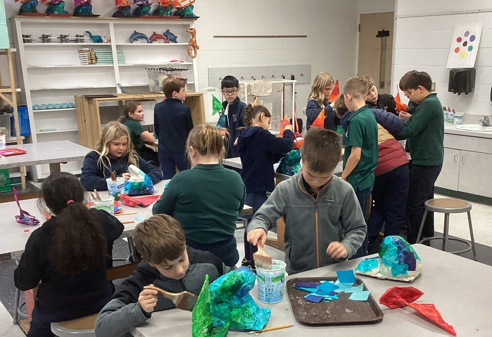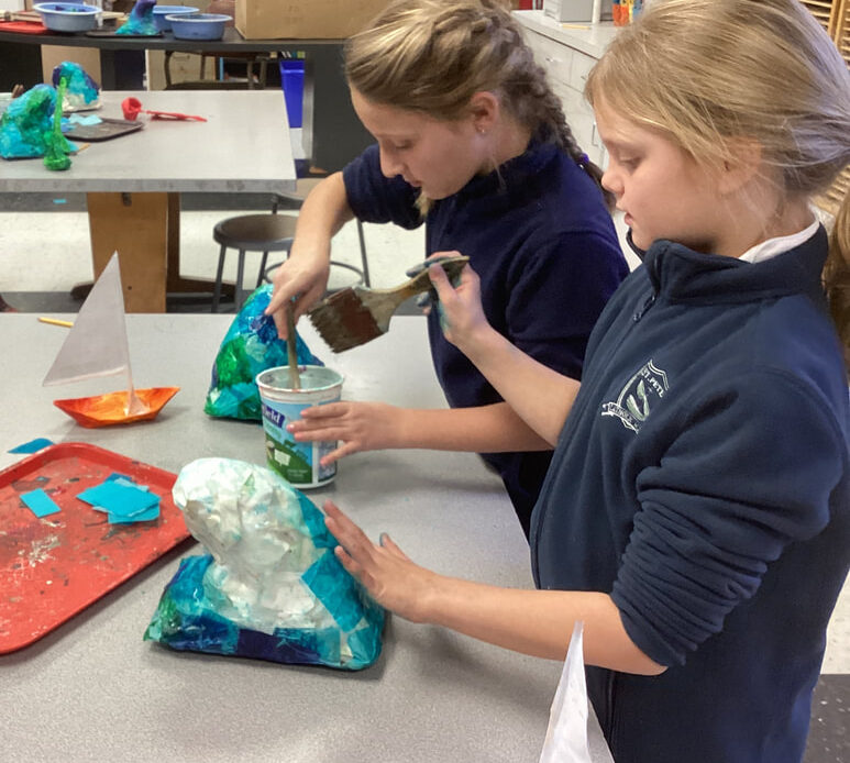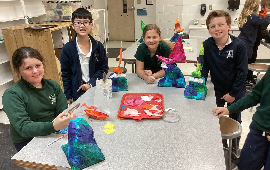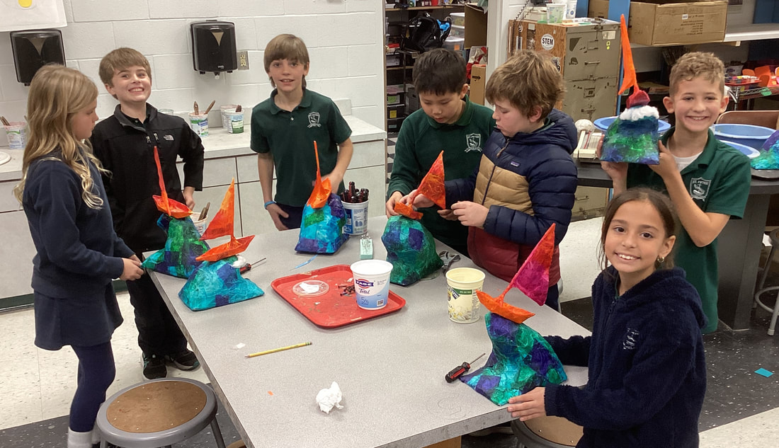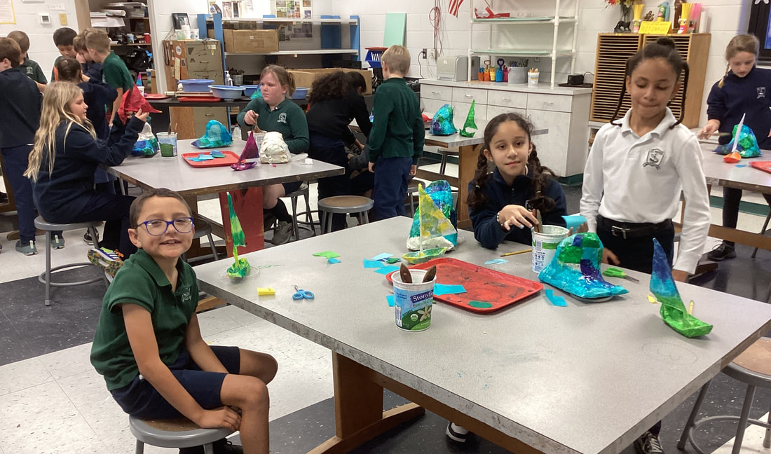 Fourth grade art students have recently been creating sculptures which depict sailboats on waves.  The boat structures combine origami with measuring, cutting, and taping paper and plastic straws.  The boats are mounted on wave structures composed of wadded paper, cardboard, and tape.  A paper mache skin coats the boats and waves.   The boats are attached to the waves with glue and one Phillips screw.  Cotton forms the foam on the waves.
