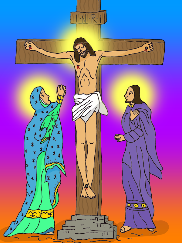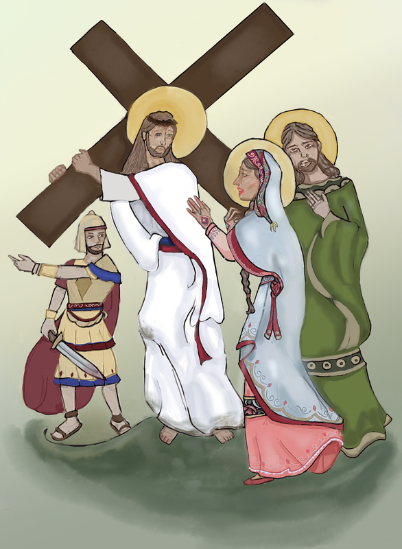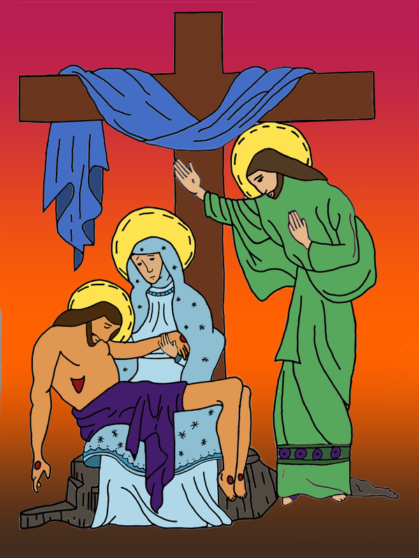 Eighth graders in Mr. Bell’s Art Tech classes used the Renaissance-based grid method to create free-hand pencil and ink drawings of the Stations of the Cross which they colored electronically on iPads. Illustrations by contemporary artist Shari Van Vranken served as models for this student art.