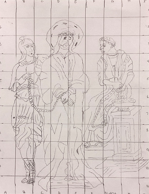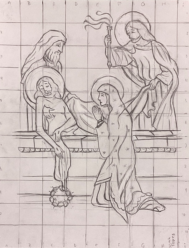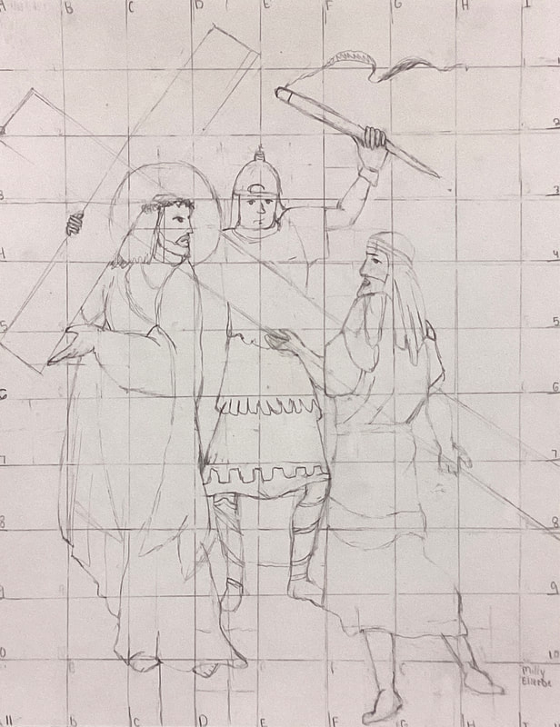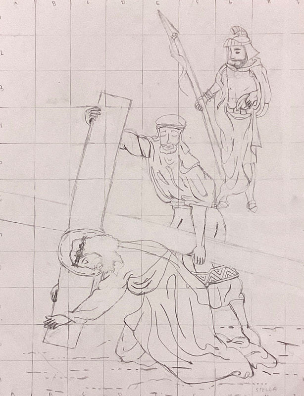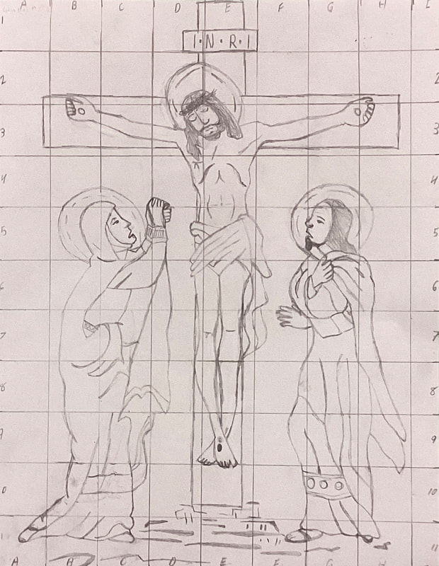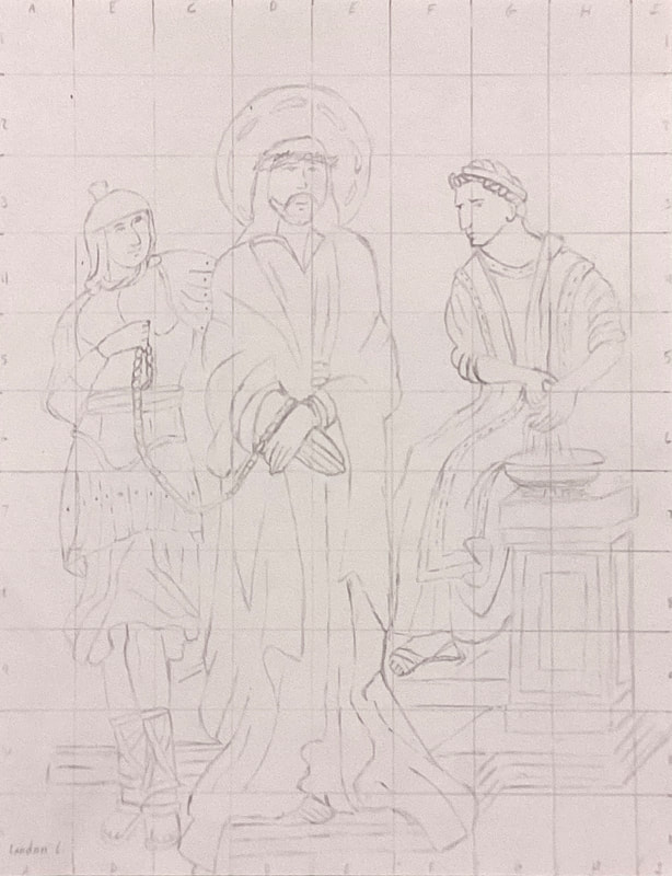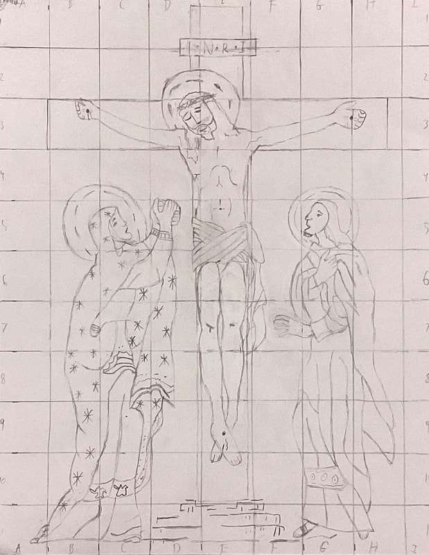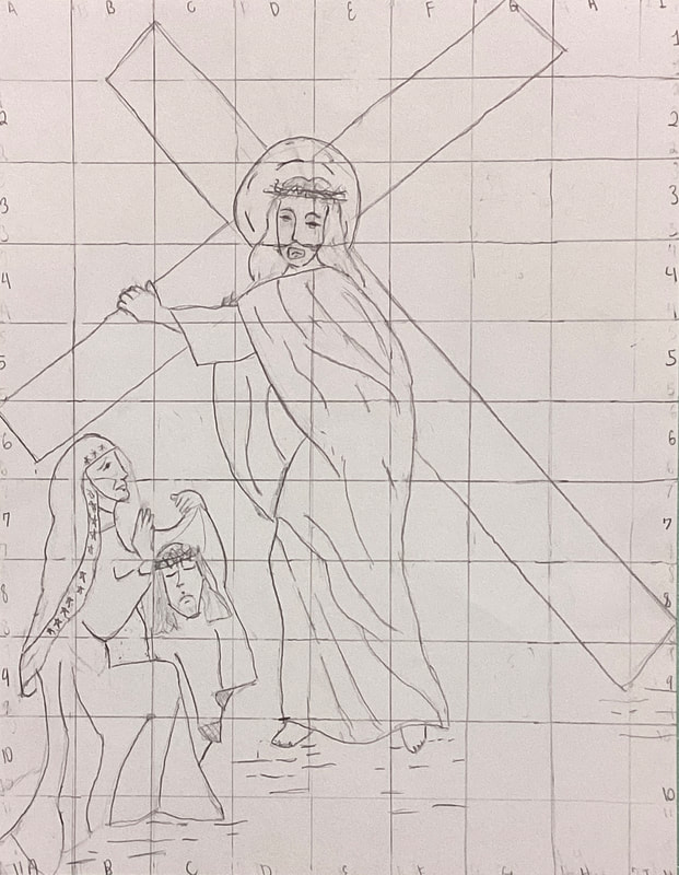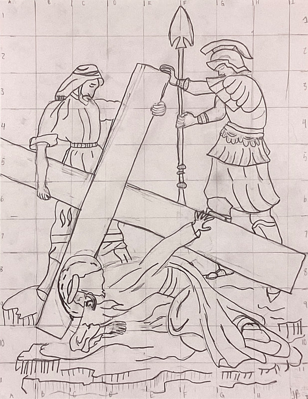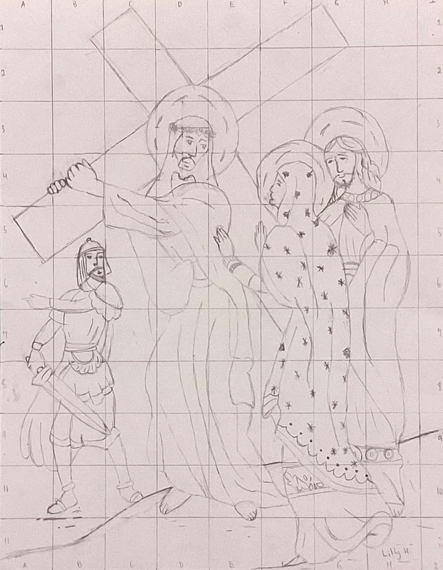 To start the 2025-26 school year, 8th graders have begun drawing the Stations of the Cross in Mr. Bell’s Art Tech class. Students drew grids with 1/2-inch squares on small prints of illustrations by contemporary artist Shari Van Vranken. Proportionate grids with 1-inch squares were drawn on larger sheets of card stock in order to scale up the small images. Math concepts are reinforced as students must remain focused on corresponding positions on 2 graphs as they draw the contents of each grid block. When finished with their pencil drawings, students will go over their lines with permanent marking pens. Students will photograph their drawings after erasing the grid lines and stray pencil marks. Then, the images will be developed further and colored electronically with the Sketchbook graphic design app on students’ iPads.
