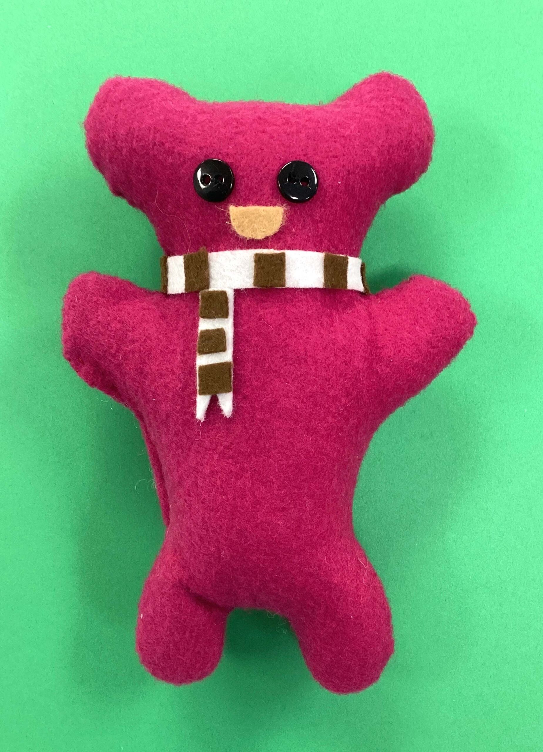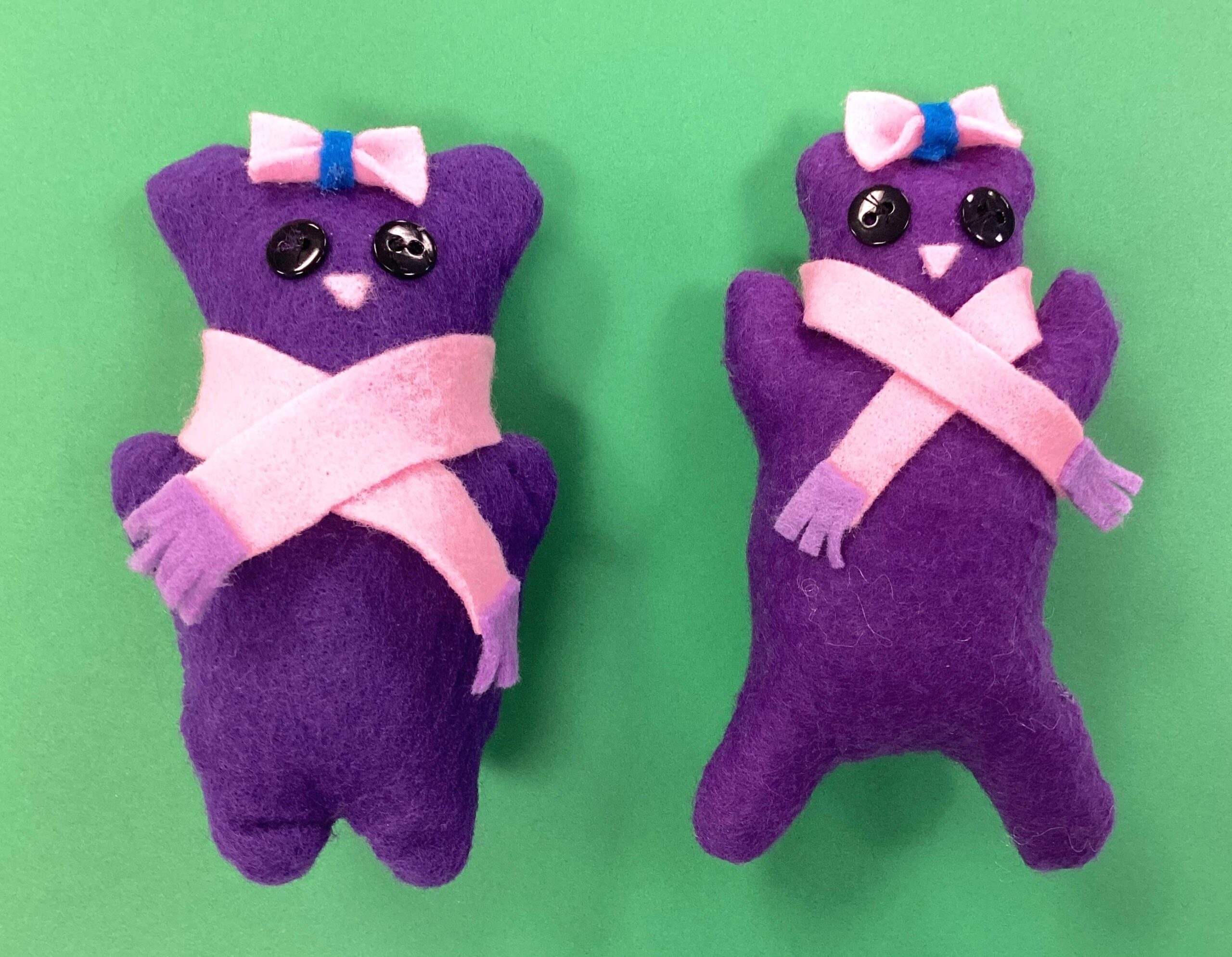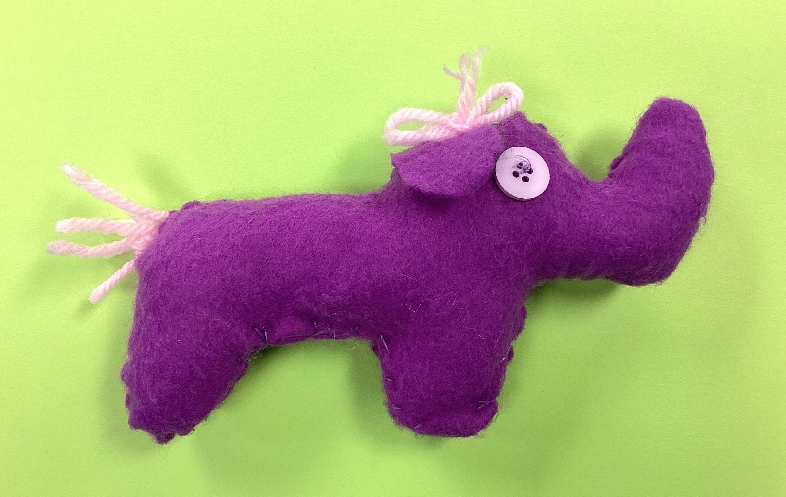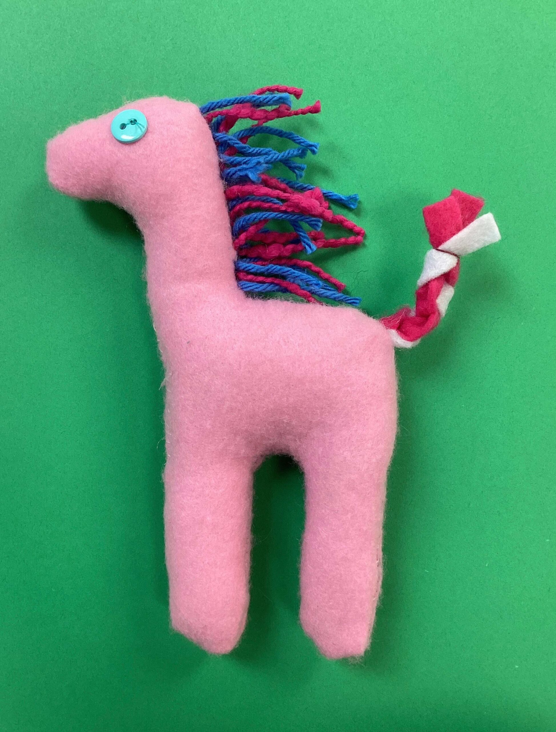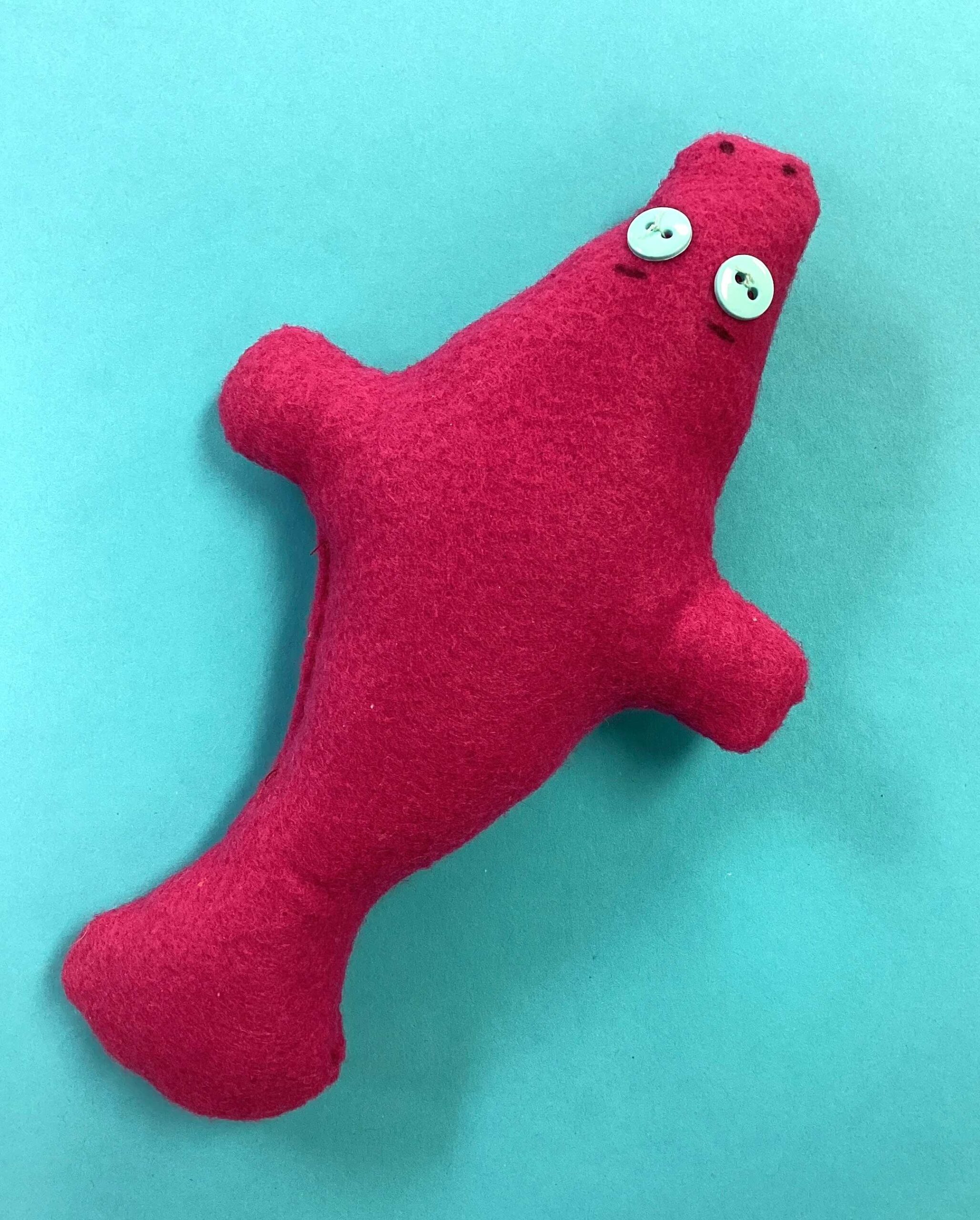 In Art Tech class, 6th graders have been designing and creating cloth sculptures.  They transferred their drawings to one side of a folded cloth and used the running stitch along the entire edge of the form, except for a pull-through hole.  After cutting outside of the stitching line, the main form of each pillow was turned inside-out and stuffed with poly-fill.  The whip stitch sealed the pillow form.  Students also learned to sew on buttons for eyes.  Other surface features have been made with carefully cut scraps of cloth and yarn that have been attached with glue or stitches.