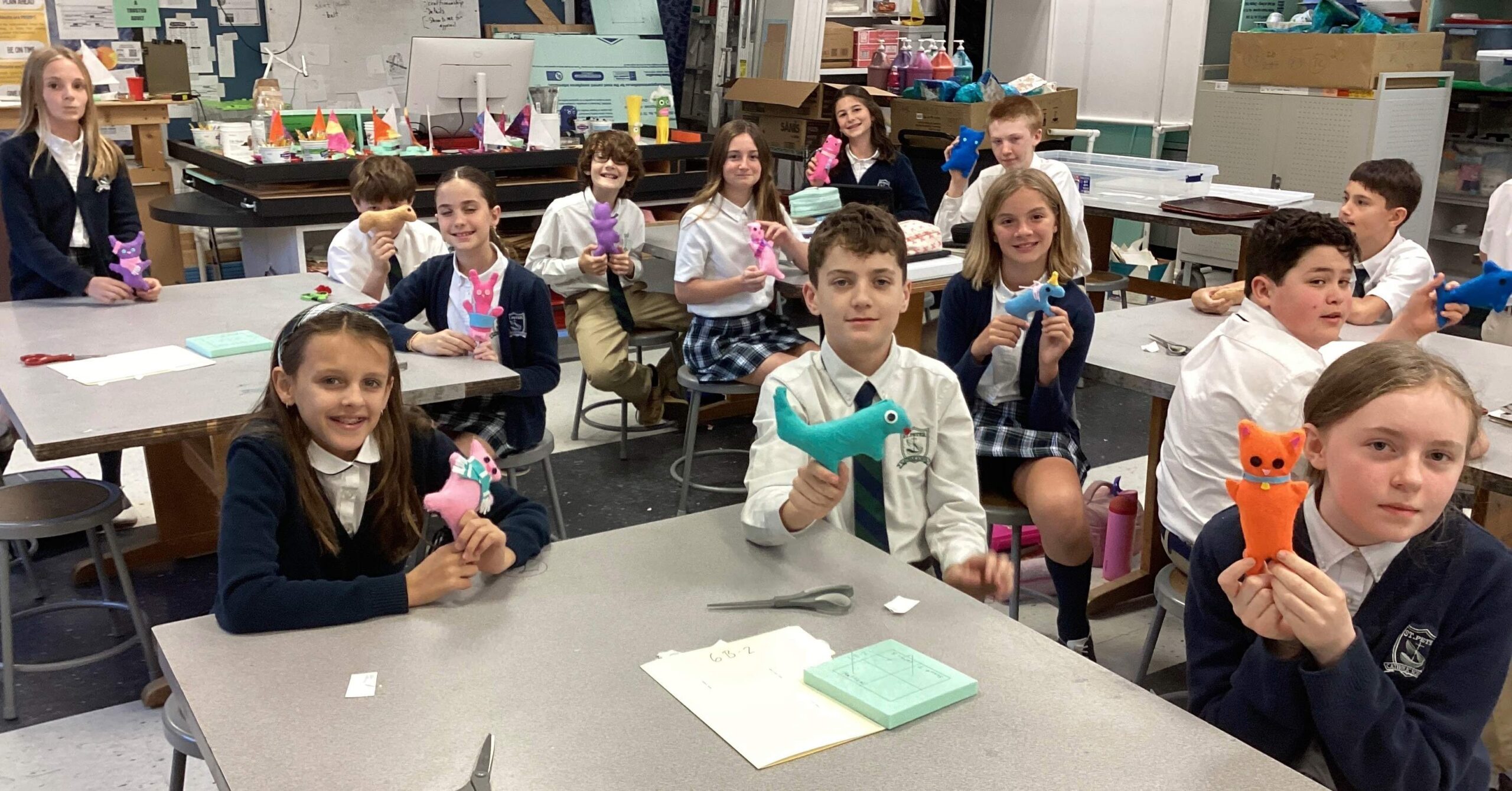 In Art Tech class, 6th graders have been designing and creating cloth sculptures.  They transferred their drawings to one side of a folded cloth and used the running stitch along the entire edge of the form, except for a pull-through hole.  After cutting outside of the stitching line, the main form of each pillow was turned inside-out and stuffed with poly-fill.  The whip stitch sealed the pillow form.  Students also learned to sew on buttons for eyes.  Other surface features have been made with carefully cut scraps of cloth and yarn that have been attached with glue or stitches.