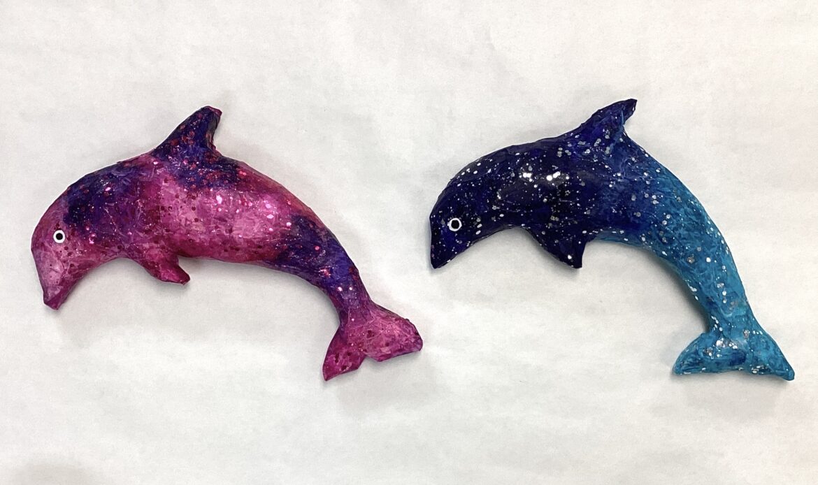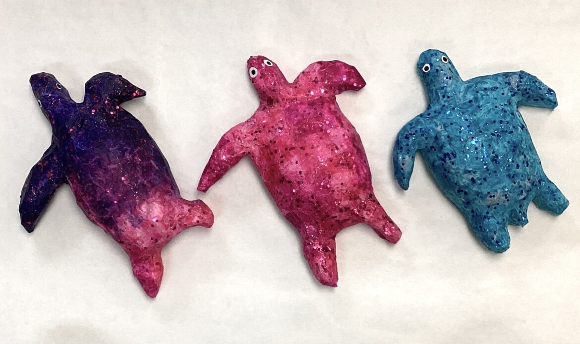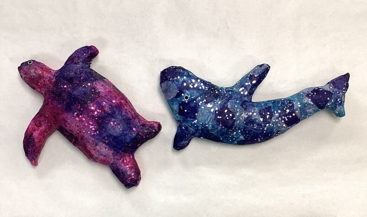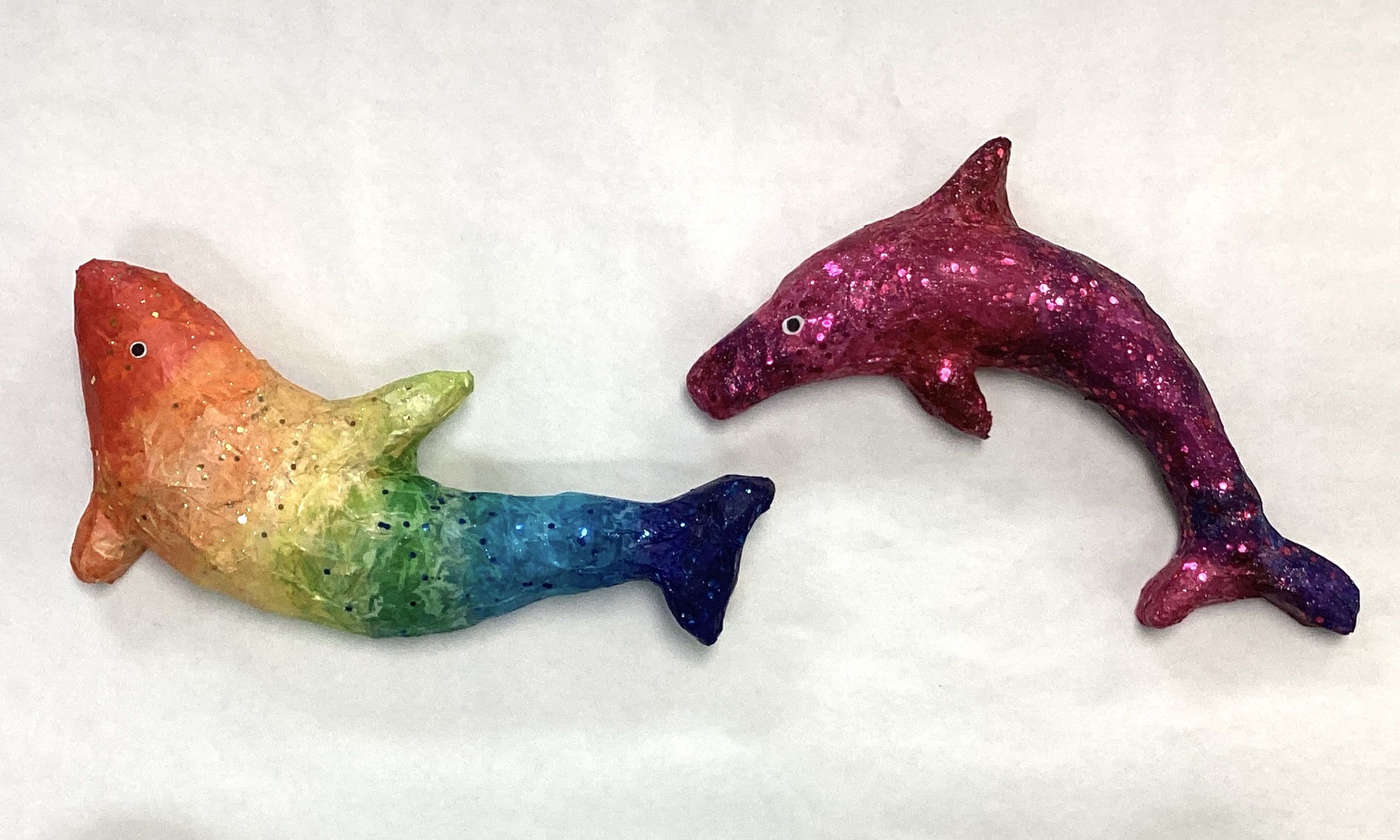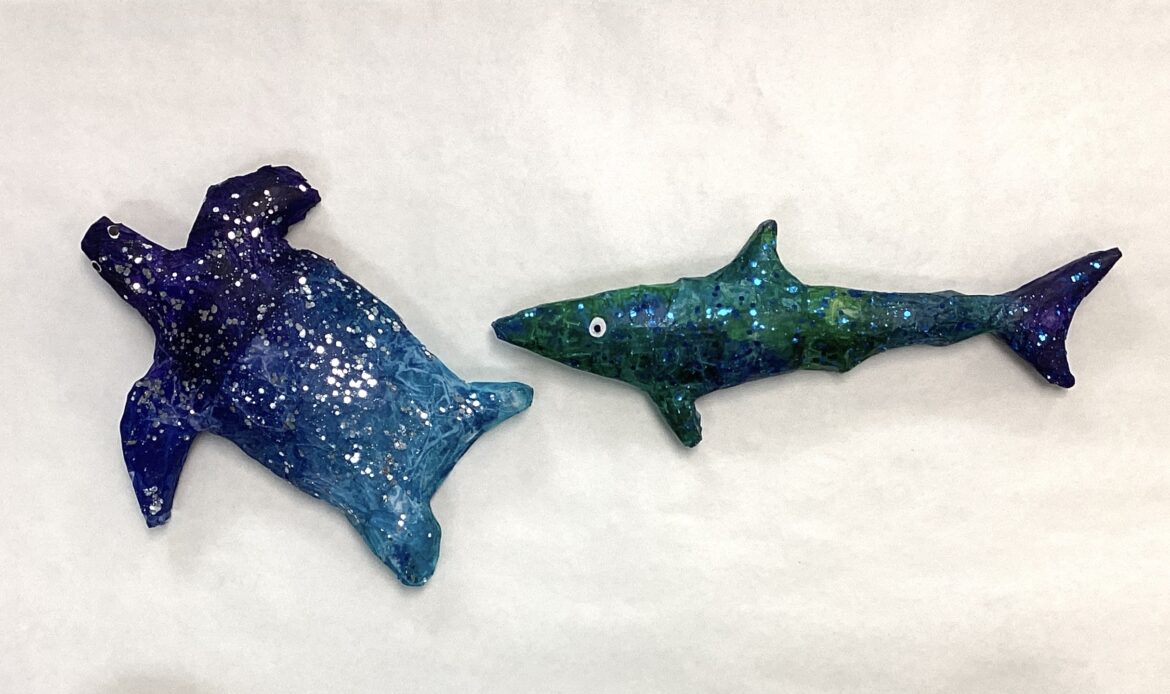Fifth grade art students have recently created relief sculptures of aquatic creatures. Students used the grid method to draw from photos of sea animals. They transferred their drawings to Styrofoam sheets and cut out their designs with saws. The volume of each animal form was built up on one side of the Styrofoam with paper and tape. Paper mache and glitter glue were applied as the skin.