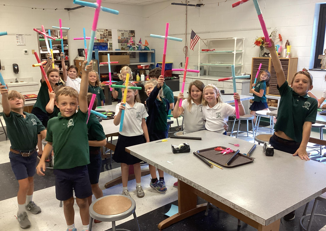Second grade art students are shown below near the end of a class during which they were finishing the construction and assembly of the basic cross shape of their paper, cardboard, and paper mache sculptures. Students will soon build support bases and create colorful tassels for the upper ends of the crosses. Second graders will carry these works into the church during the 8th grade All Saints Program later this year.